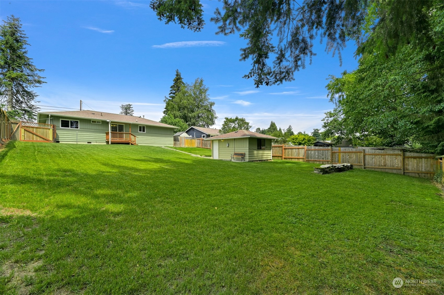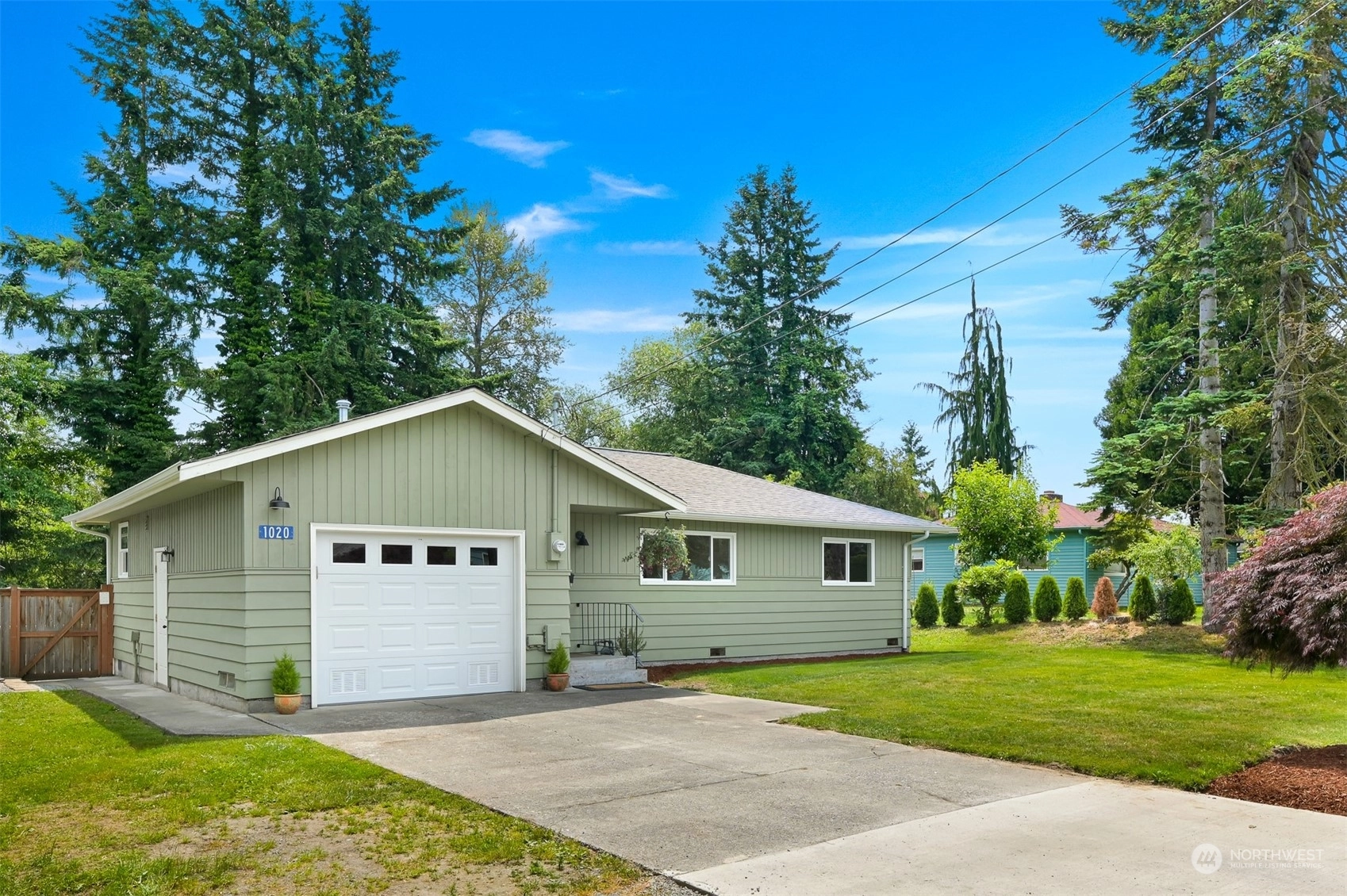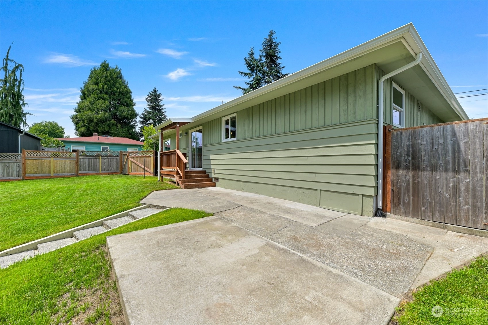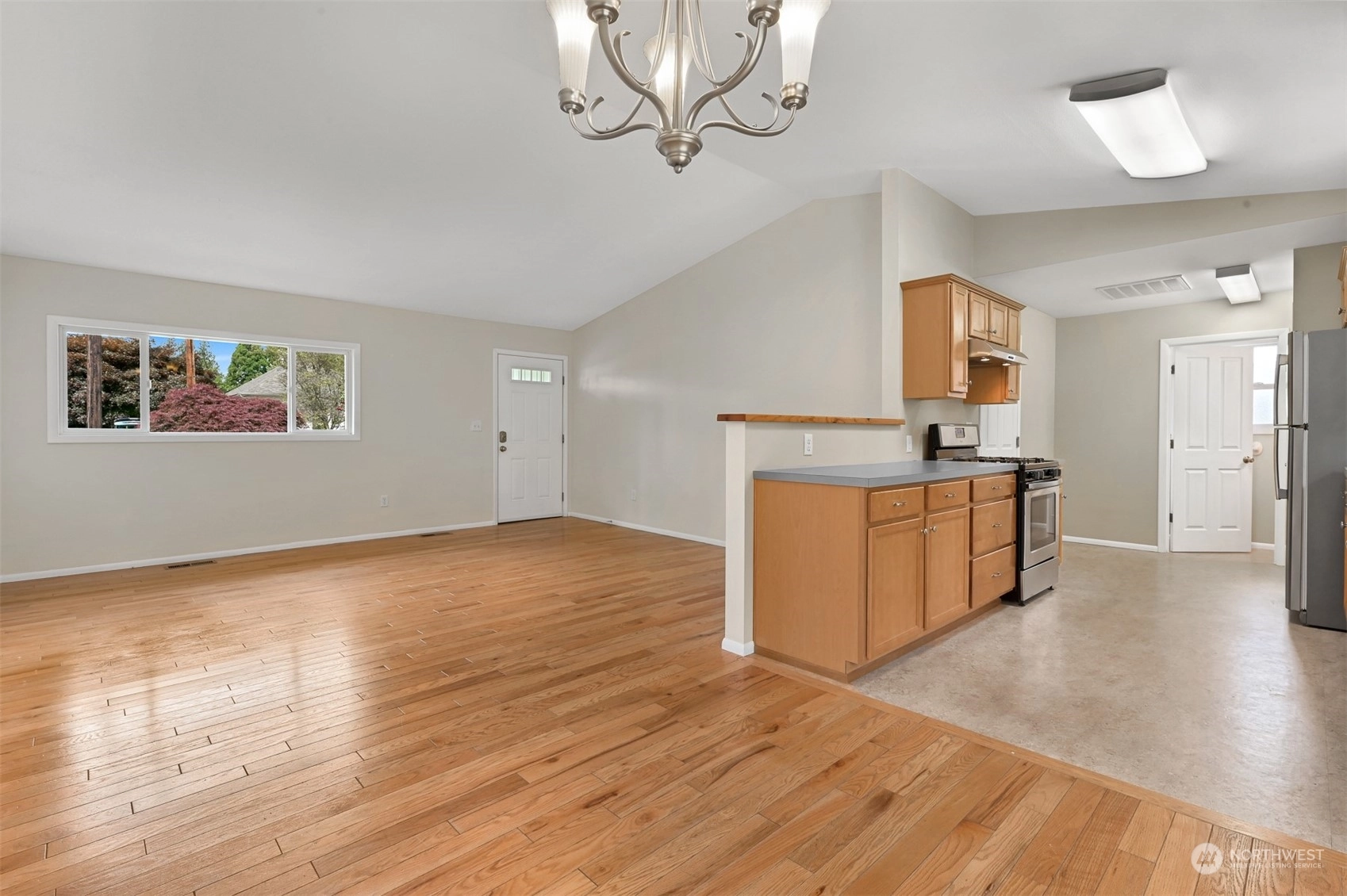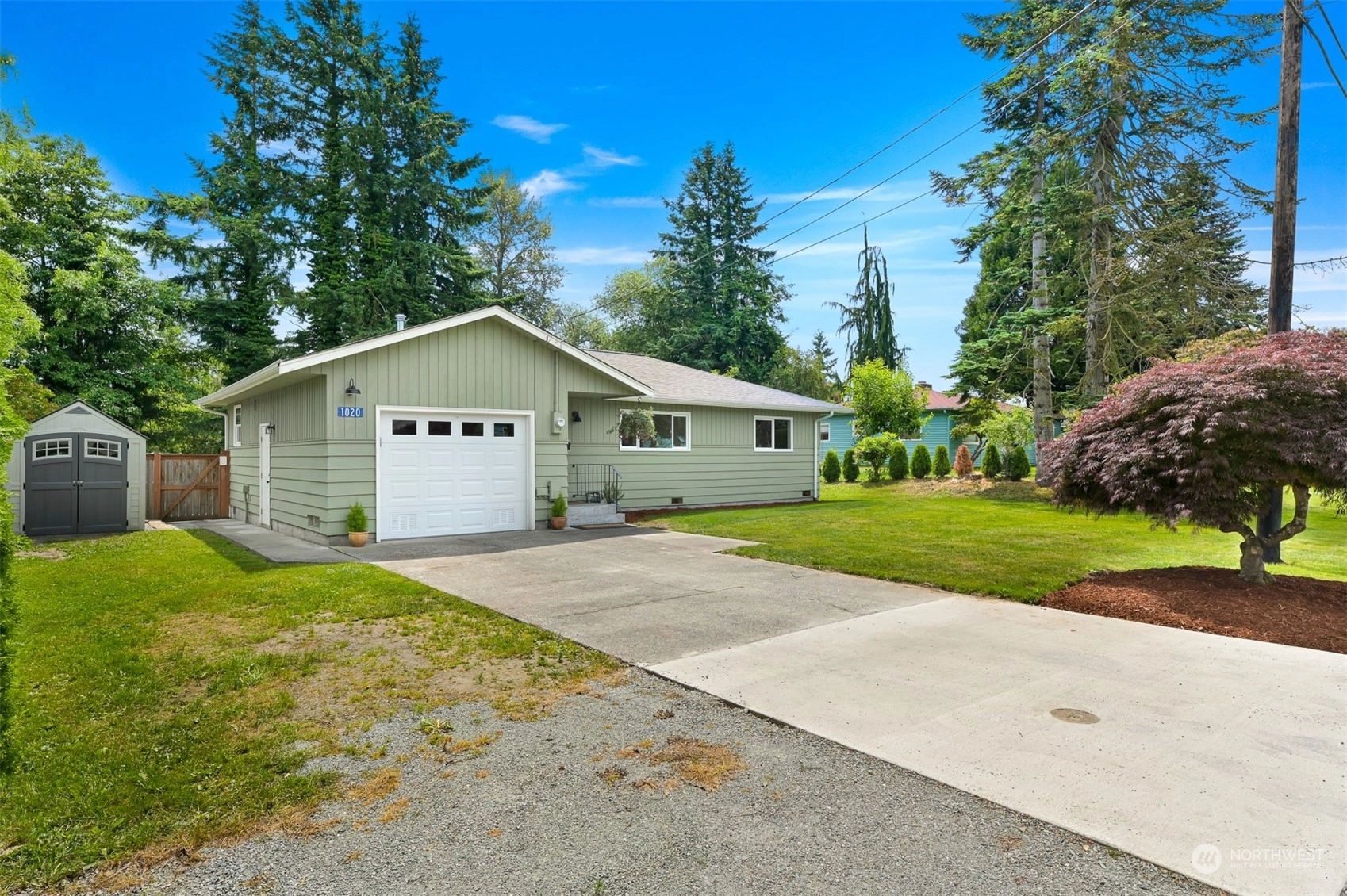 Centrally located Burlington rambler close to parks, schools & downtown! Whole home was completely remodeled in 2014 - roof, flooring, walls, mechanicals - newer everything! The home feels large w/ vaulted ceilings & engineered hardwood floors throughout. The open layout combination of living & dining room, kitchen opens up the heart of the home. Kitchen has plenty of cabinet storage, pantry, SS appliances, gas stovetop, w/ adjacent 1/2 bath & garage access. Washer/Dryer hookups in garage. Wet areas have low mntc Marmoleum flooring. Down the hall are 2 bedrooms w/ spacious closets+remodeled whole hallway bathrm. Surprise detached artist/music studio/multipurpose space in backyard! Home backs up to small creek & nature! Come & see this home!