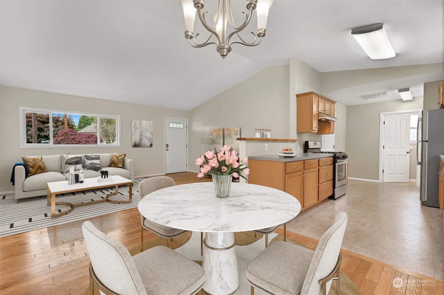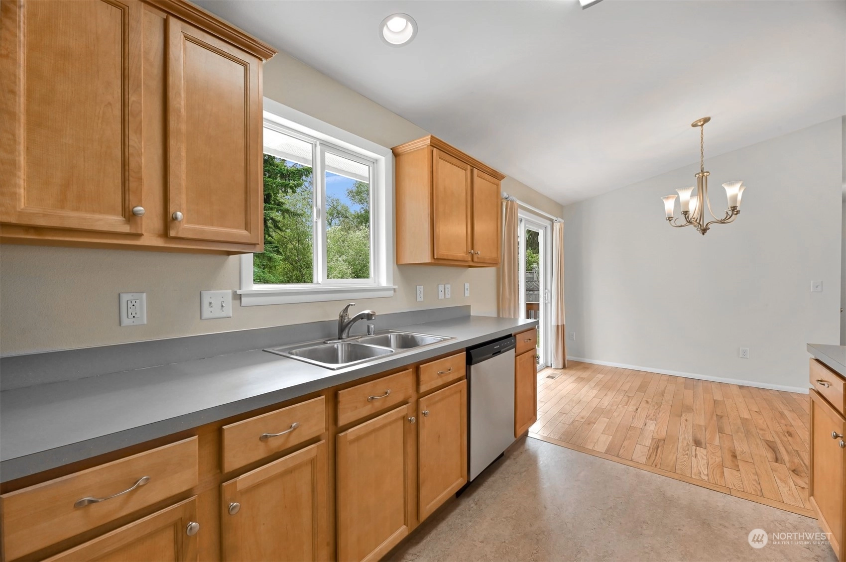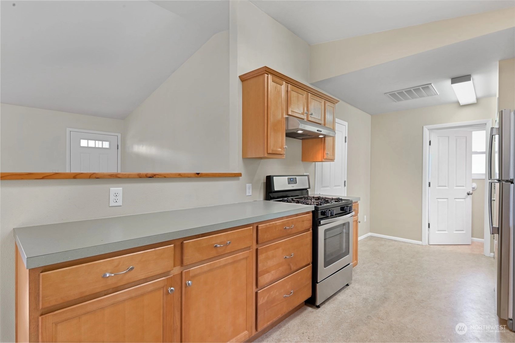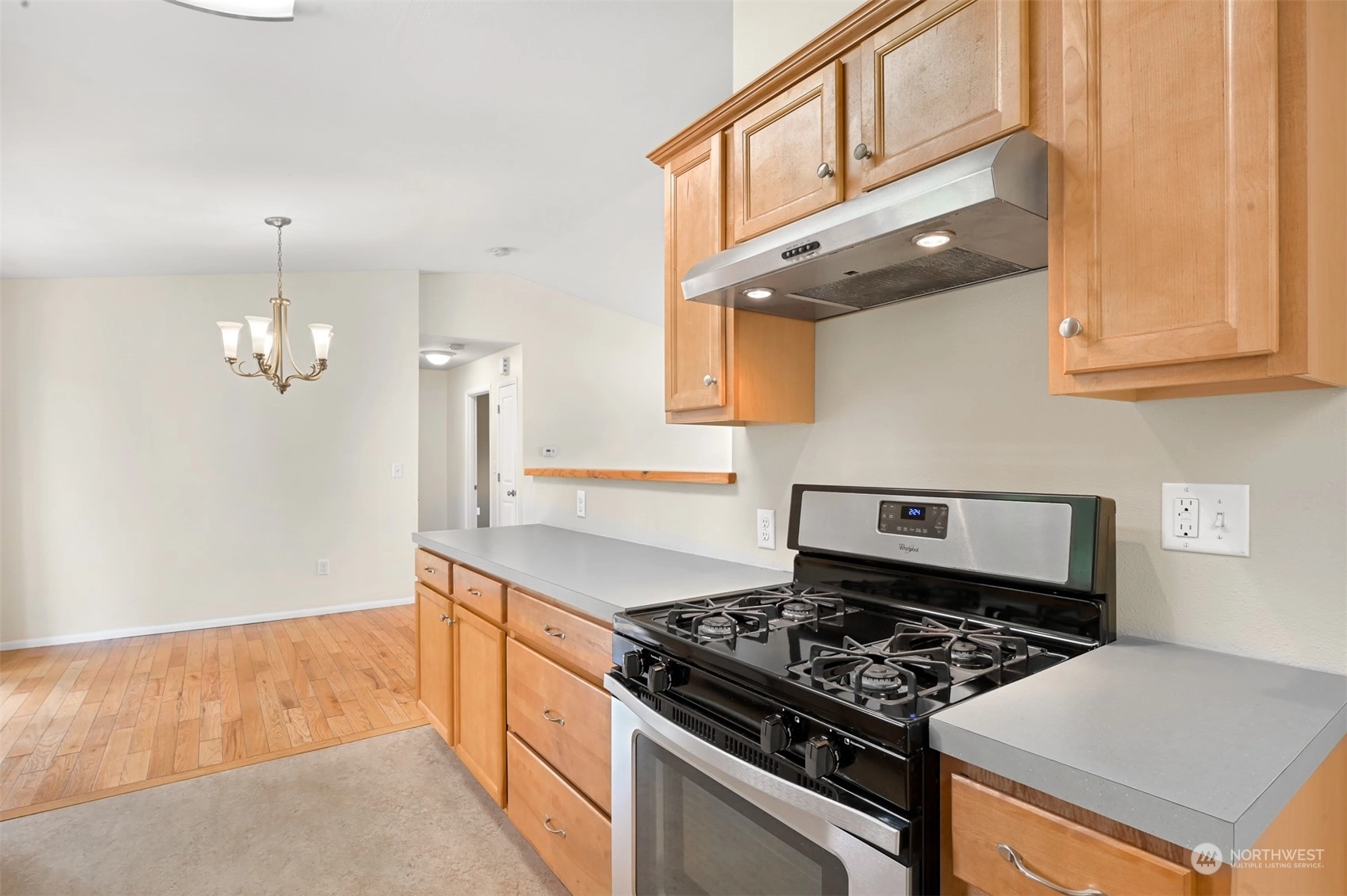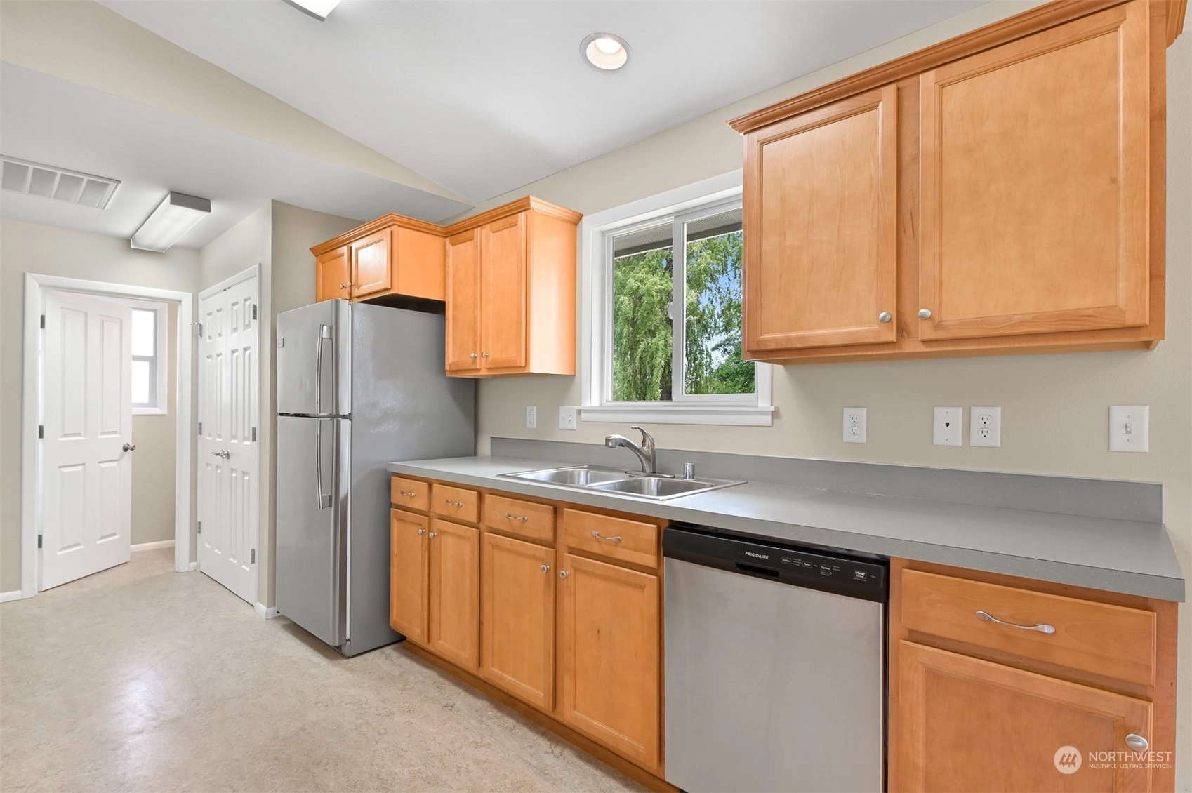 Centrally located Burlington rambler close to parks, schools & downtown! Whole home was completely remodeled in 2014 - roof, flooring, walls, mechanicals - newer everything! The home feels large w/ vaulted ceilings & engineered hardwood floors throughout. The open layout combination of living & dining room, kitchen opens up the heart of the home. Kitchen has plenty of cabinet storage, pantry, SS appliances, gas stovetop, w/ adjacent 1/2 bath & garage access. Washer/Dryer hookups in garage. Wet areas have low mntc Marmoleum flooring. Down the hall are 2 bedrooms w/ spacious closets+remodeled whole hallway bathrm. Surprise detached artist/music studio/multipurpose space in backyard! Home backs up to small creek & nature! Come & see this home!