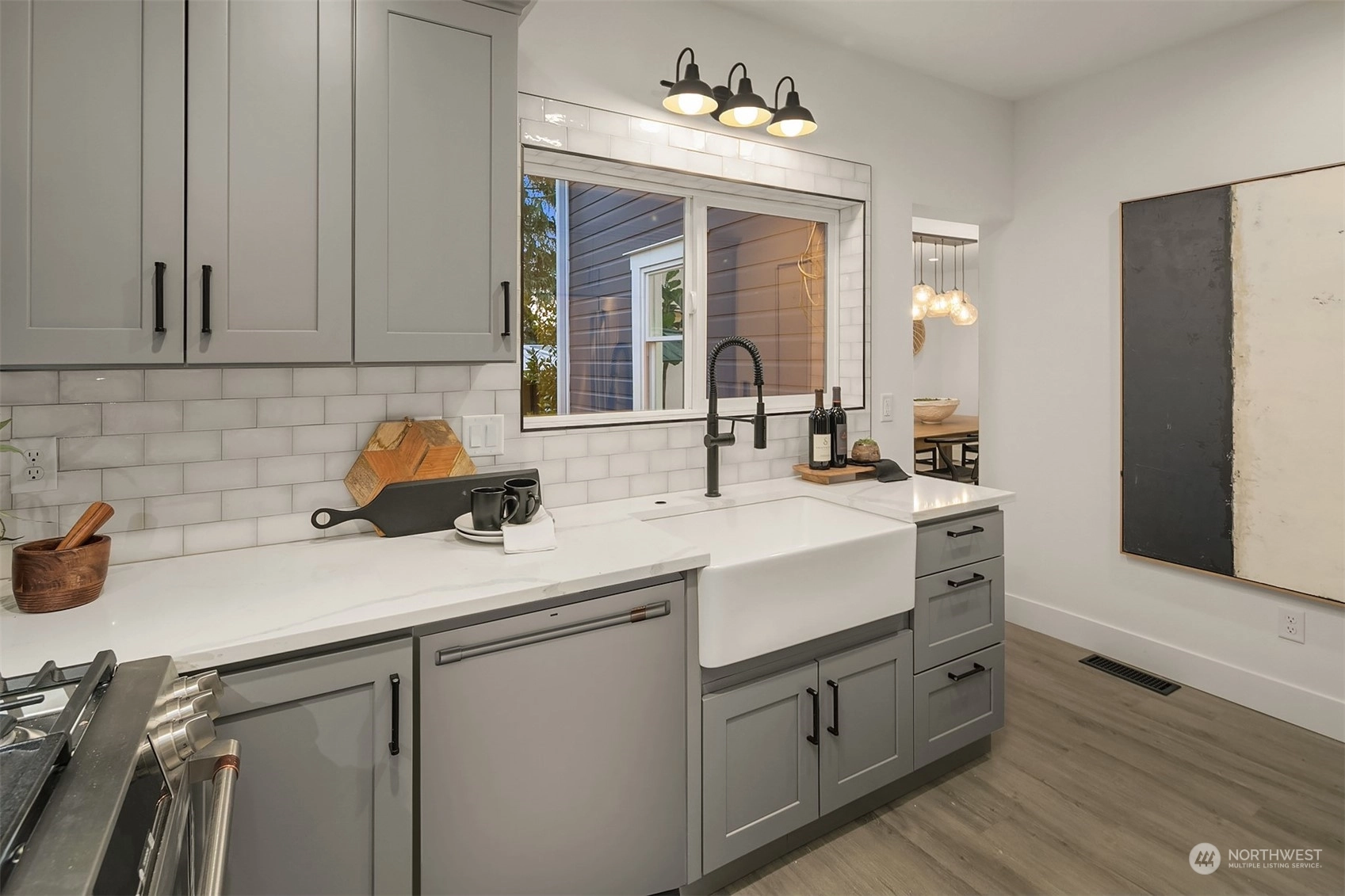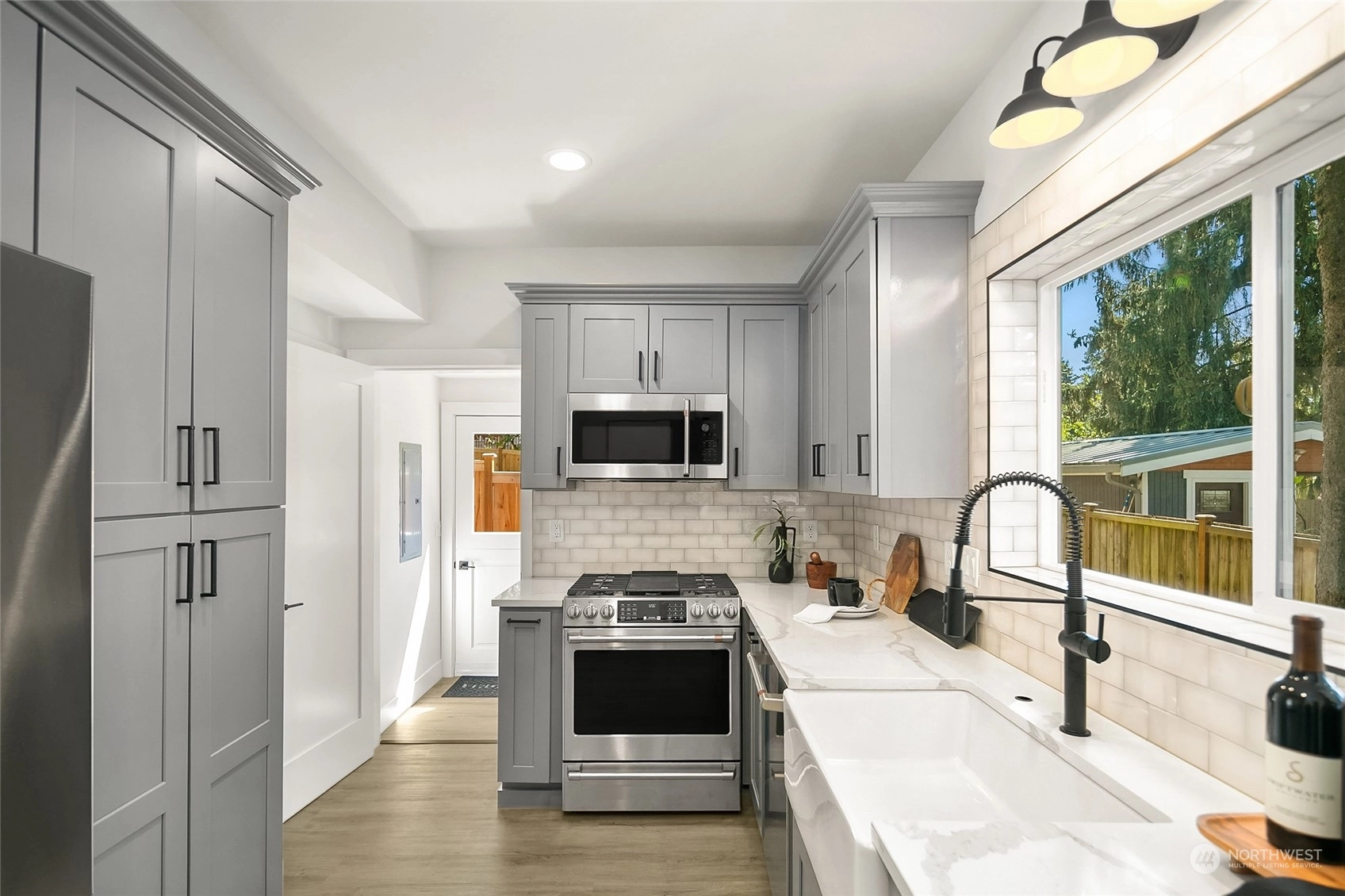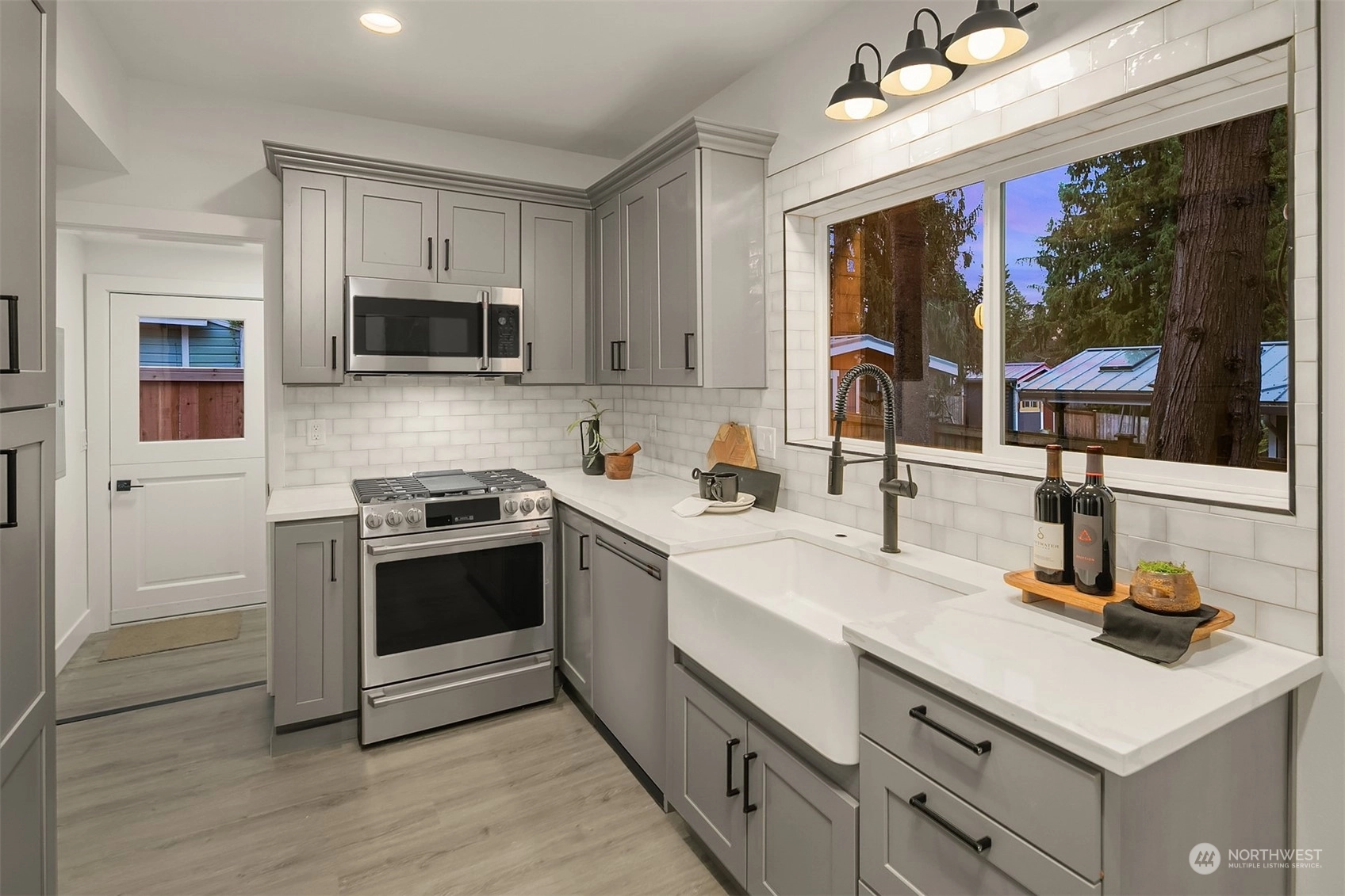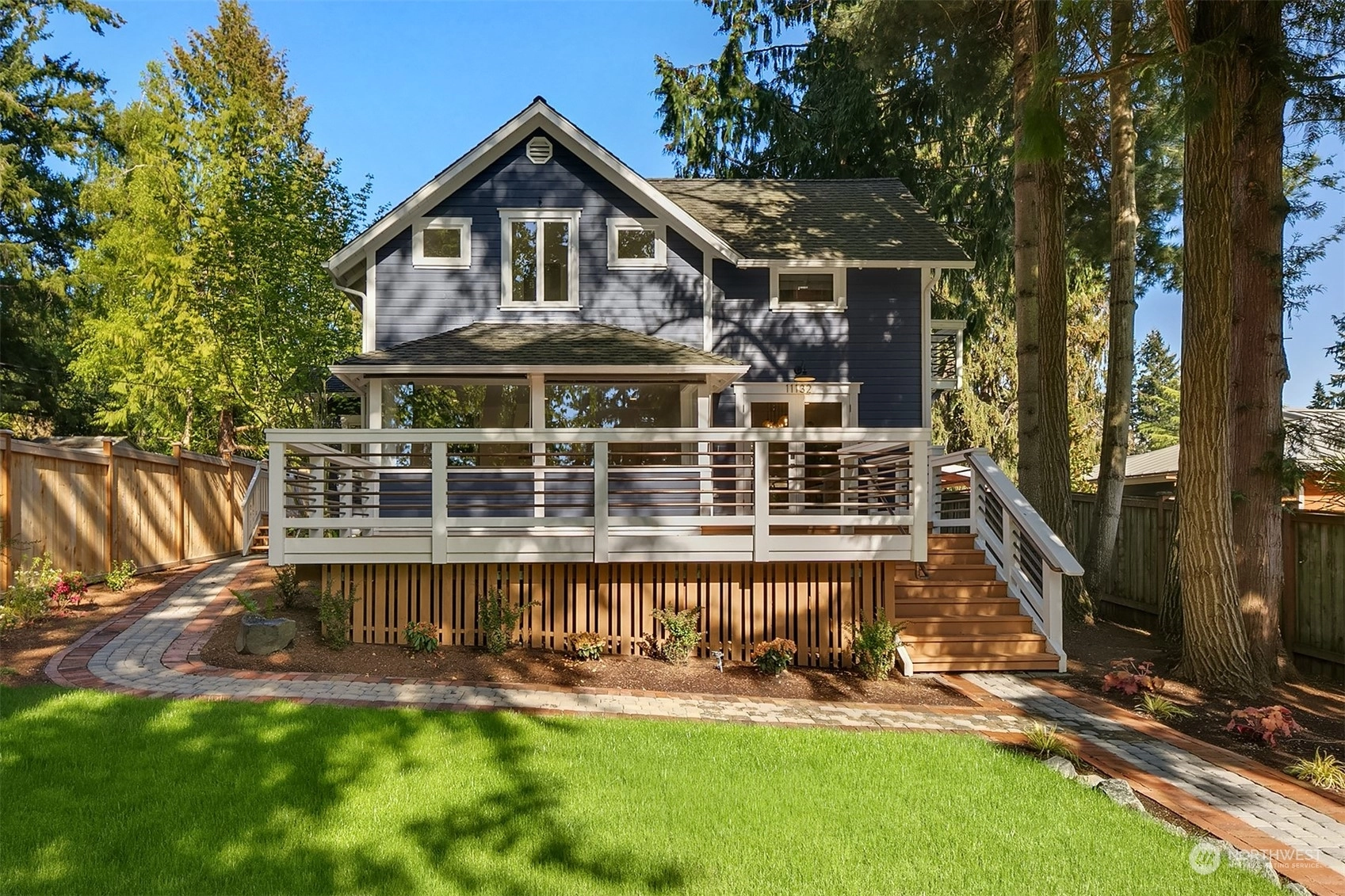 Professionally Remodeled Craftsman Single-Family Home in Quiet Forbes Creek Community & Lake WA School District. Minutes to DT Kirkland & Juanita Beach. Wall-to-wall windows offer ample natural light in spacious yet cozy living rm w gas fireplace. Dining rm opens thru french doors to expansive front deck for entertaining. Farmhouse style kitchen w ALL NEW GE Cafe appliances, cabinets & quartz countertops. Hand-selected fixtures & new tile, carpet & hardwoods thru-out. Upper floor offers full bath w heated floors, 2 bdrms & balcony. All new underground electrical & plumbing, new sewer line, new furnace & water heater. New fence frames beautifully landscaped yard & garden. 400 SF basement for ample storage.