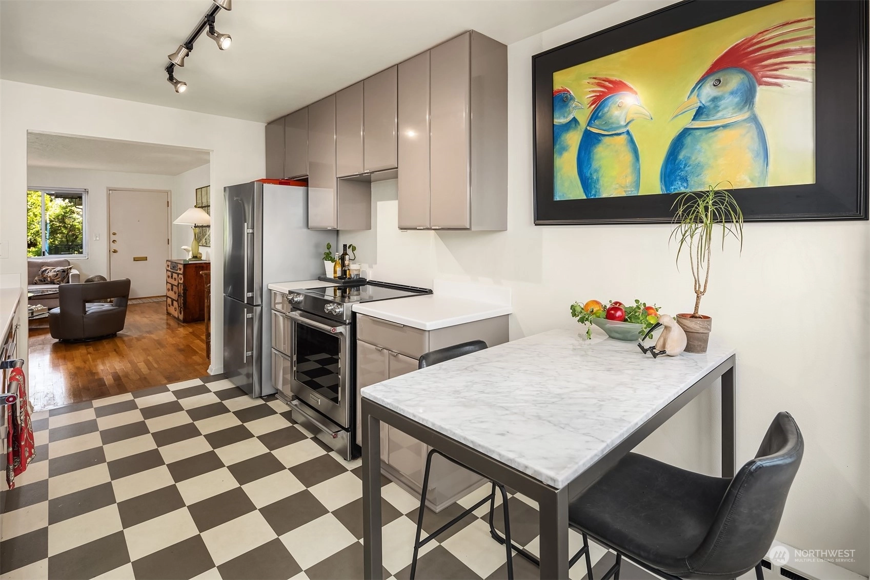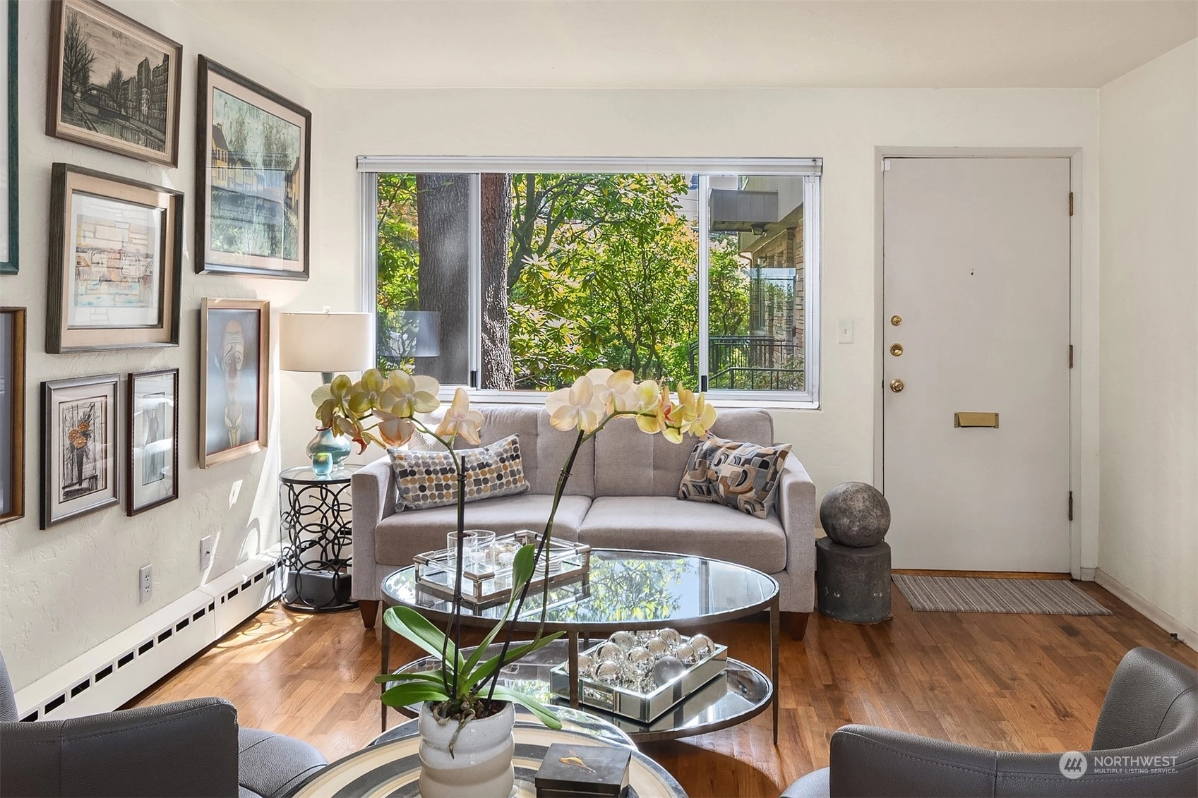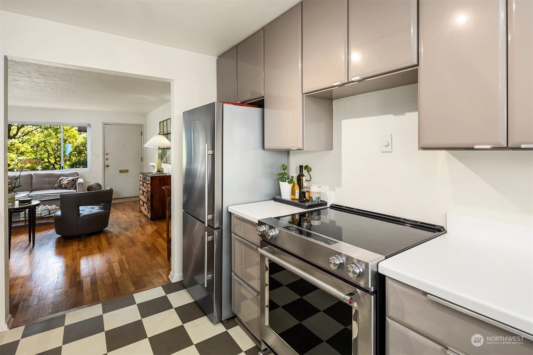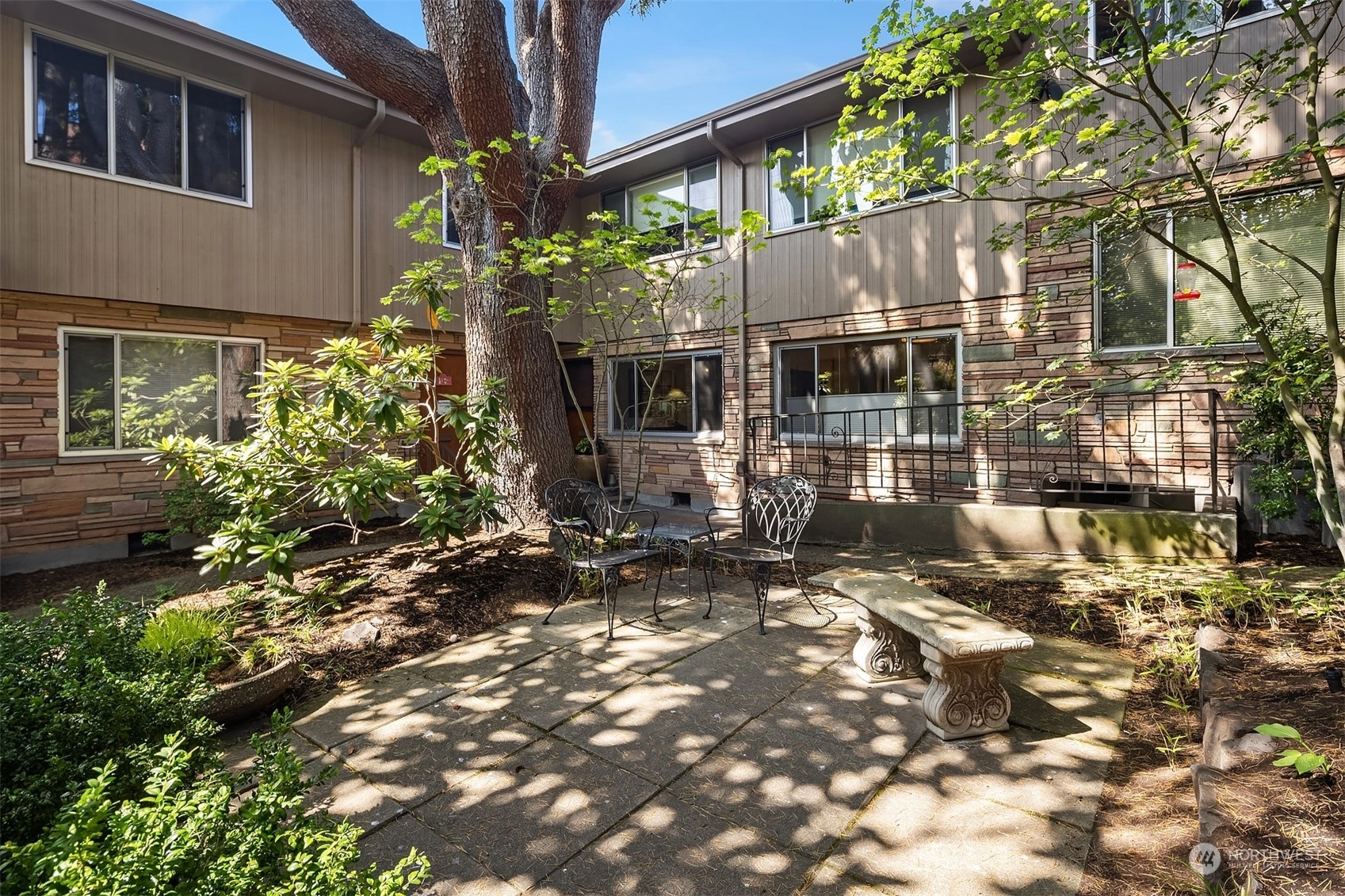 Unique Lower Queen Anne 2 bed/1 bath condo that lives like a house. Walk through the inviting garden courtyard to enter your new home. A mix of classic design & updated convenience. The remodeled kitchen has abundant storage. The flooring, appliances, countertops and cabinets have a crisp new look. The bathroom has also been updated! Both bedrooms are large w/plenty of space to make them your own. The 2nd bedroom has a hook up for a washer/dryer. Pet friendly! Well run HOA building recently painted. Close to Seattle Center, Climate Pledge, restaurants, & shopping. Host a gathering & go to Kracken game or concert w/friends. Parking is a snap w/your own private garage. As a bonus there is city permit st. parking for you and your guest.