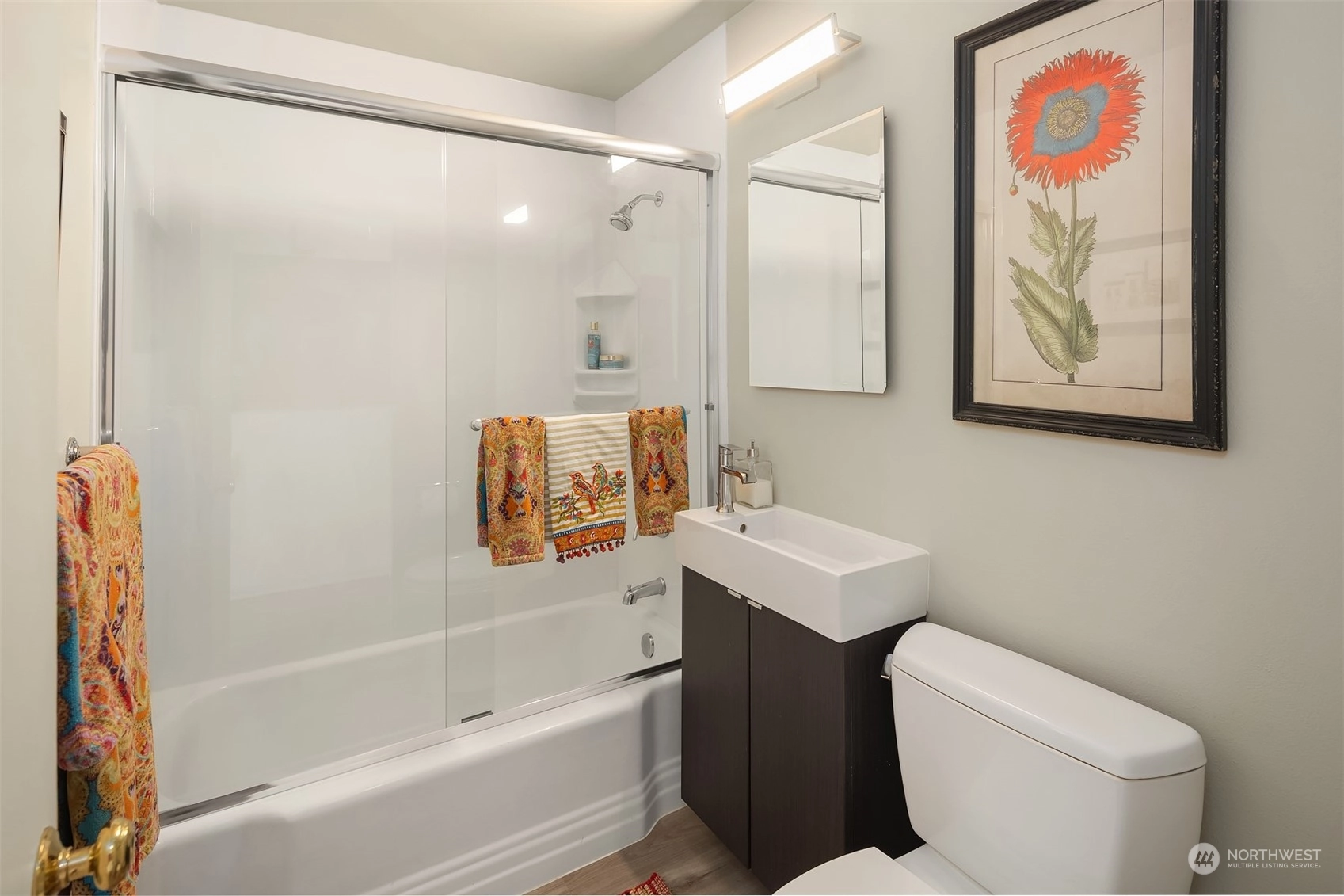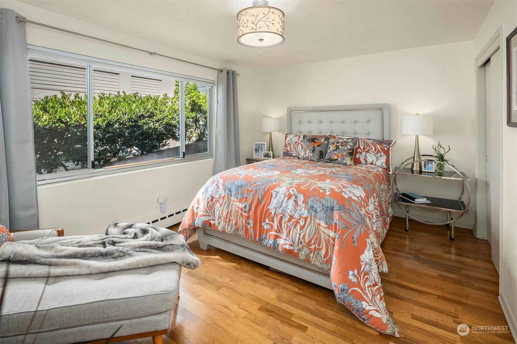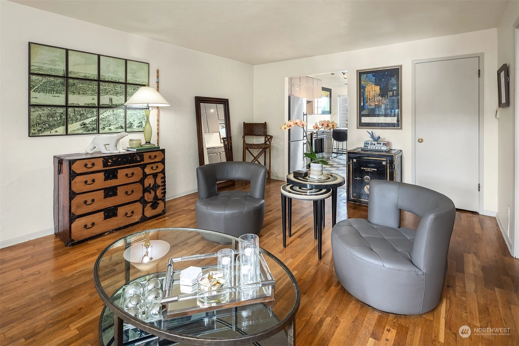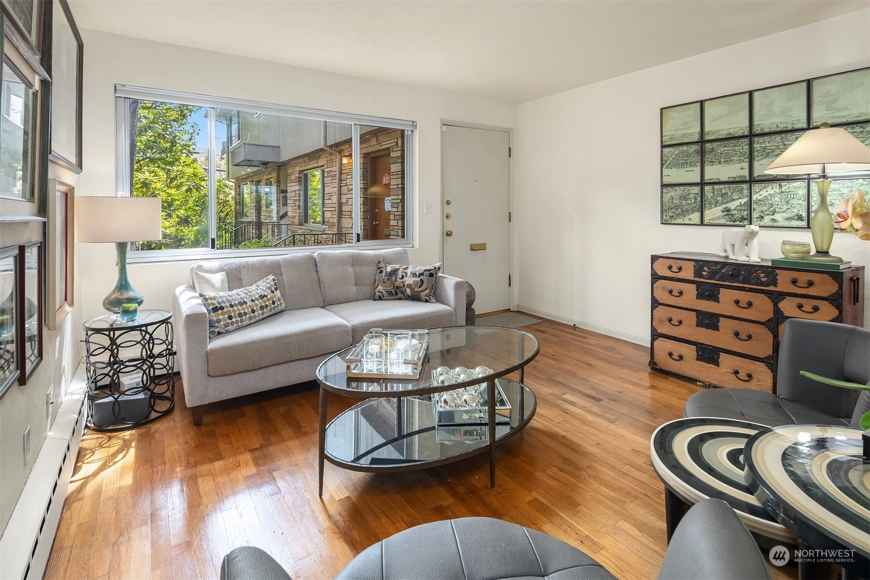 Unique Lower Queen Anne 2 bed/1 bath condo that lives like a house. Walk through the inviting garden courtyard to enter your new home. A mix of classic design & updated convenience. The remodeled kitchen has abundant storage. The flooring, appliances, countertops and cabinets have a crisp new look. The bathroom has also been updated! Both bedrooms are large w/plenty of space to make them your own. The 2nd bedroom has a hook up for a washer/dryer. Pet friendly! Well run HOA building recently painted. Close to Seattle Center, Climate Pledge, restaurants, & shopping. Host a gathering & go to Kracken game or concert w/friends. Parking is a snap w/your own private garage. As a bonus there is city permit st. parking for you and your guest.