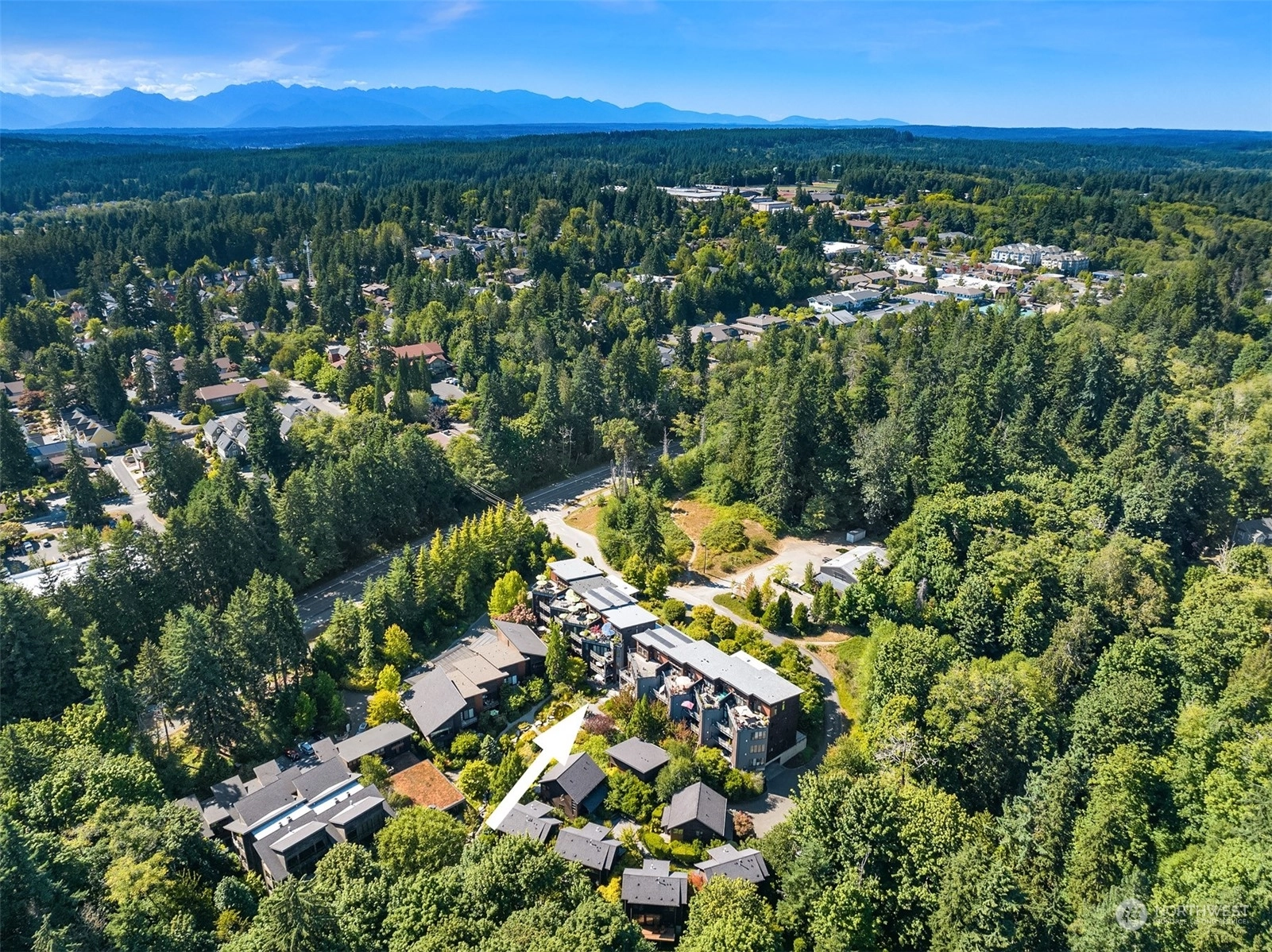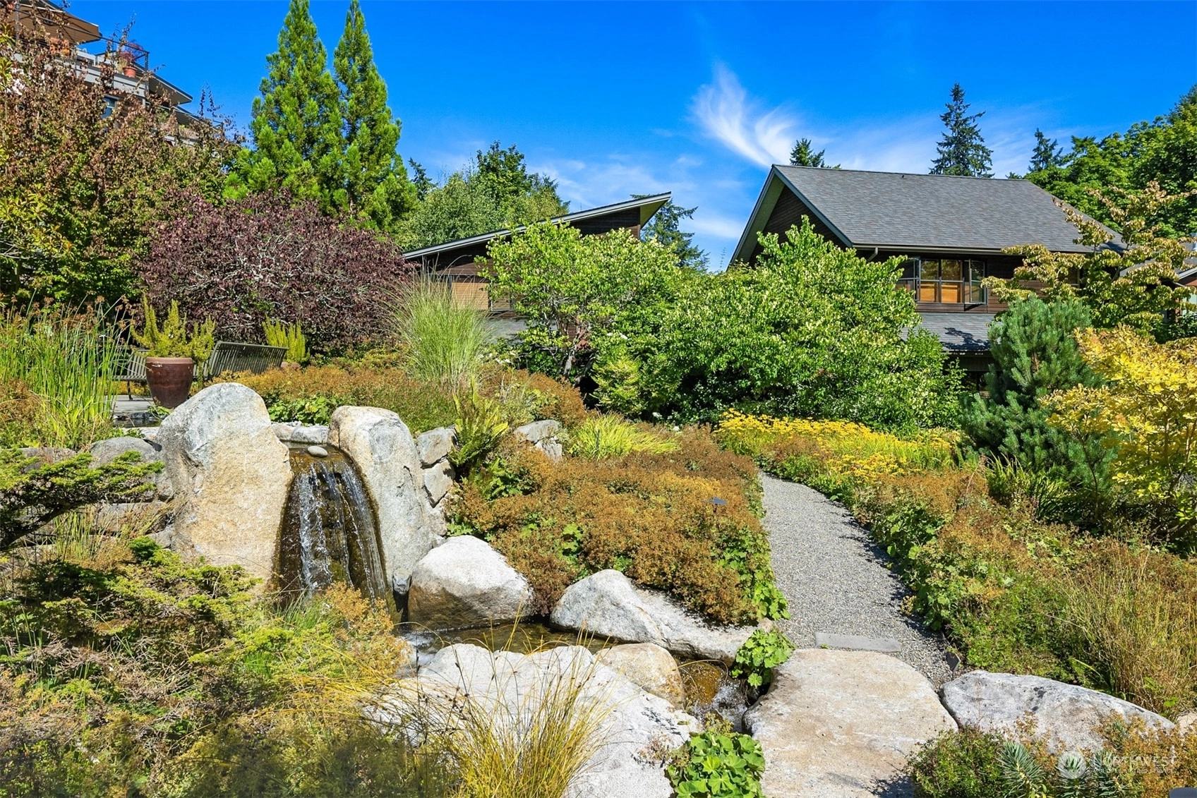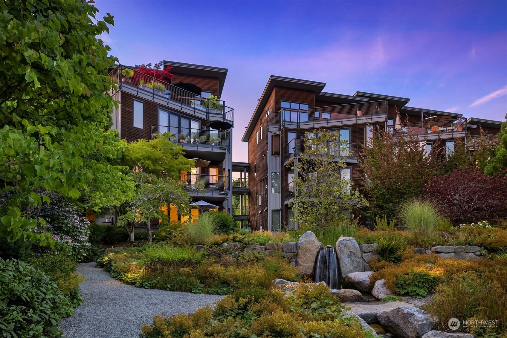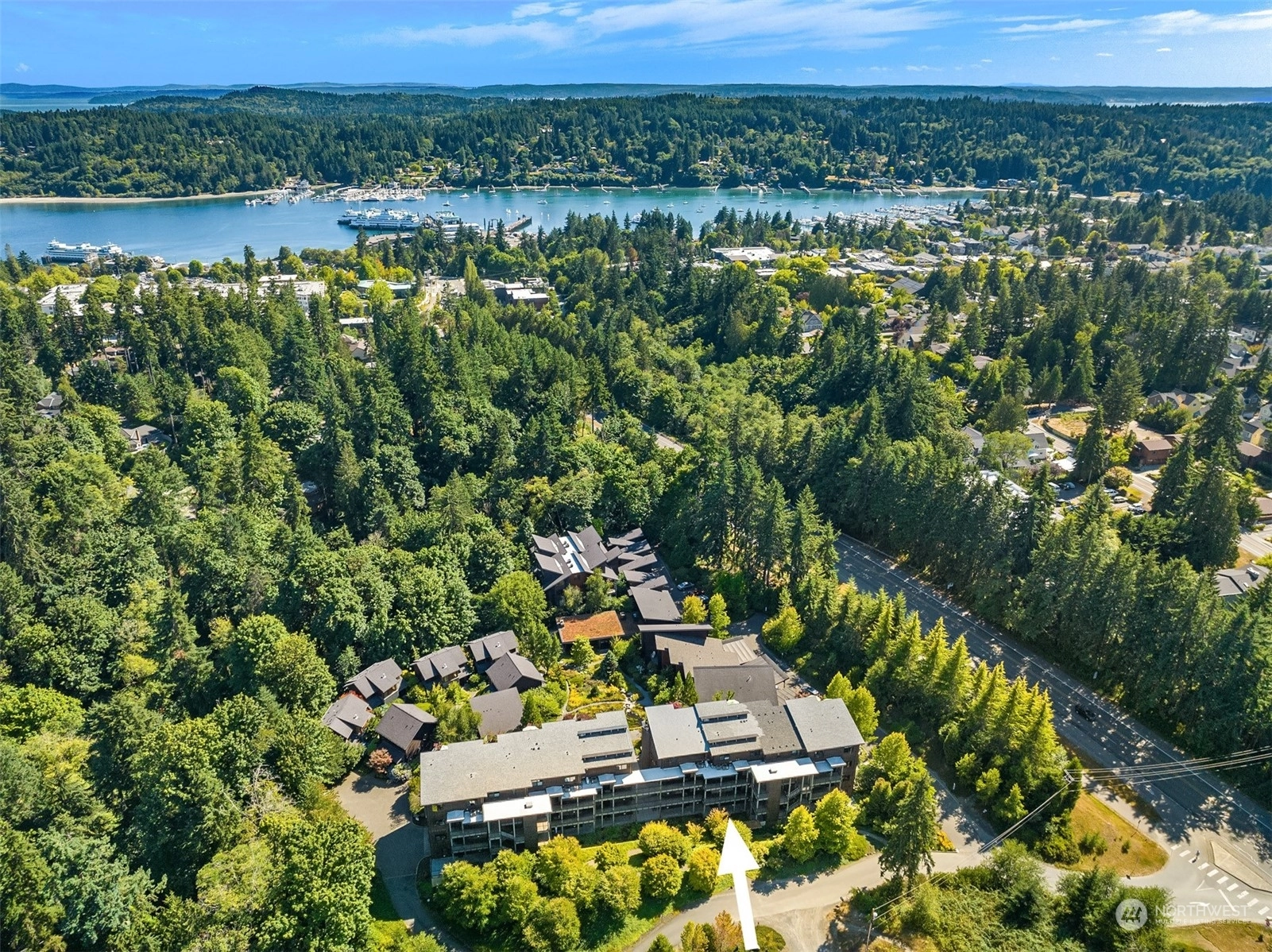 The perfect one level home in the desirable Vineyards community, just a short walk to the ferry or picturesque downtown Winslow. This ideal condo offers a sublime view of the lush courtyard and pond from inside or on the patio. Southern exposure with walls of windows make this home light and bright all year. The 9' ceilings and open floorplan enlarge the space. Well appointed kitchen and baths complete this turn key transition. Easy elevatored access from the garage to your front door, absolutely no stairs! 36" doorways make it accessible from a walker or wheelchair, with grab bars in both bathrooms. Community Fireside room can accommodate any large gathering. Enjoy the paths throughout the beautiful gardens & common wooded areas.