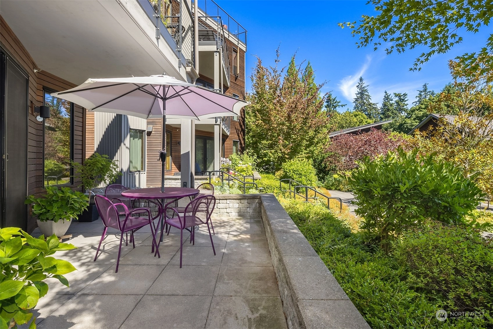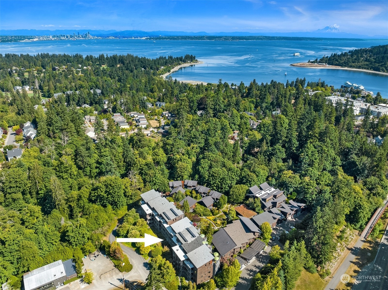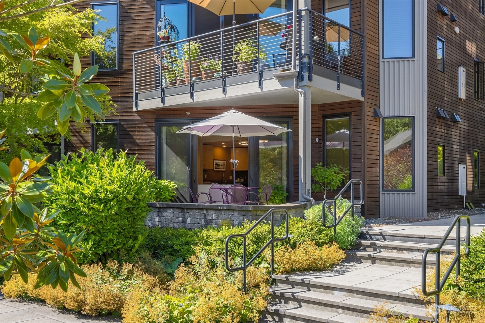 The perfect one level home in the desirable Vineyards community, just a short walk to the ferry or picturesque downtown Winslow. This ideal condo offers a sublime view of the lush courtyard and pond from inside or on the patio. Southern exposure with walls of windows make this home light and bright all year. The 9' ceilings and open floorplan enlarge the space. Well appointed kitchen and baths complete this turn key transition. Easy elevatored access from the garage to your front door, absolutely no stairs! 36" doorways make it accessible from a walker or wheelchair, with grab bars in both bathrooms. Community Fireside room can accommodate any large gathering. Enjoy the paths throughout the beautiful gardens & common wooded areas.