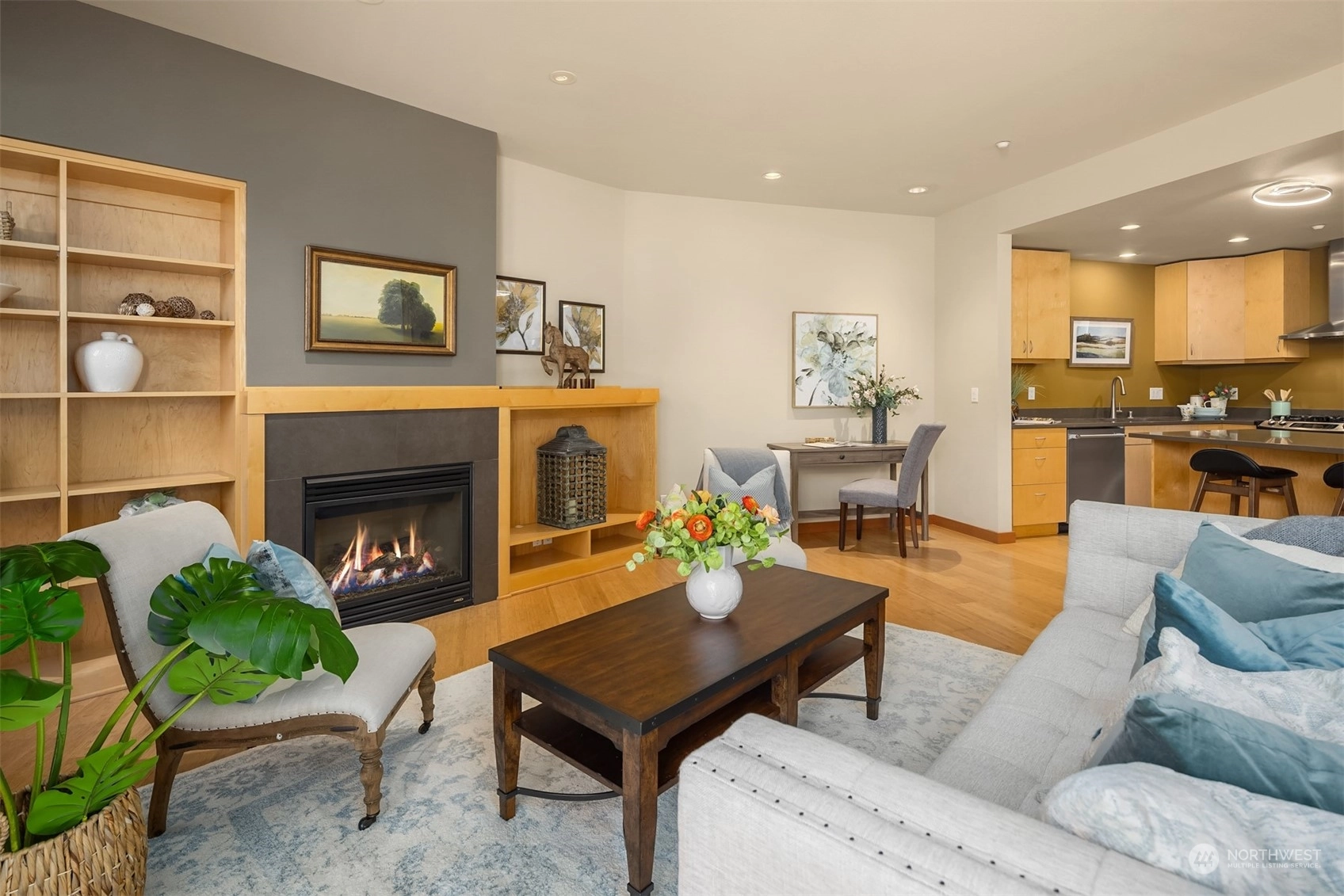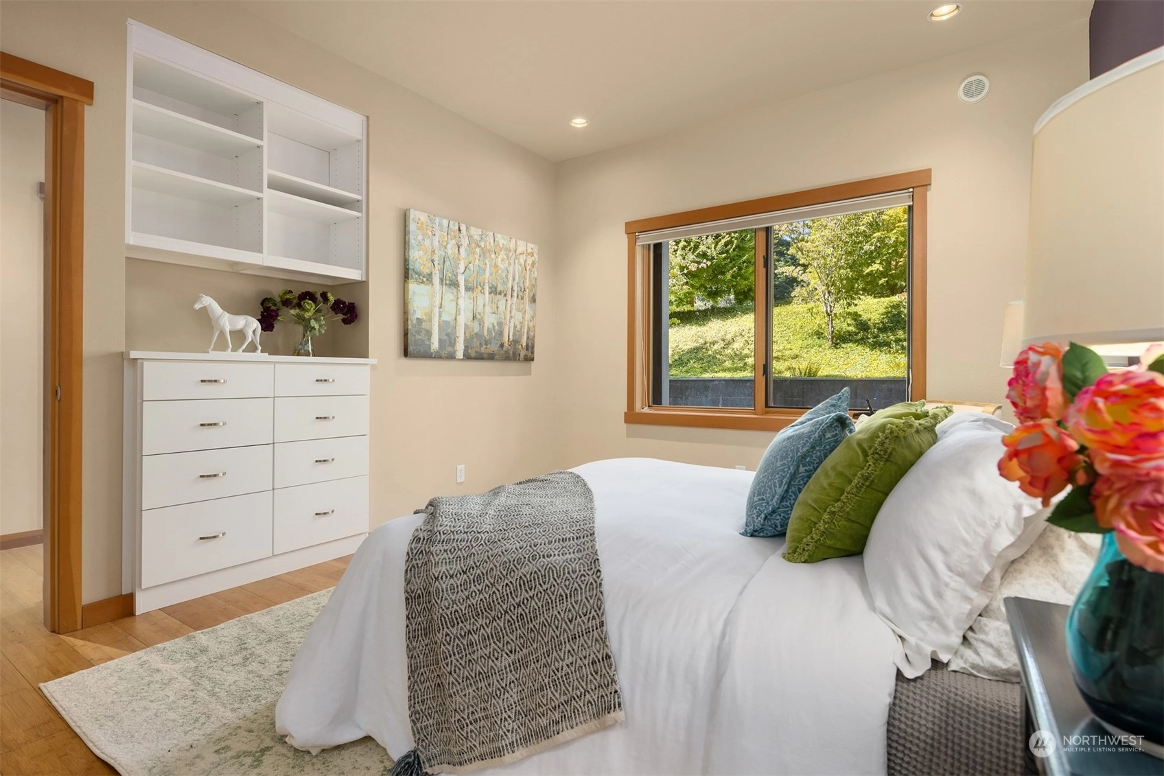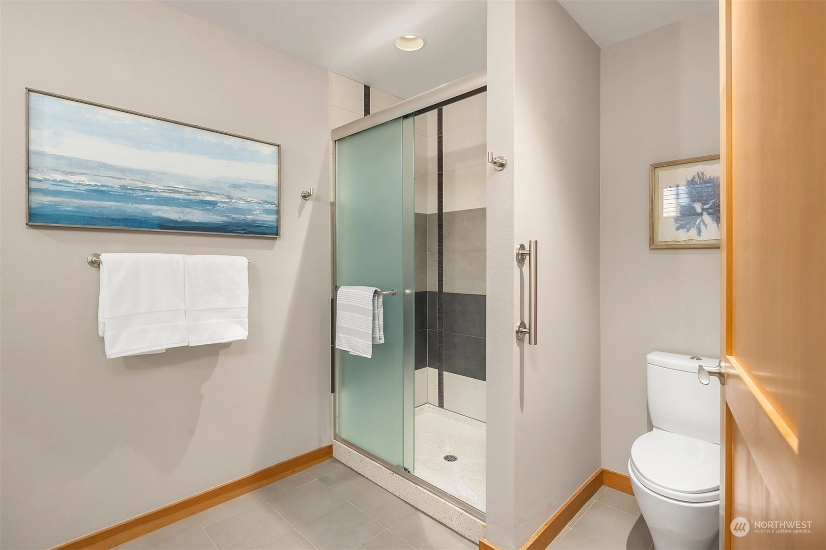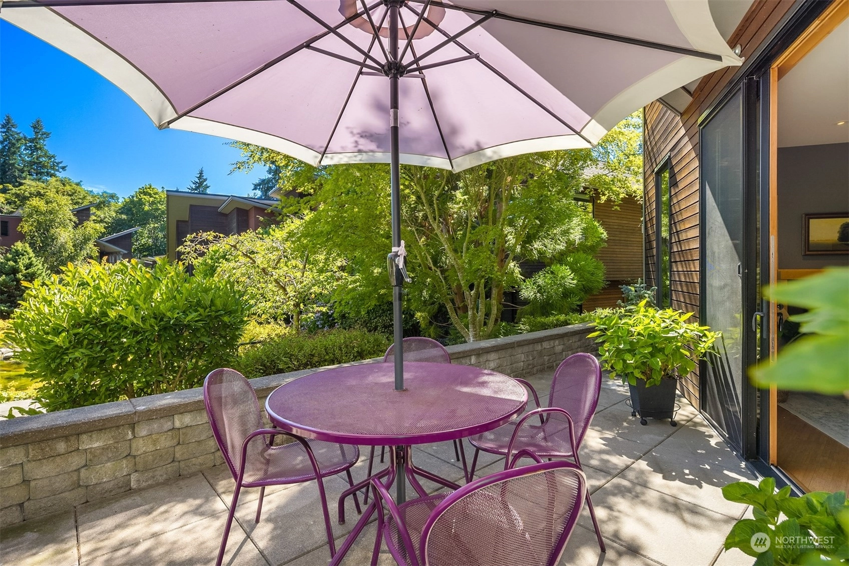 The perfect one level home in the desirable Vineyards community, just a short walk to the ferry or picturesque downtown Winslow. This ideal condo offers a sublime view of the lush courtyard and pond from inside or on the patio. Southern exposure with walls of windows make this home light and bright all year. The 9' ceilings and open floorplan enlarge the space. Well appointed kitchen and baths complete this turn key transition. Easy elevatored access from the garage to your front door, absolutely no stairs! 36" doorways make it accessible from a walker or wheelchair, with grab bars in both bathrooms. Community Fireside room can accommodate any large gathering. Enjoy the paths throughout the beautiful gardens & common wooded areas.