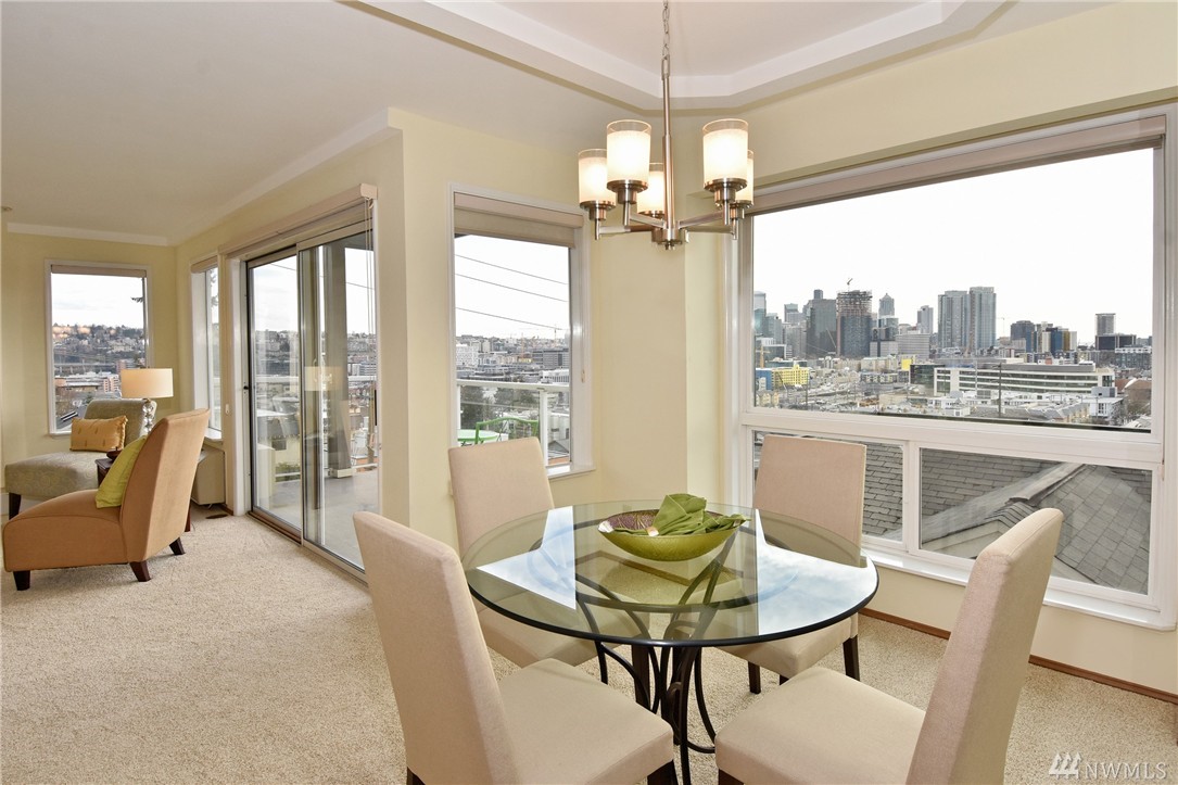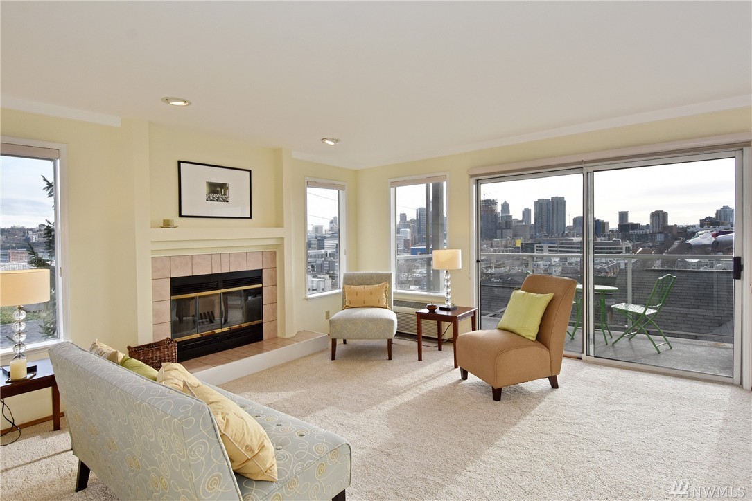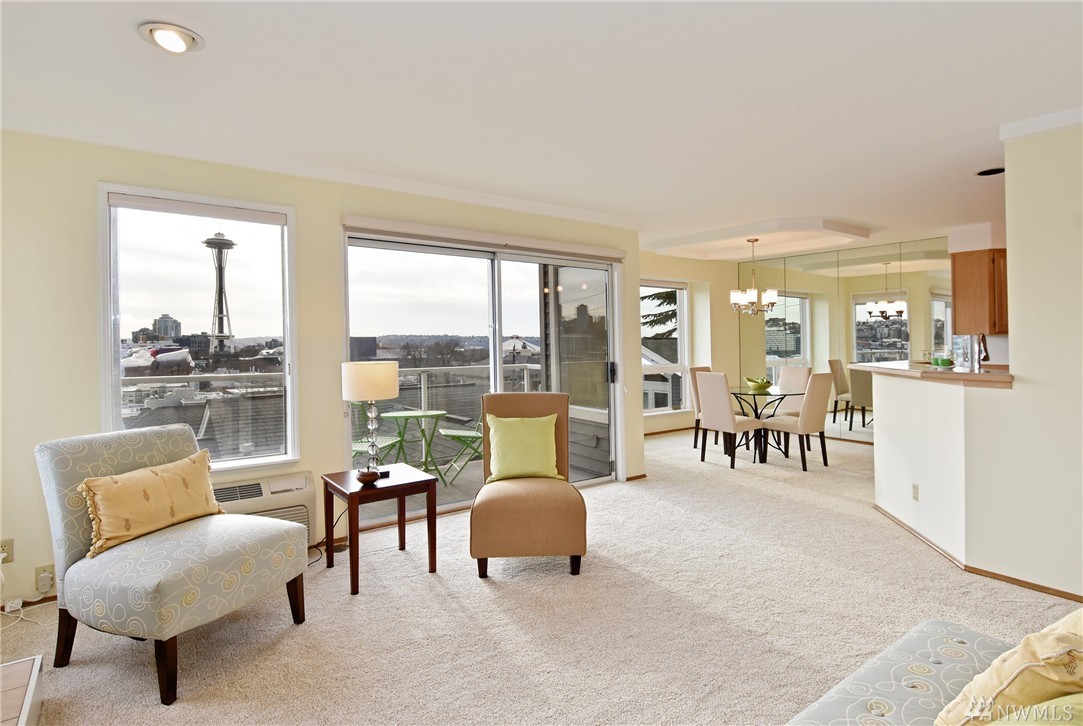 Sweeping views of the City, Seattle Center & Capitol Hill from this one owner home. Watch the fireworks from you deck! Welcoming lobby for owners & guests. Walls of windows with a view from every room. New paint, carpet, bathroom vinyl & some new light fixtures. New stainless kitchen appliances including a wine cooler. Large master suite with walk-in closet. Electric heat pump with air conditioning in living room. Walking distance to Seattle Center, Gates Foundation & Amazon.