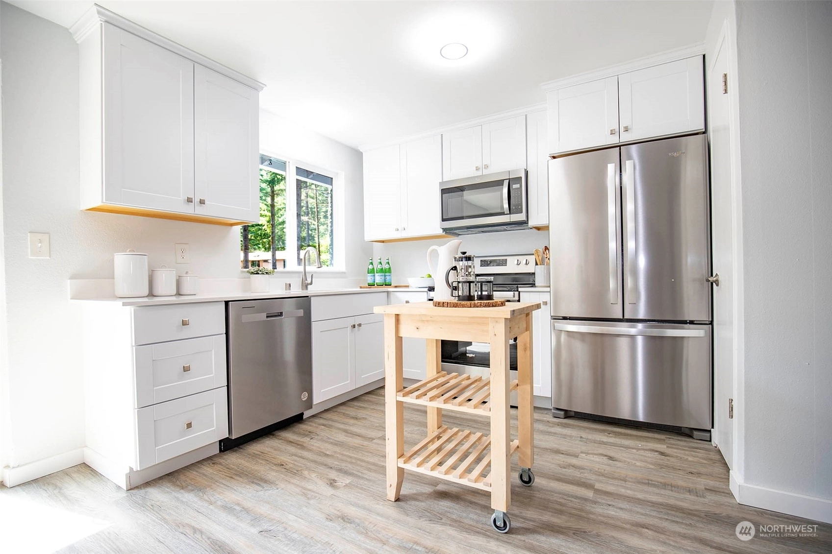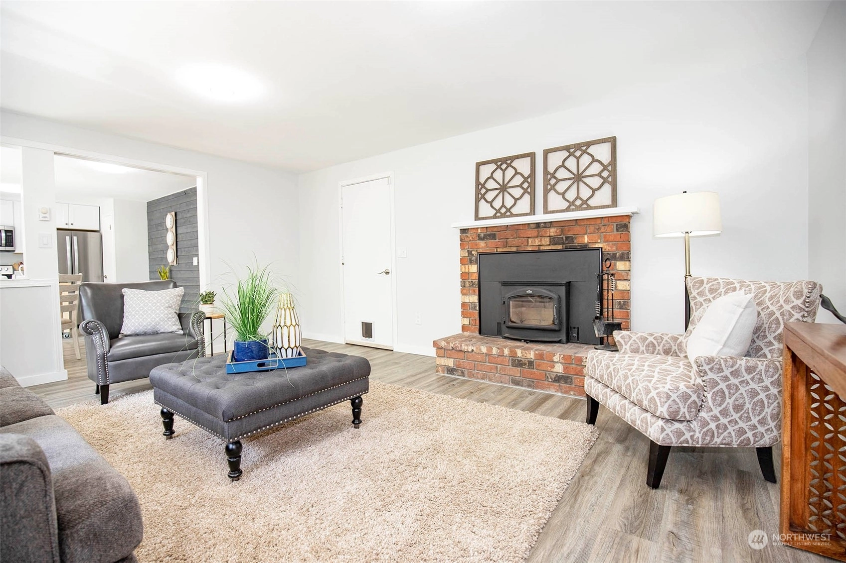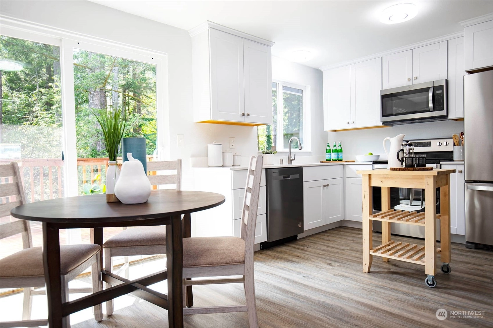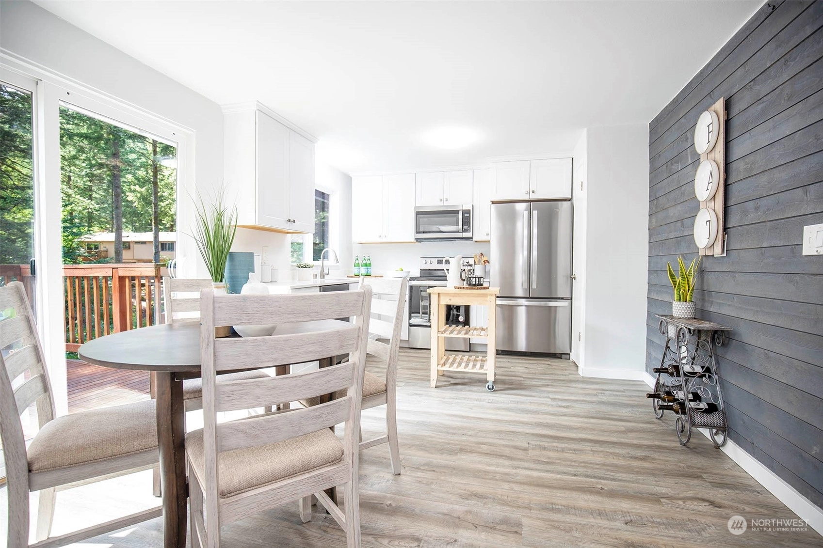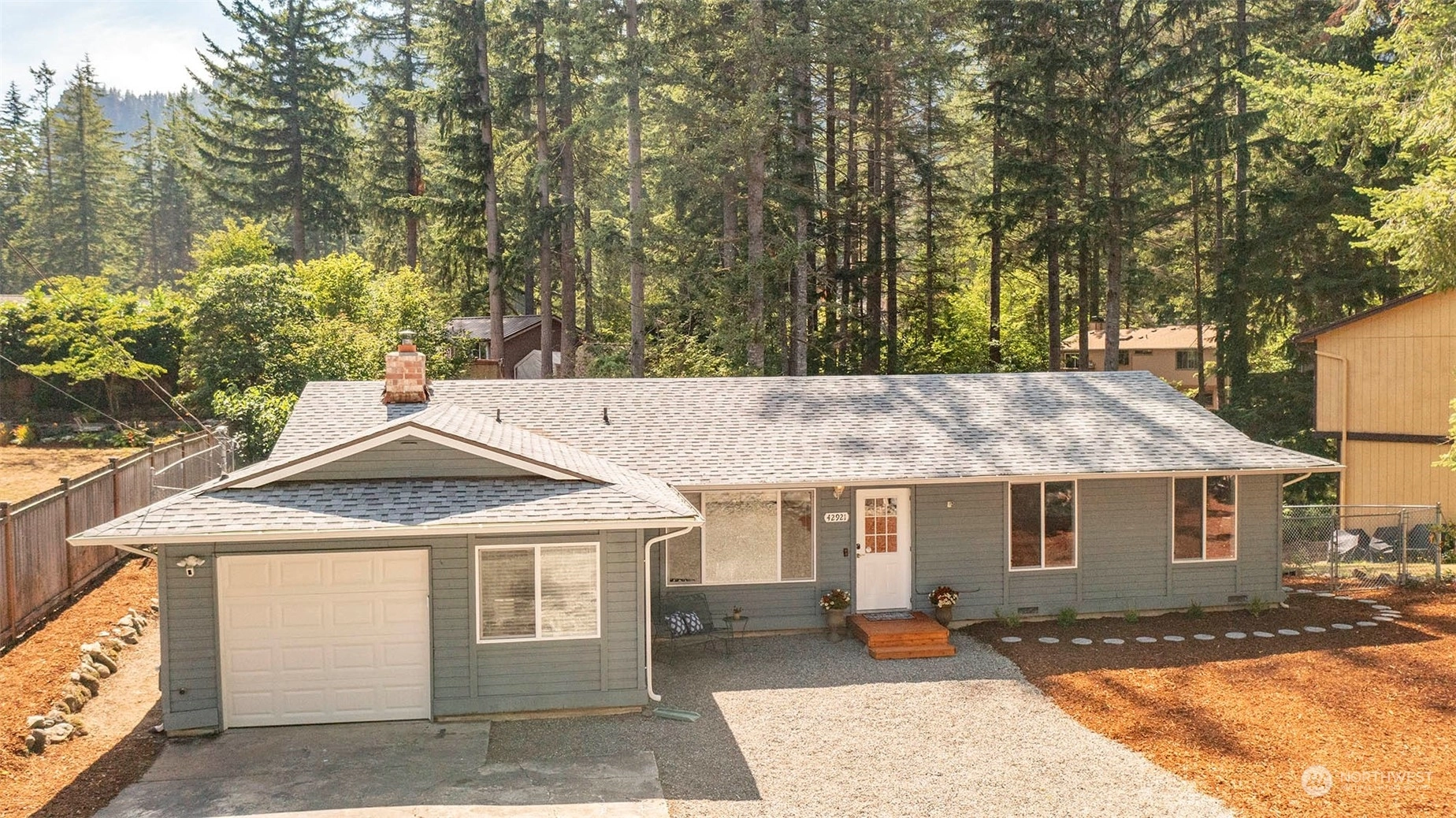 This charming rambler in one of the best locations in Wilderness Rim is a true retreat! Cozy up by the wood fireplace in the Family Room open to beautifully remodeled Kitchen w/all new white shaker cabinets, quartz countertops, SS appliances & pantry. Dining Room leading to Deck w/gas line for BBQ & expansive Patio. Living Room, Primary Bedroom, 2 more Bedrooms & nicely remodeled Full Bath. Utility Room w/storage, Half bath & Office off Family Room. Updates include new paint, new windows & blinds, new light fixtures, new carpet & LVP throughout, new garage door w/lift, tankless gas water heater. Large fully fenced yard, 1 car garage, driveway & RV parking! Swim in Rattlesnake Lake, watch beautiful wild life, enjoy hikes & walks! It's Home!