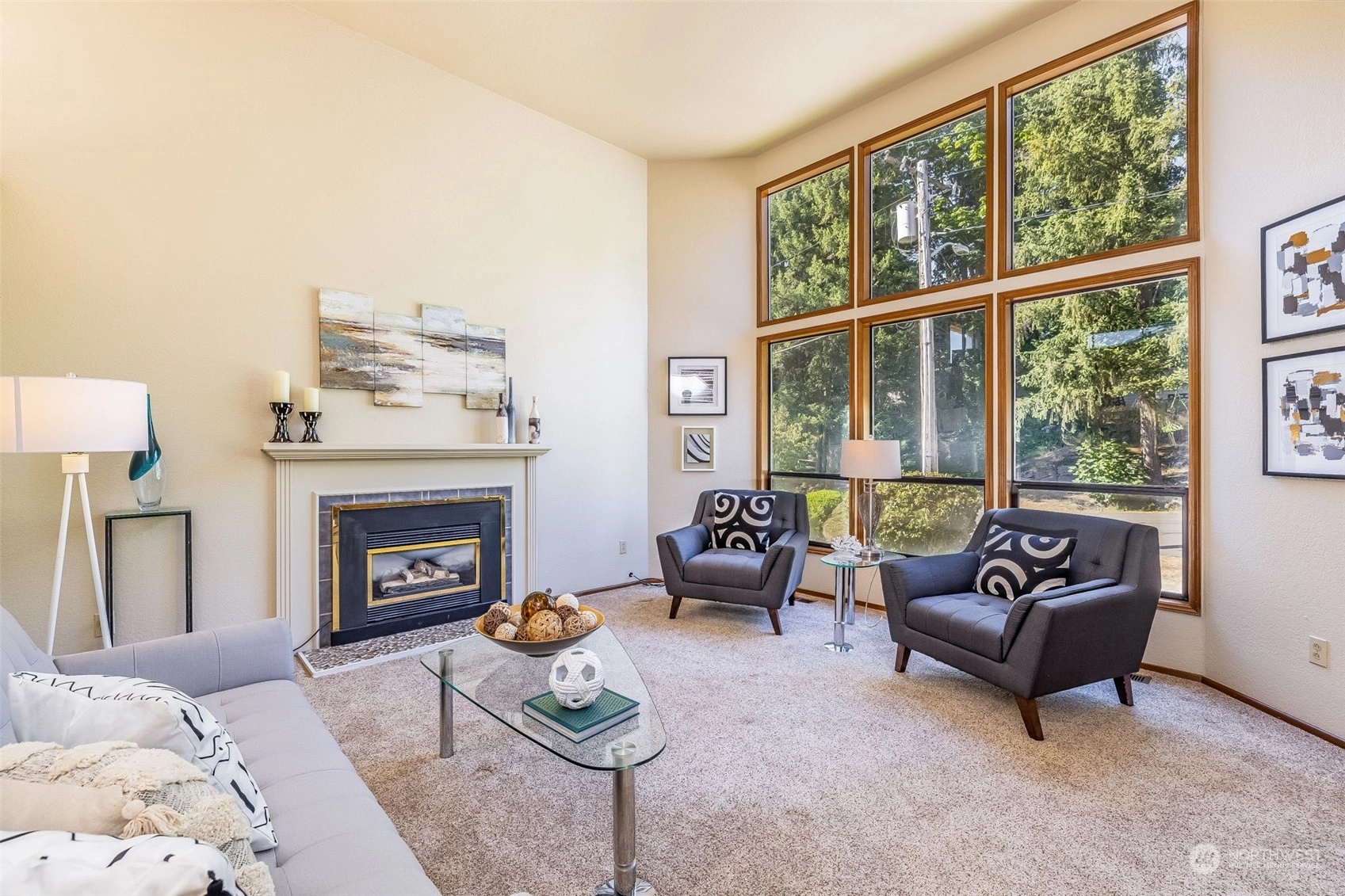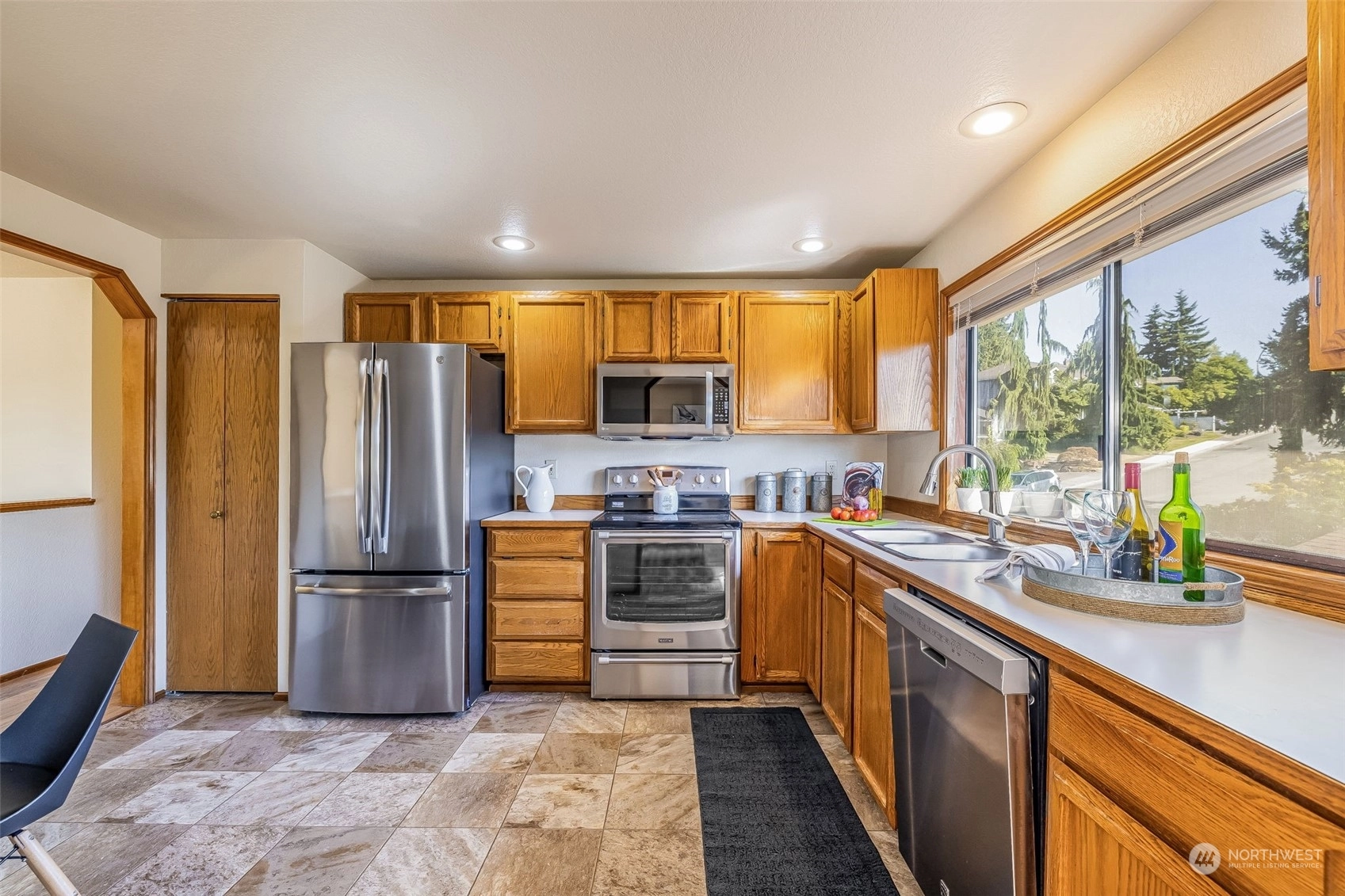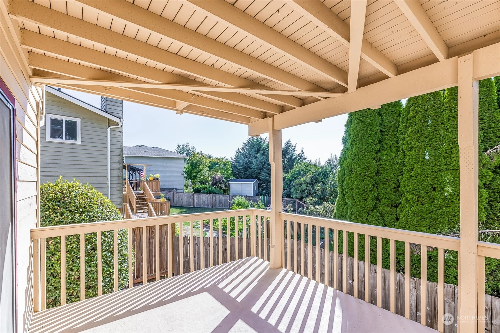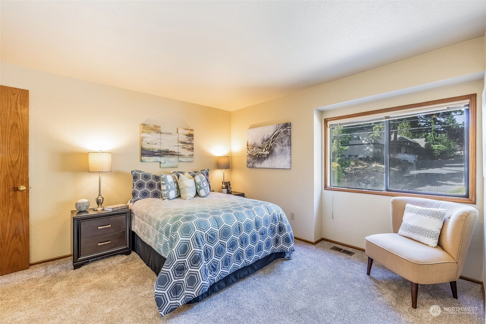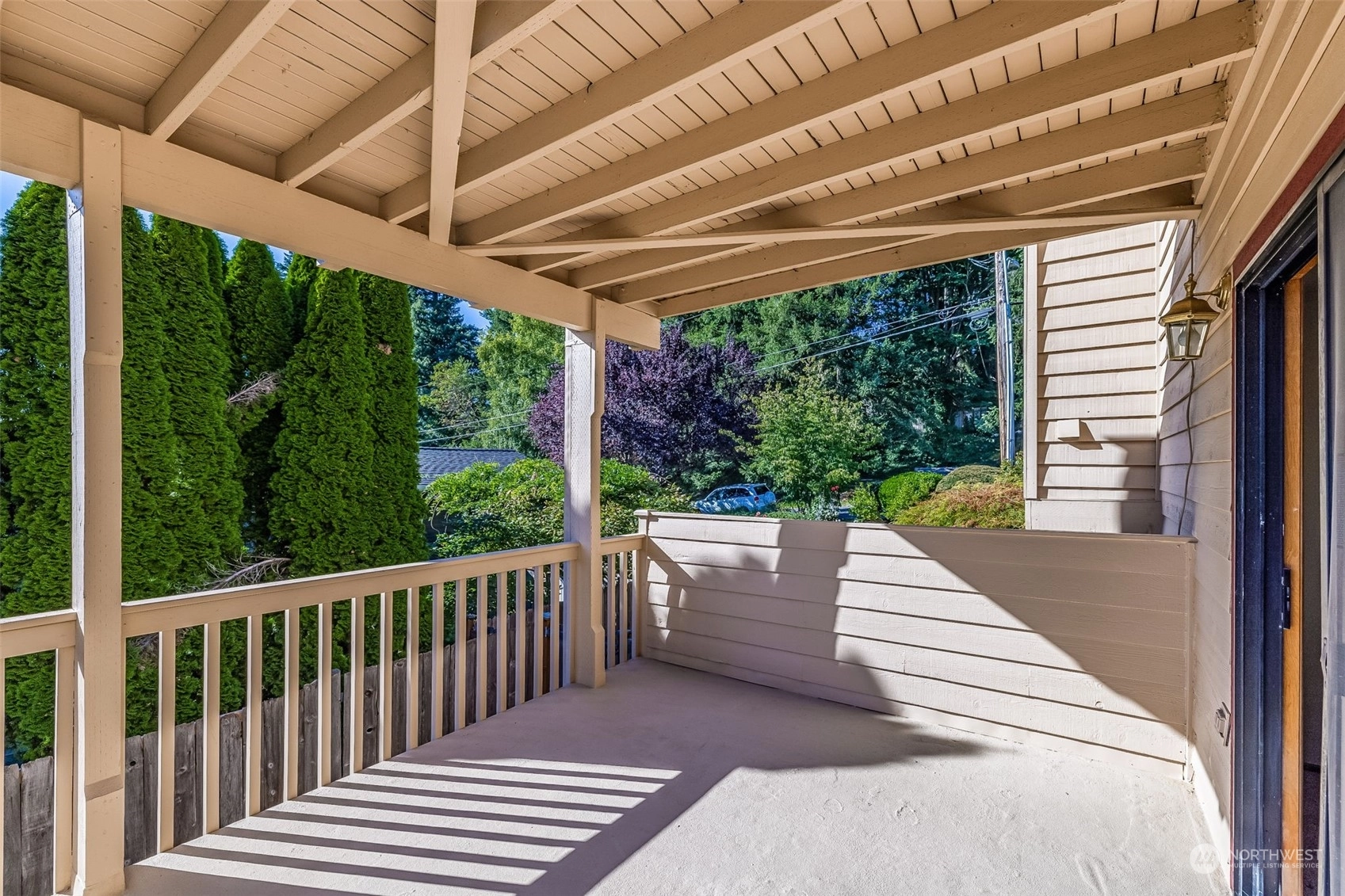 Wonderfully maintained large home in a quiet neighborhood of Kenmore. Open entry, light and bright. The living room enjoys a wall of windows and gas fireplace. The large kitchen with eating nook offers Stainless Steel appliances, pantry and access to the dining room and entertainment deck. New carpet in the 3 upstairs bedrooms. French doors lead you into the Primary bedroom that has a walk-in closet and private bath. Downstairs the large rec room is spacious, and the sliding door leads to a covered deck overlooking the fenced backyard. There is another bedroom downstairs and full bath. There is a partial unfinished room off the basement, great for crafts or a workout room. Build some equity by finishing this off to your taste.