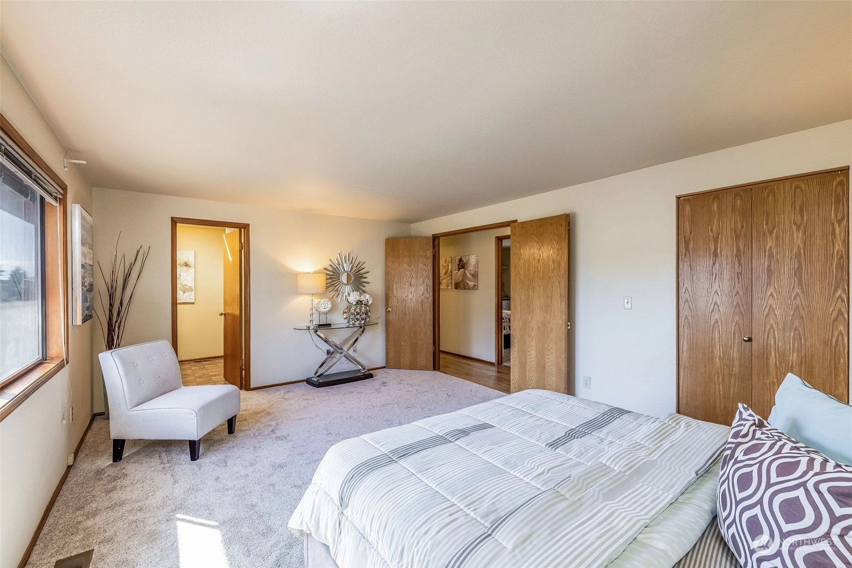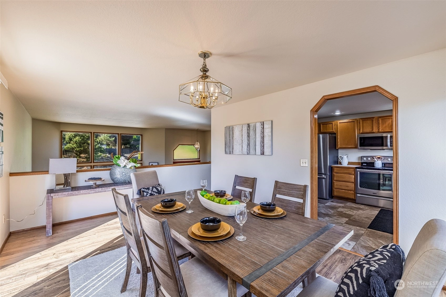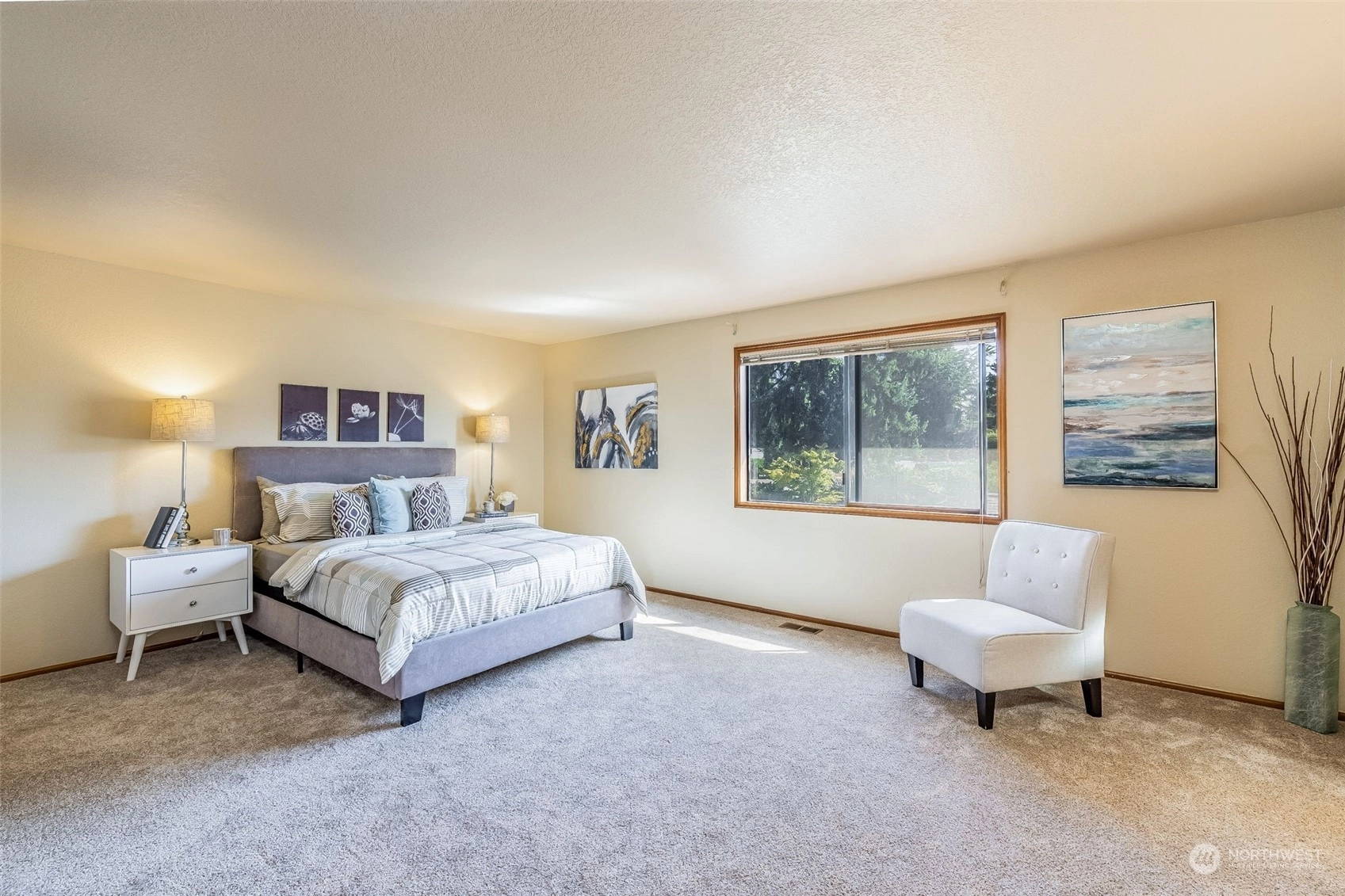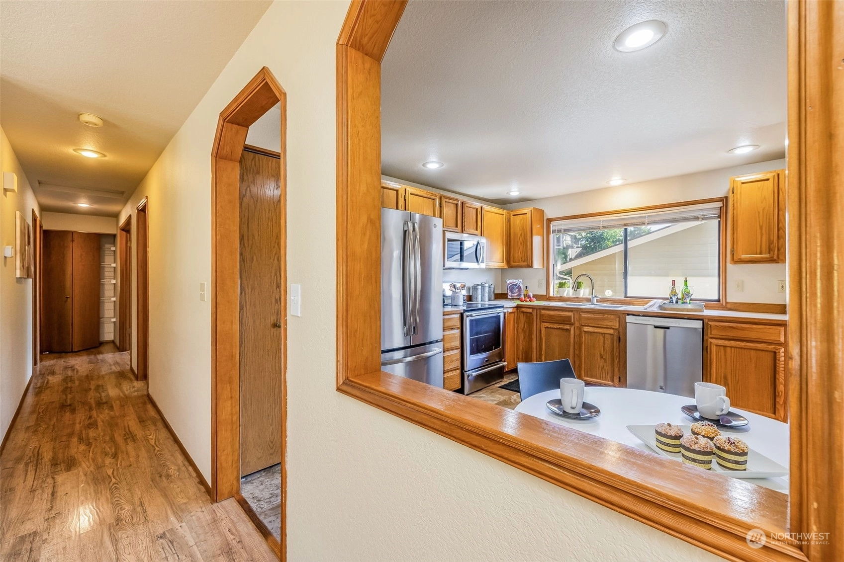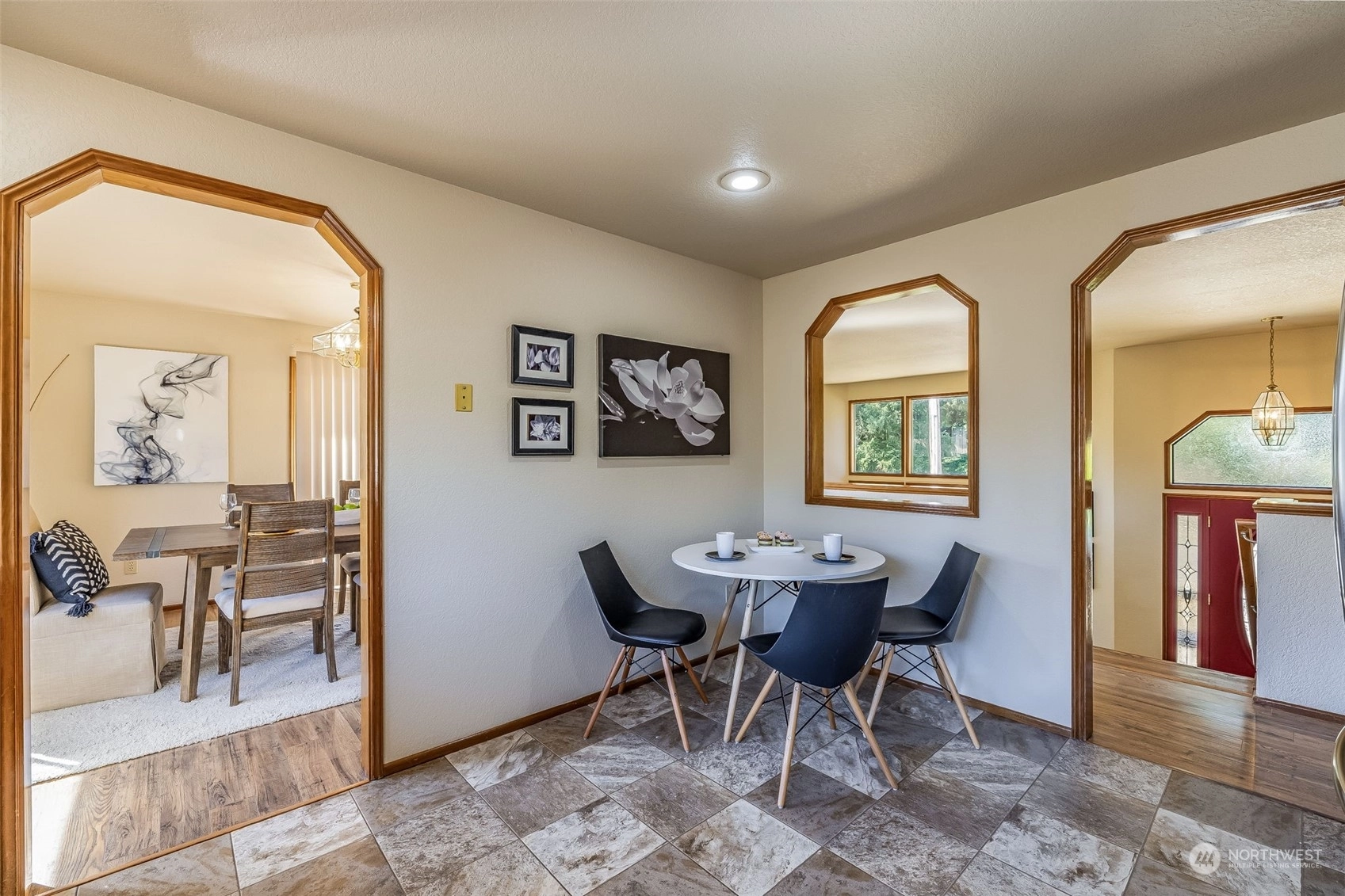 Wonderfully maintained large home in a quiet neighborhood of Kenmore. Open entry, light and bright. The living room enjoys a wall of windows and gas fireplace. The large kitchen with eating nook offers Stainless Steel appliances, pantry and access to the dining room and entertainment deck. New carpet in the 3 upstairs bedrooms. French doors lead you into the Primary bedroom that has a walk-in closet and private bath. Downstairs the large rec room is spacious, and the sliding door leads to a covered deck overlooking the fenced backyard. There is another bedroom downstairs and full bath. There is a partial unfinished room off the basement, great for crafts or a workout room. Build some equity by finishing this off to your taste.