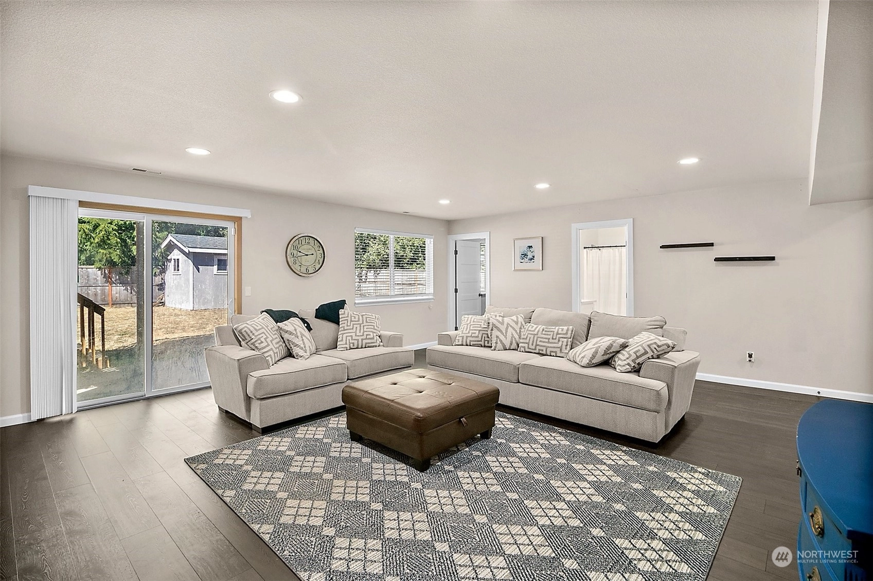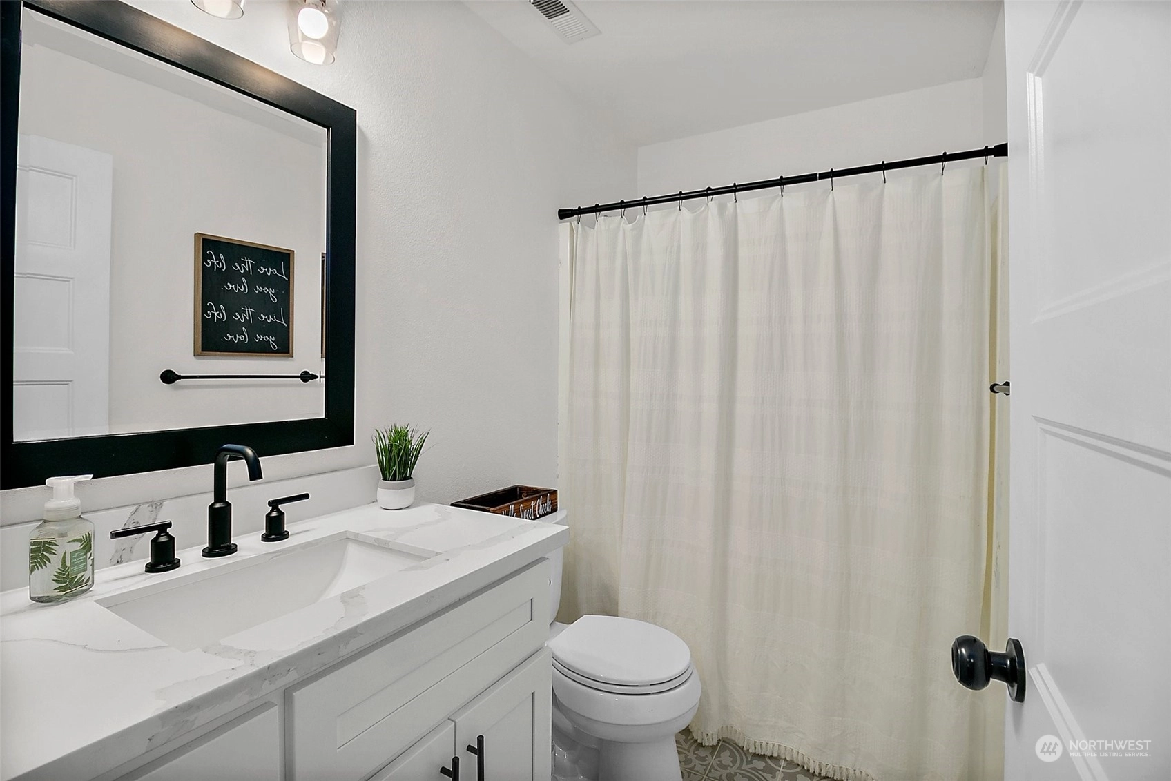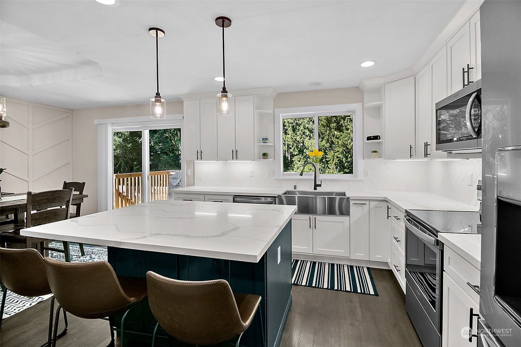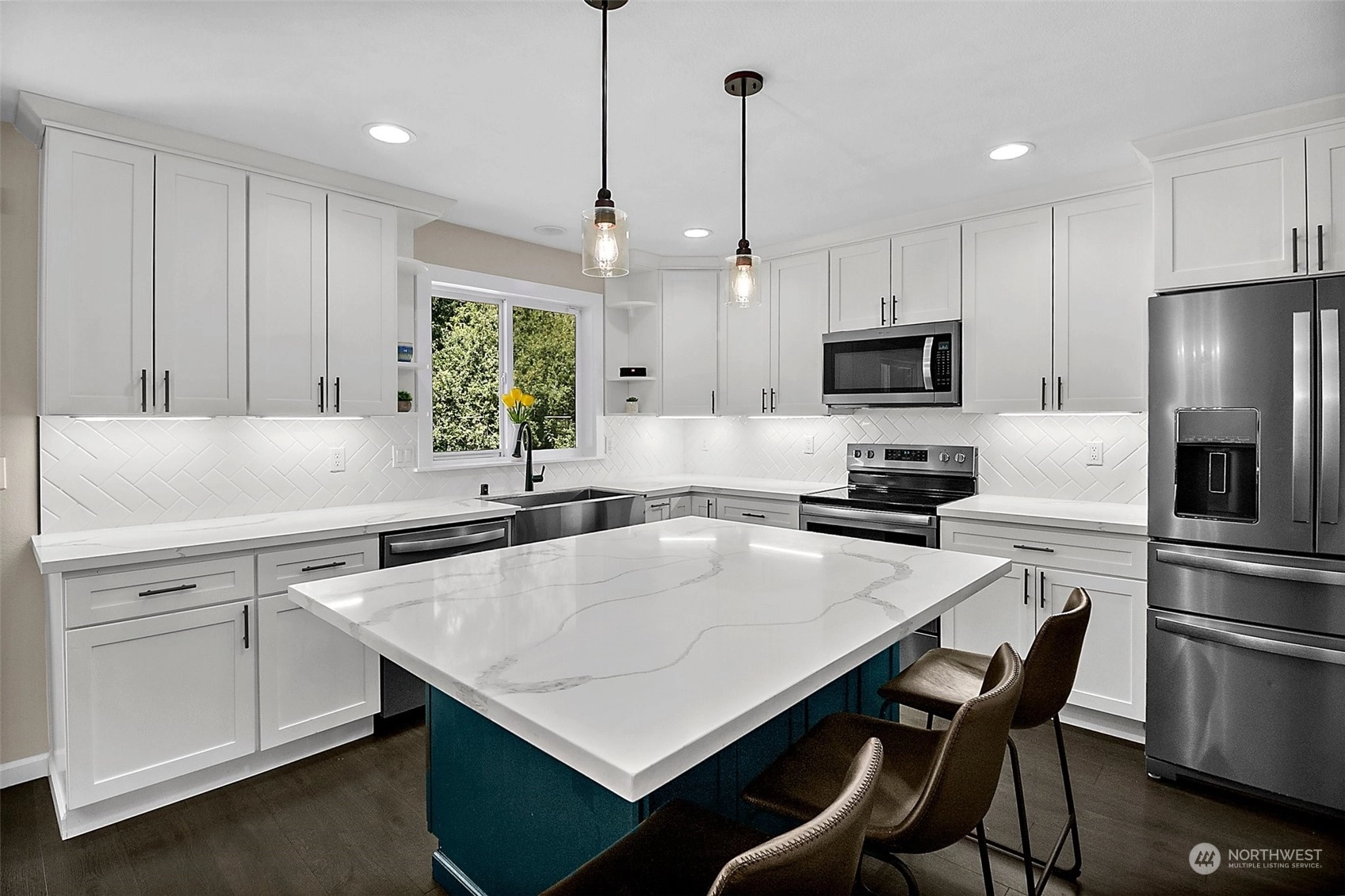 Welcome to this beautifully updated home sitting on nearly a half-acre greenbelt. Boasting 4 bed, 3 bath, and just shy of 2,600 sq ft.. This home has it all. Featuring all new cabinets, quartz countertops, custom island, fixtures, can lighting, laminate hardwood, fireplace surround, doors, trim, floor to ceiling tile in bathrooms with new vanities and fixtures, and much more. Not to mention the Heat pump with A/C was installed in 2020, along with a new furnace. Perfect for cooling down on those hot days! Outside you’ll notice newer exterior paint, a brand new deck with stairs leading down to the huge and private fully fenced back yard. This community provides privacy, while still being close to amenities and a mere 30 minutes from JBLM.