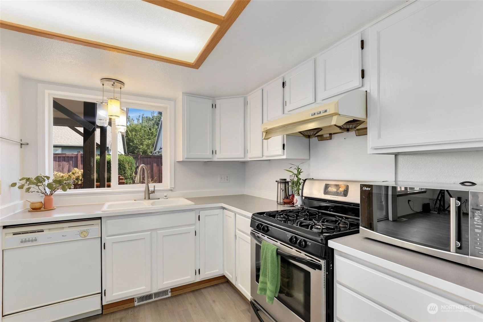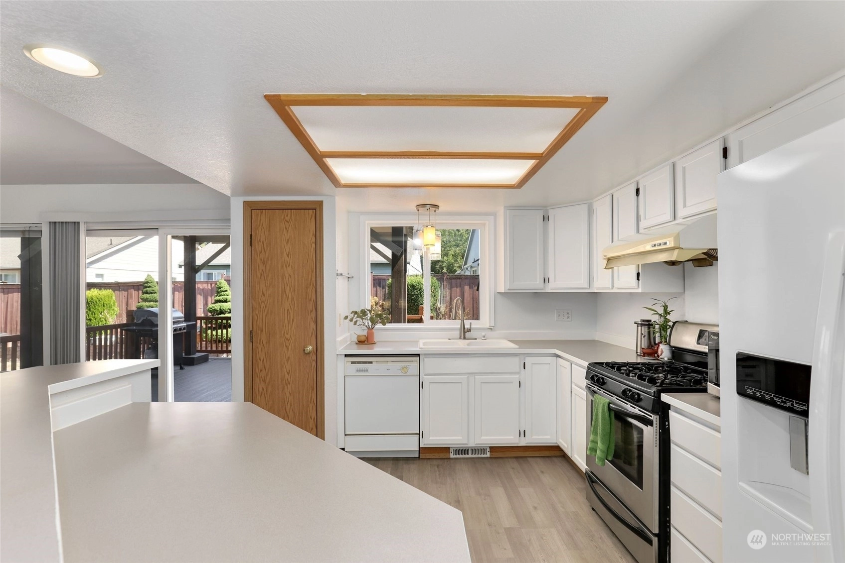 Fantastic 3 bedroom 2 bathroom rambler - come enjoy all your living on one level with no stairs. Light & bright with high ceilings, walls of windows & skylights. Polished & ready for a new owner. A chefs dream with modern kitchen, white cabinets, & pantry. Fall in love with beautiful brand new plank hardwood flooring & freshly painted walls. Double closets & an ensuite bathroom welcome you to the primary bedroom which overlooks the backyard. Sip your morning coffee on the front porch. Plenty of room for a large gathering on your huge backyard covered deck. Flat fenced yard with extra room on both side. 2 car attached garage. Close to amazing community park. Great neighborhood with sidewalks on both sides. New roof 2022! Pre-inspected.