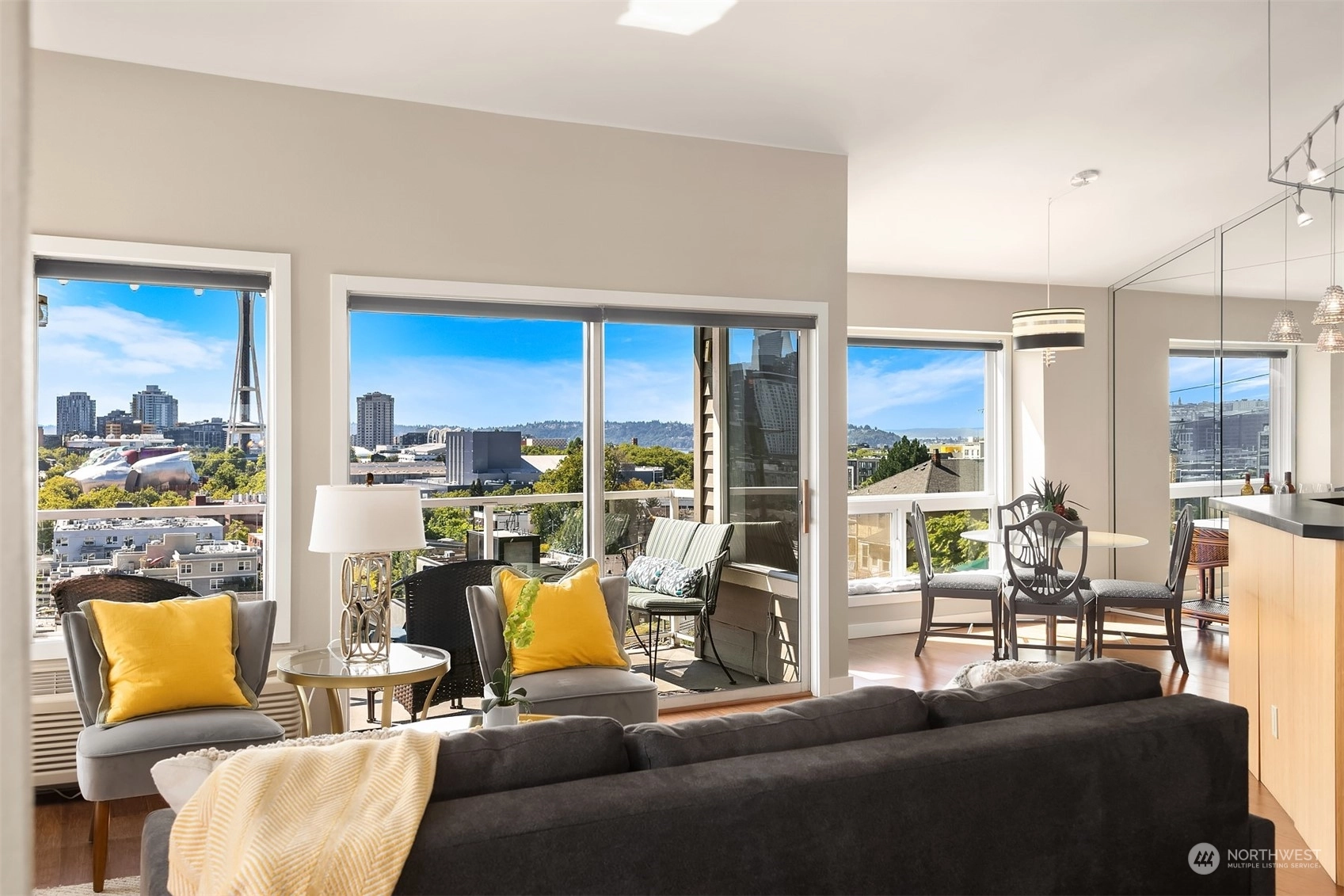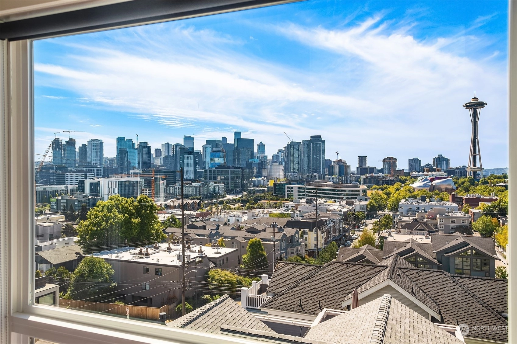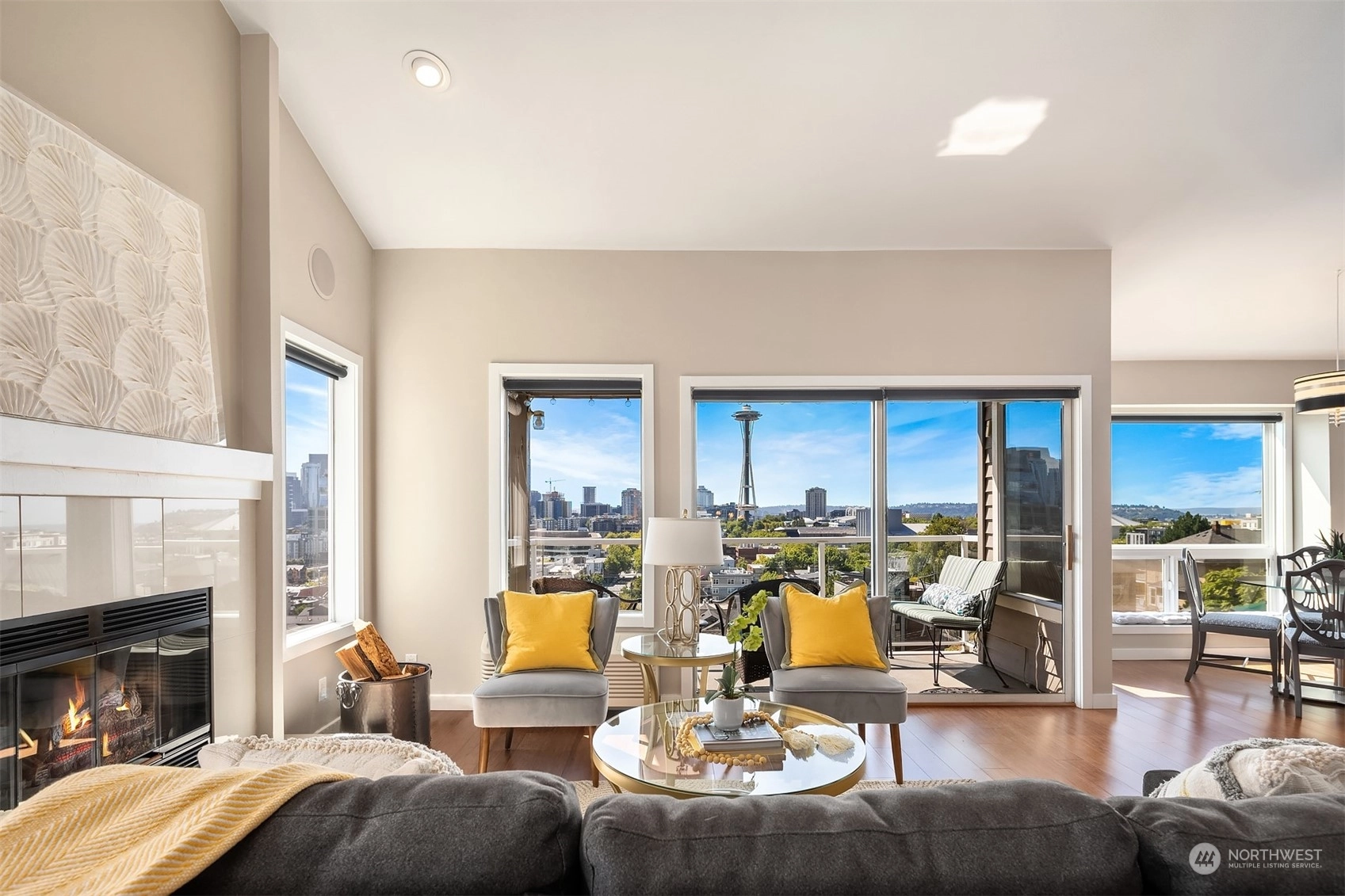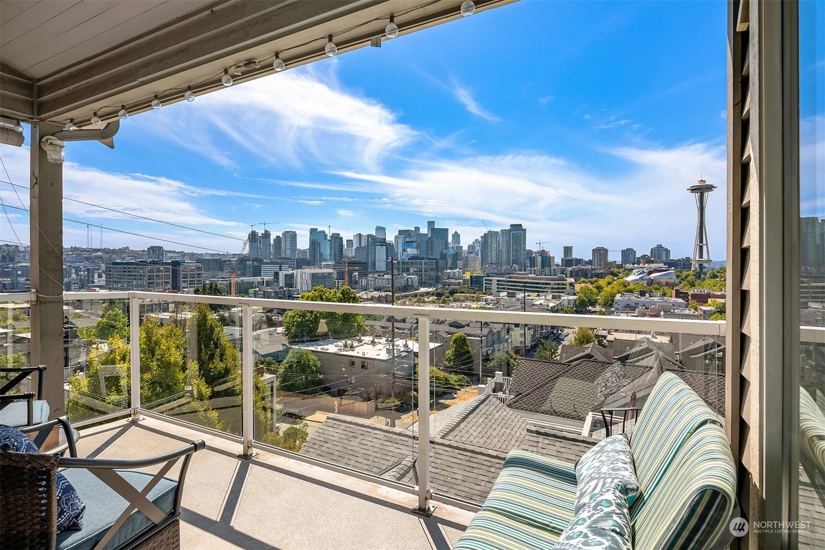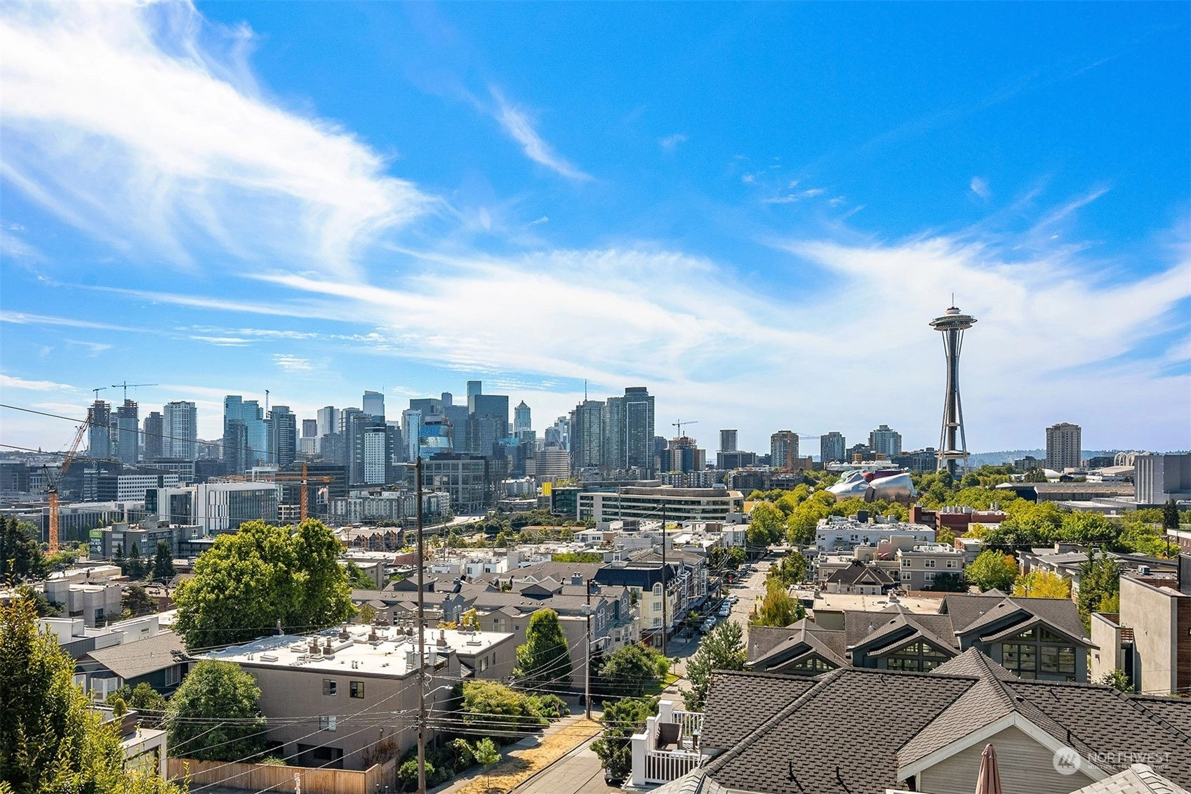 With spectacular Space Needle, city, sound & territorial views, this east slope Queen Anne home is a must see! Beautifully updated throughout, it features the perfect layout for entertaining or just evenings at home enjoying the view. This top floor corner unit is light & bright w/ vaulted ceilings, skylights & views from every window. The primary suite features double closets incl. a walk-in w/ built ins. The 2nd bedroom is currently used as a den / sitting room & offers great flexibility to enhance living / entertaining space. The secure building features a lobby entry & gated garage. Enjoy the vibrant lower Queen Anne neighborhood with restaurants & shops within easy walking distance or hop on the monorail for a quick trip to the city.
