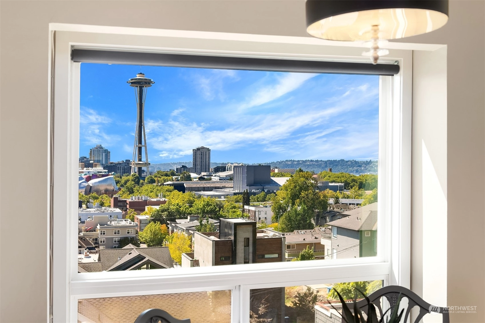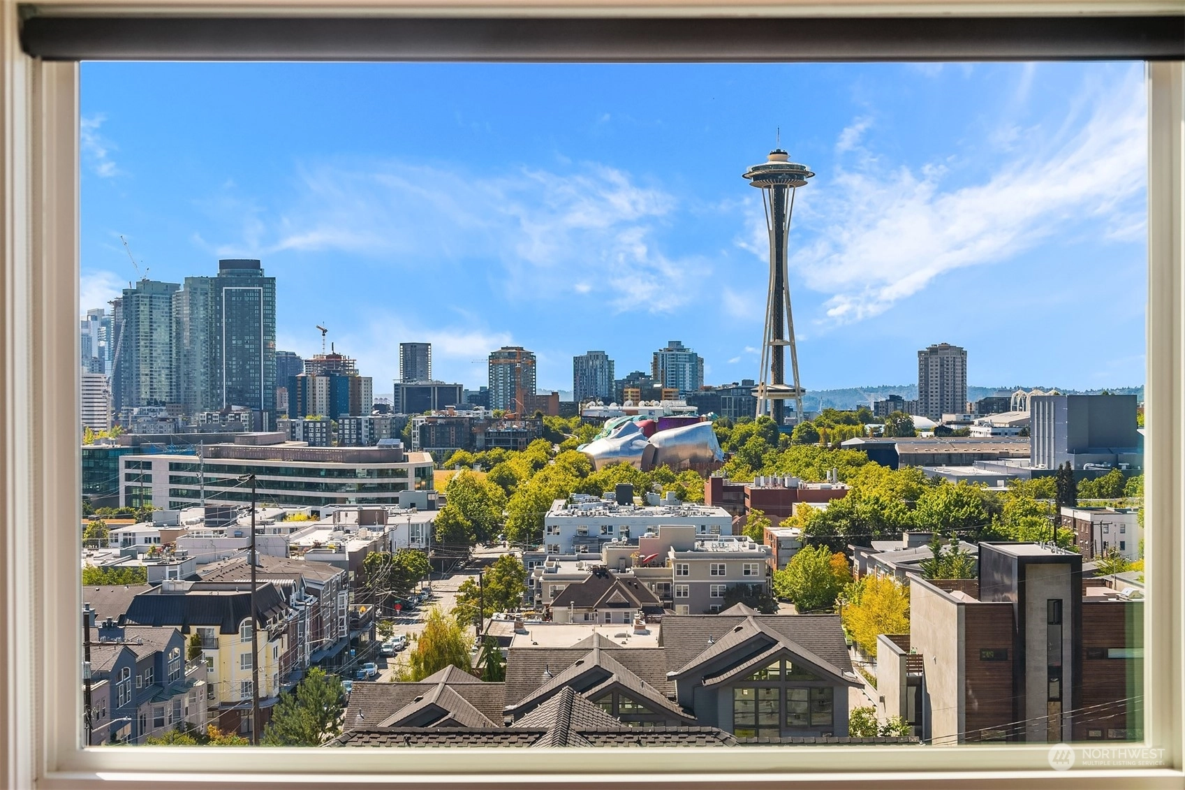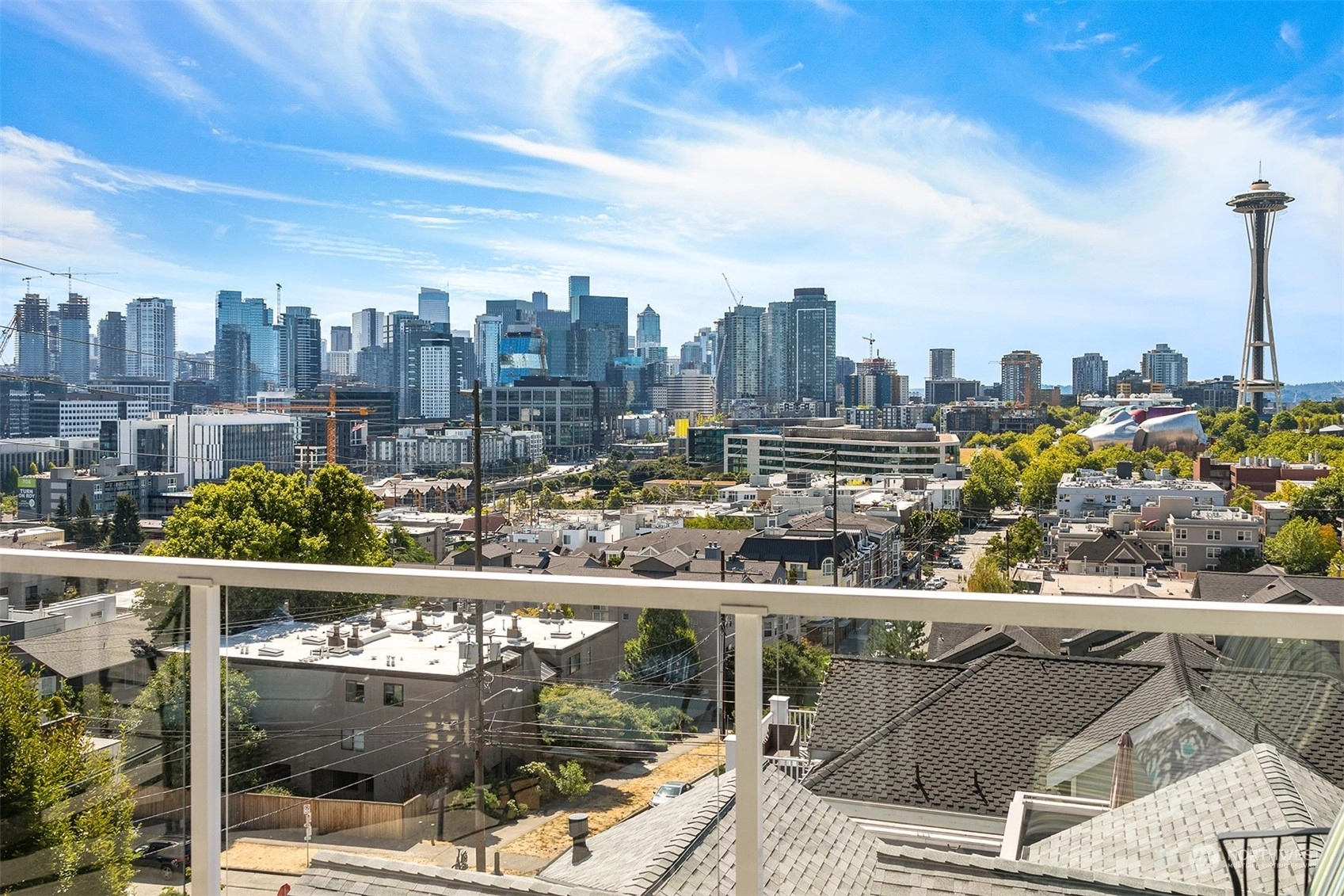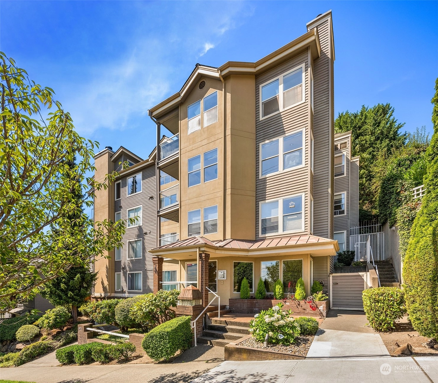 With spectacular Space Needle, city, sound & territorial views, this east slope Queen Anne home is a must see! Beautifully updated throughout, it features the perfect layout for entertaining or just evenings at home enjoying the view. This top floor corner unit is light & bright w/ vaulted ceilings, skylights & views from every window. The primary suite features double closets incl. a walk-in w/ built ins. The 2nd bedroom is currently used as a den / sitting room & offers great flexibility to enhance living / entertaining space. The secure building features a lobby entry & gated garage. Enjoy the vibrant lower Queen Anne neighborhood with restaurants & shops within easy walking distance or hop on the monorail for a quick trip to the city.