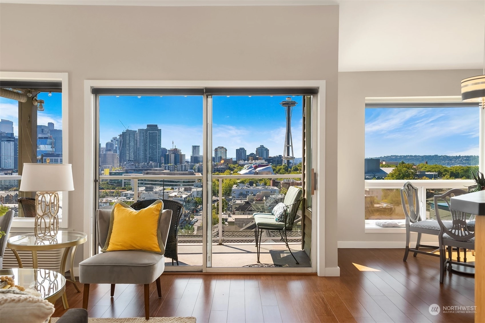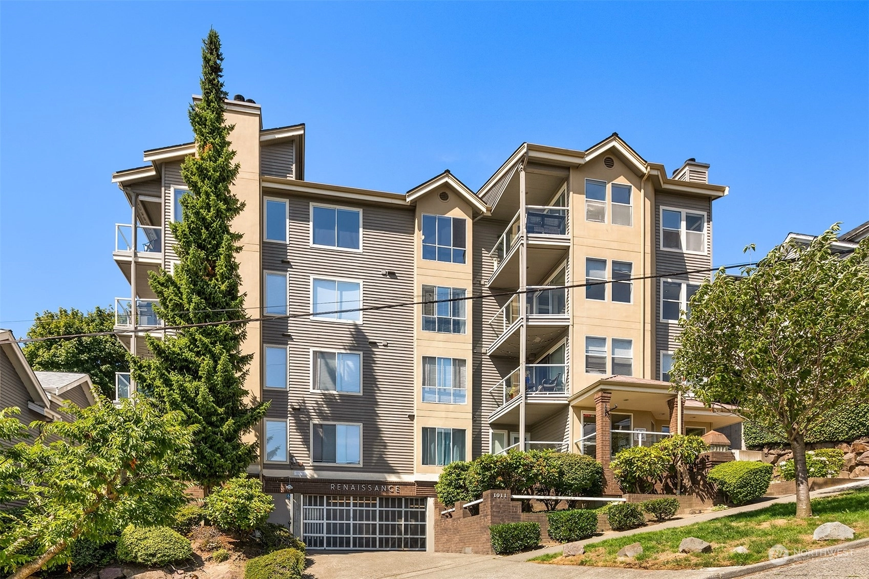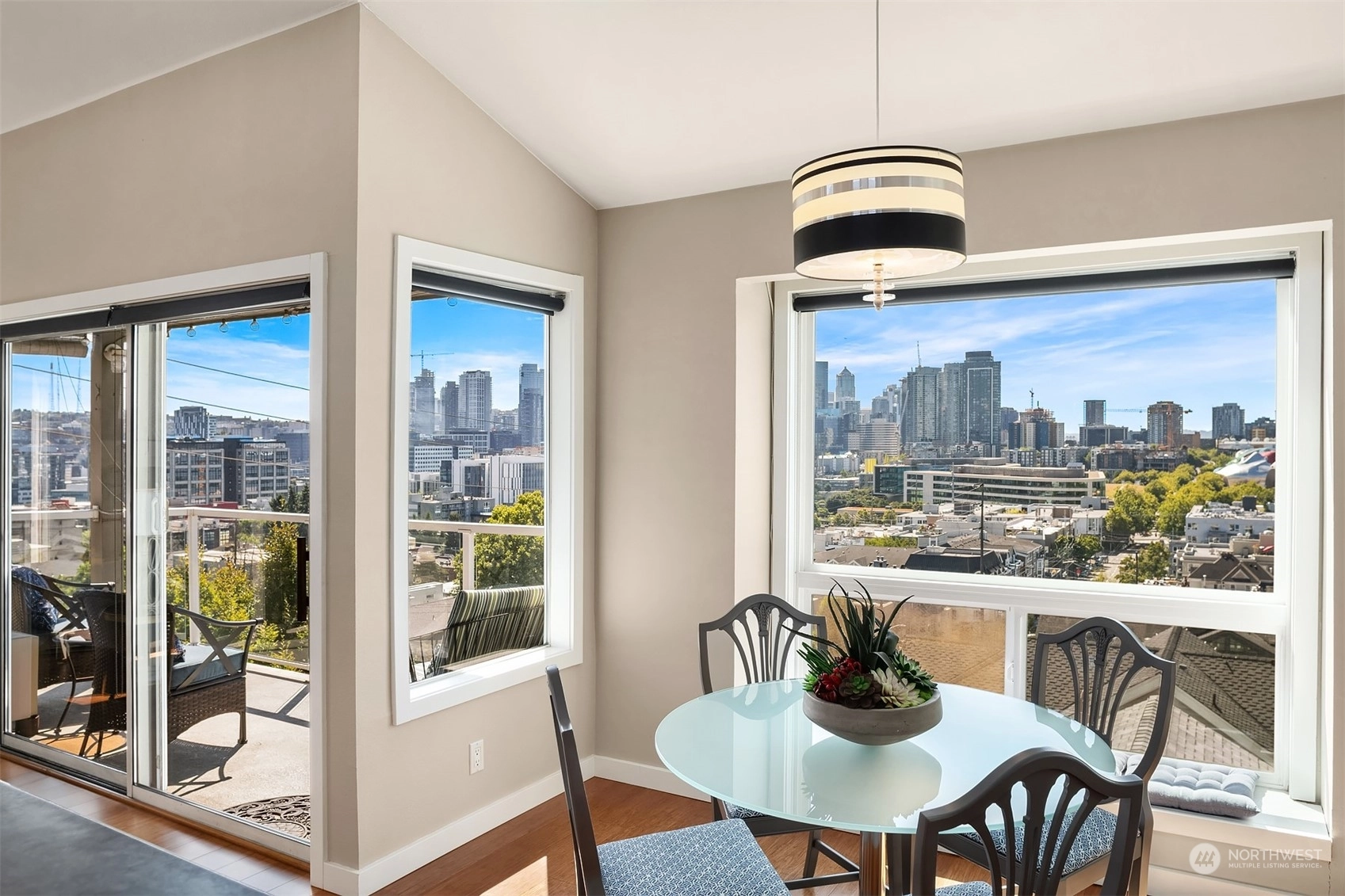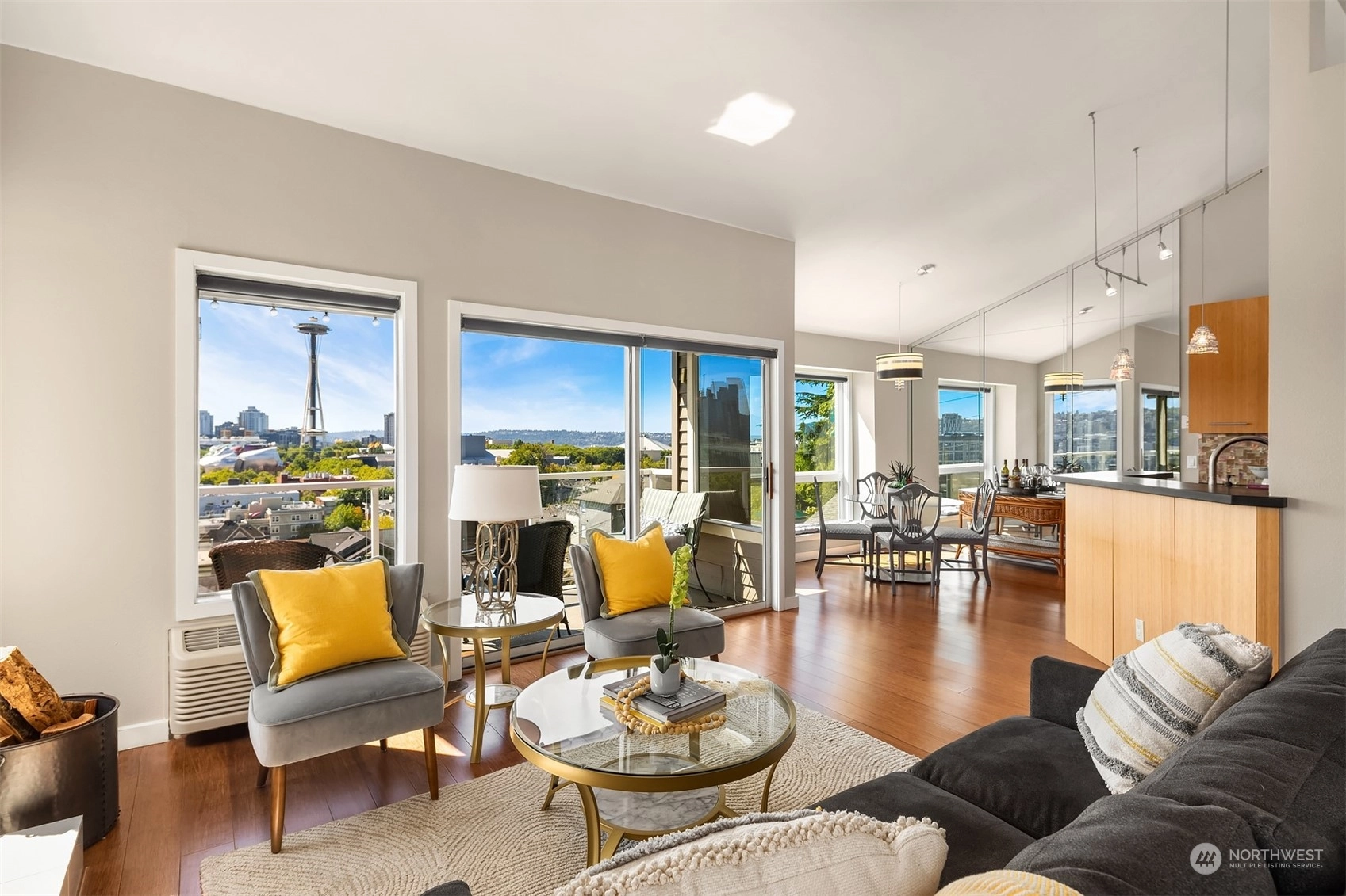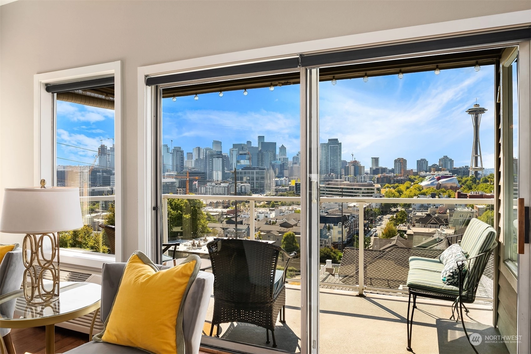 With spectacular Space Needle, city, sound & territorial views, this east slope Queen Anne home is a must see! Beautifully updated throughout, it features the perfect layout for entertaining or just evenings at home enjoying the view. This top floor corner unit is light & bright w/ vaulted ceilings, skylights & views from every window. The primary suite features double closets incl. a walk-in w/ built ins. The 2nd bedroom is currently used as a den / sitting room & offers great flexibility to enhance living / entertaining space. The secure building features a lobby entry & gated garage. Enjoy the vibrant lower Queen Anne neighborhood with restaurants & shops within easy walking distance or hop on the monorail for a quick trip to the city.