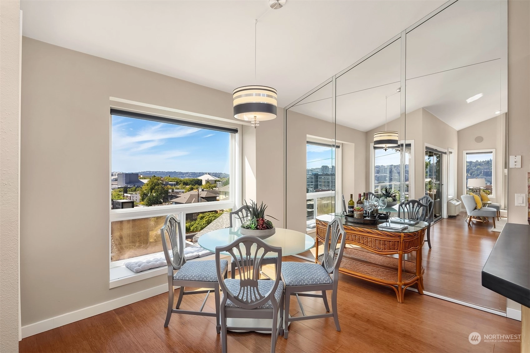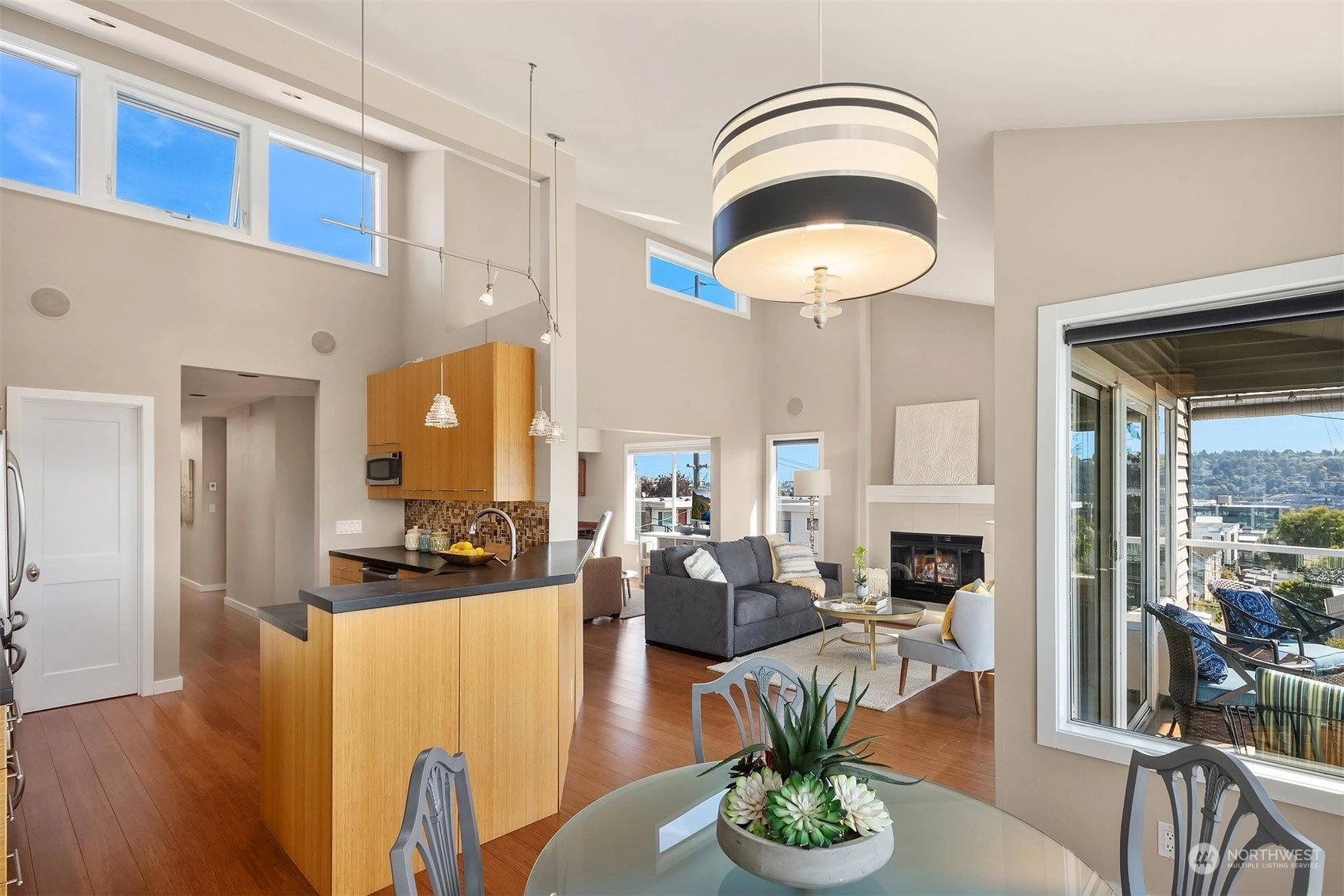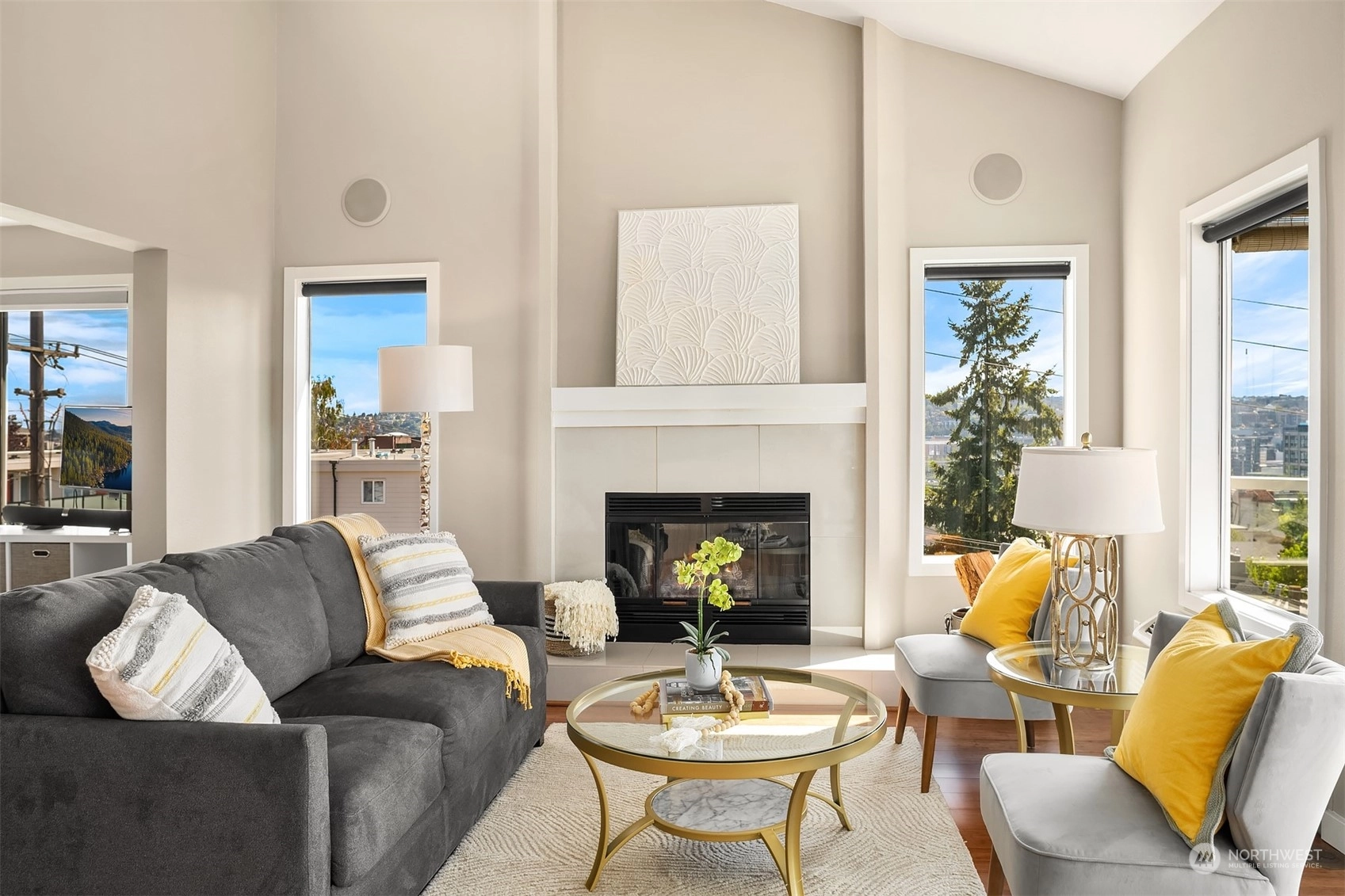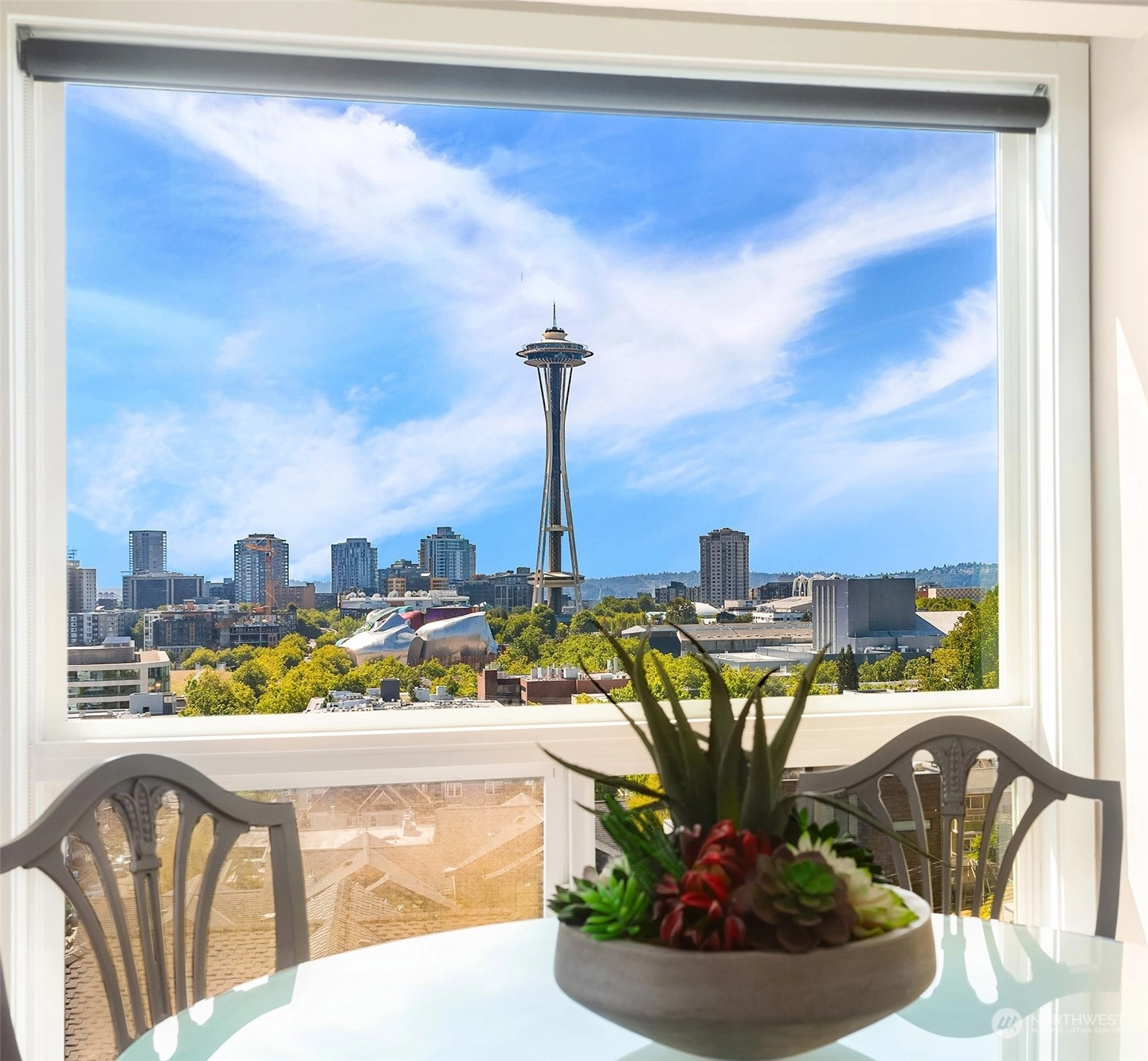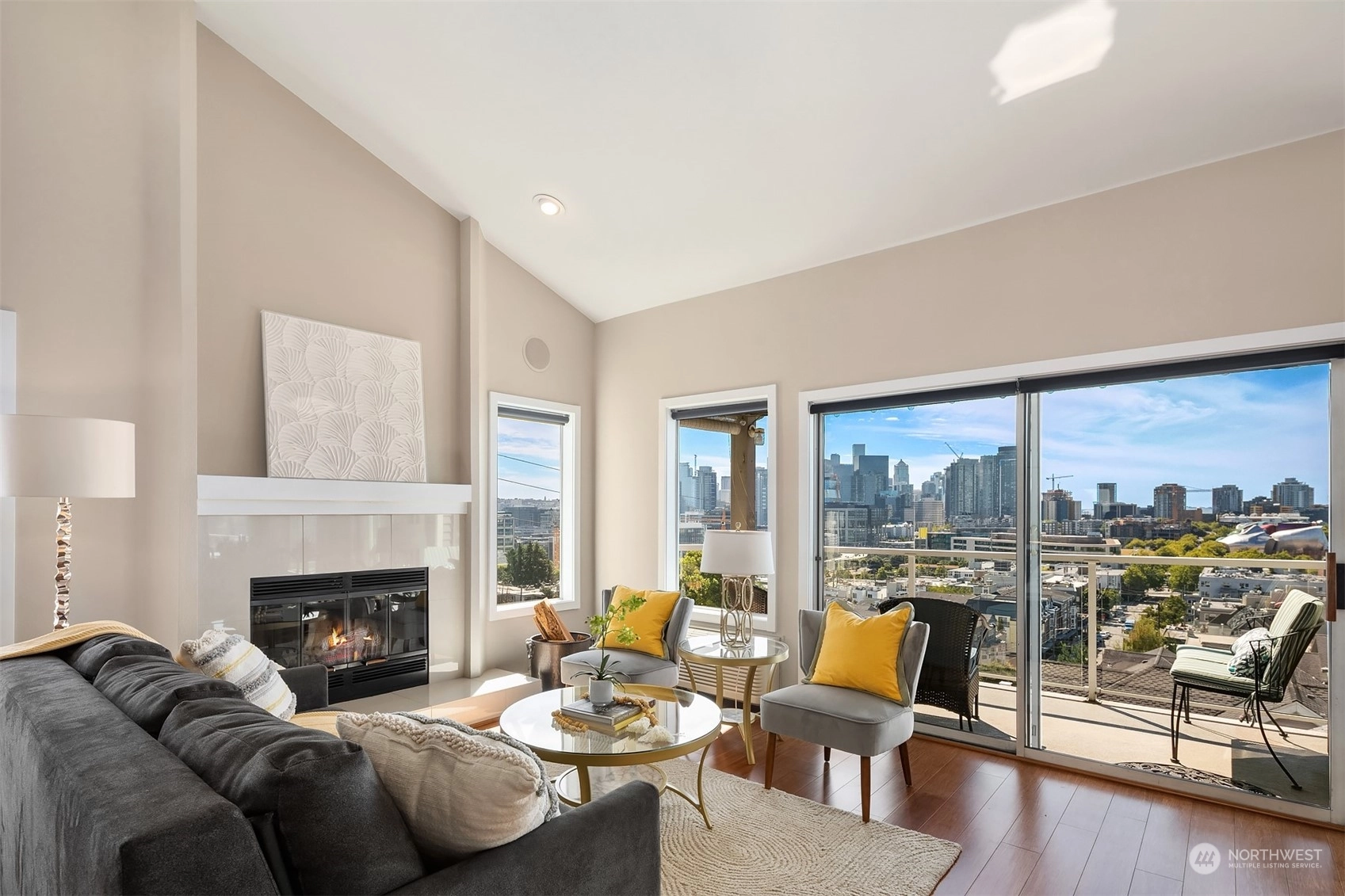 With spectacular Space Needle, city, sound & territorial views, this east slope Queen Anne home is a must see! Beautifully updated throughout, it features the perfect layout for entertaining or just evenings at home enjoying the view. This top floor corner unit is light & bright w/ vaulted ceilings, skylights & views from every window. The primary suite features double closets incl. a walk-in w/ built ins. The 2nd bedroom is currently used as a den / sitting room & offers great flexibility to enhance living / entertaining space. The secure building features a lobby entry & gated garage. Enjoy the vibrant lower Queen Anne neighborhood with restaurants & shops within easy walking distance or hop on the monorail for a quick trip to the city.