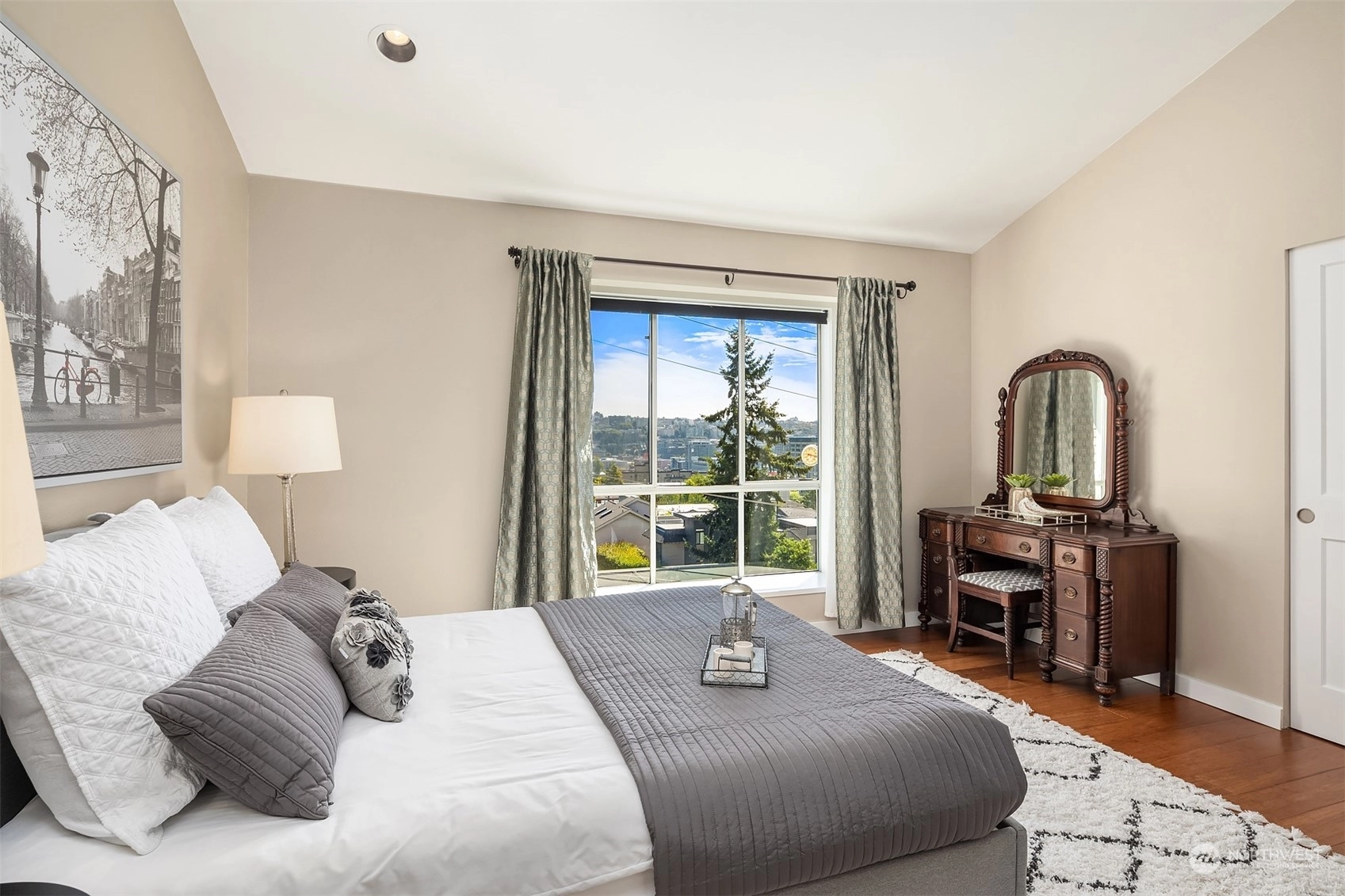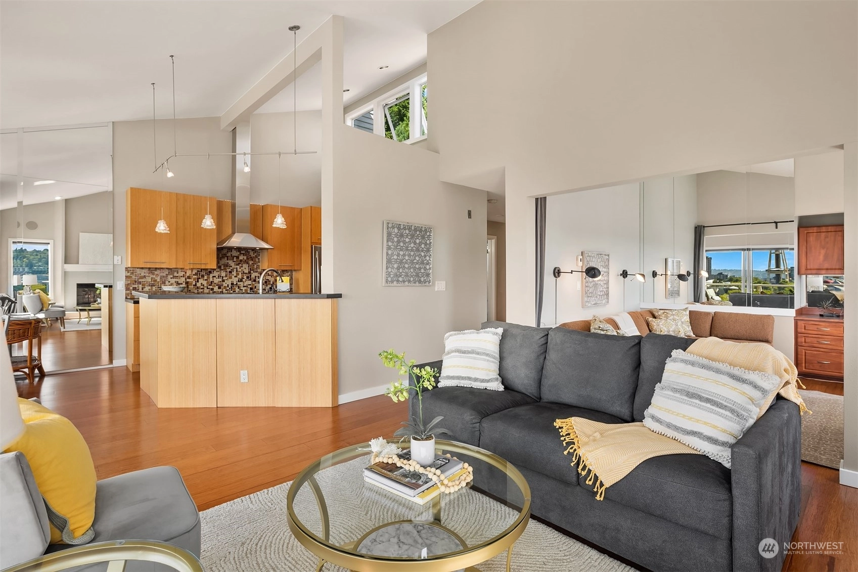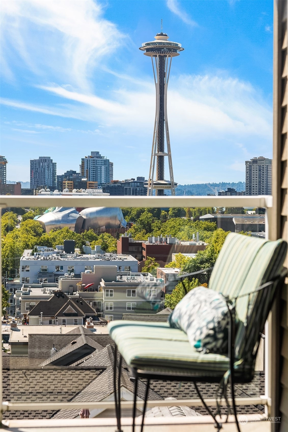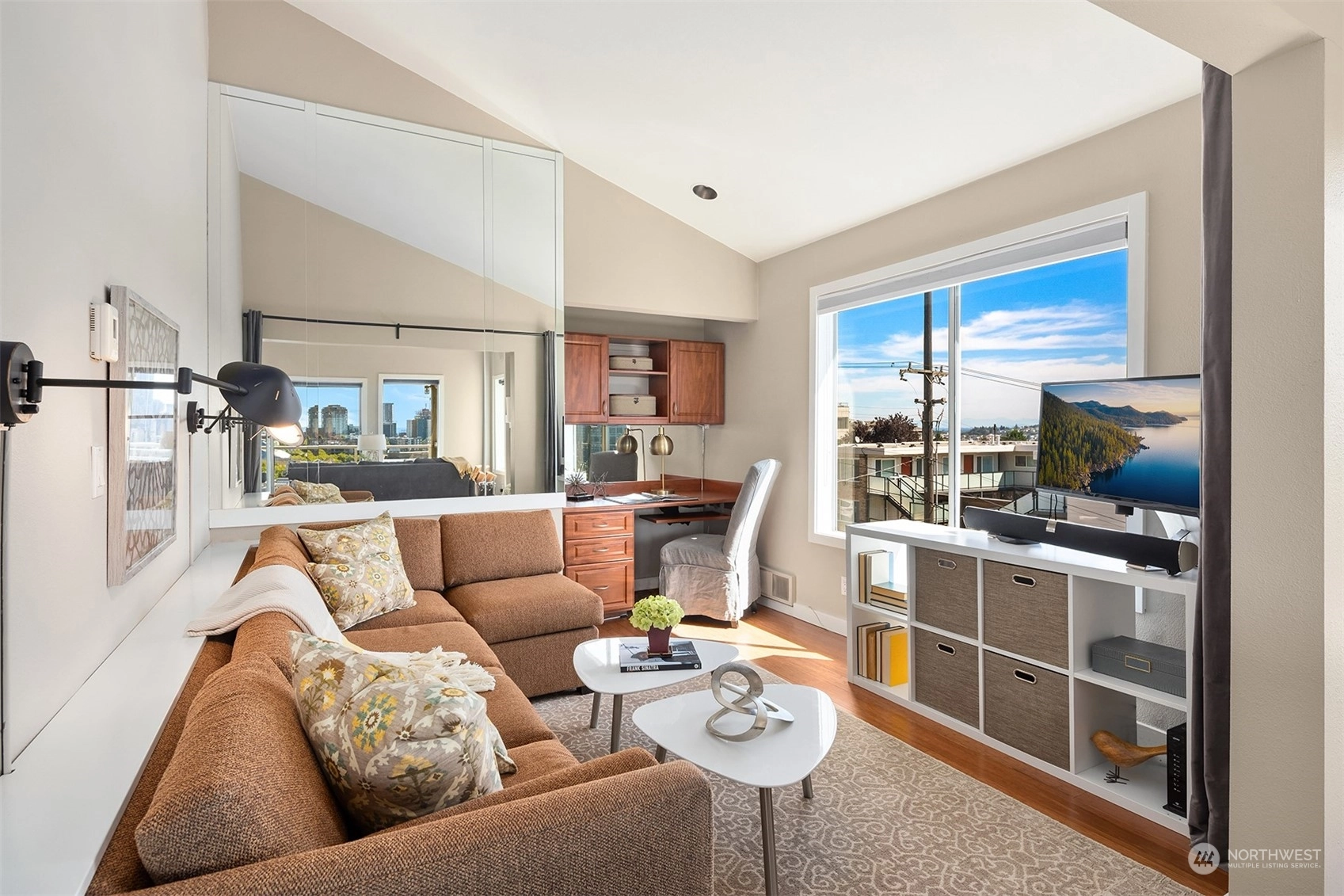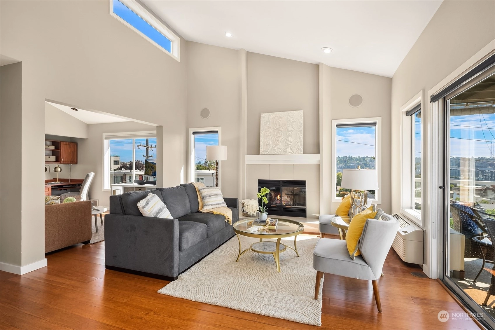 With spectacular Space Needle, city, sound & territorial views, this east slope Queen Anne home is a must see! Beautifully updated throughout, it features the perfect layout for entertaining or just evenings at home enjoying the view. This top floor corner unit is light & bright w/ vaulted ceilings, skylights & views from every window. The primary suite features double closets incl. a walk-in w/ built ins. The 2nd bedroom is currently used as a den / sitting room & offers great flexibility to enhance living / entertaining space. The secure building features a lobby entry & gated garage. Enjoy the vibrant lower Queen Anne neighborhood with restaurants & shops within easy walking distance or hop on the monorail for a quick trip to the city.