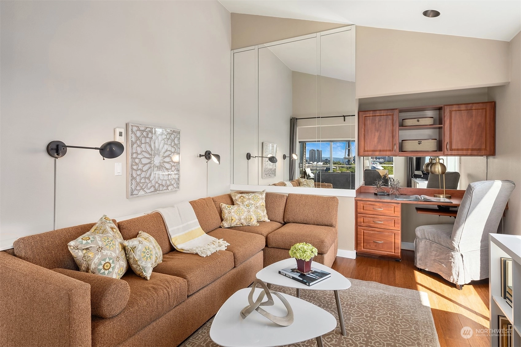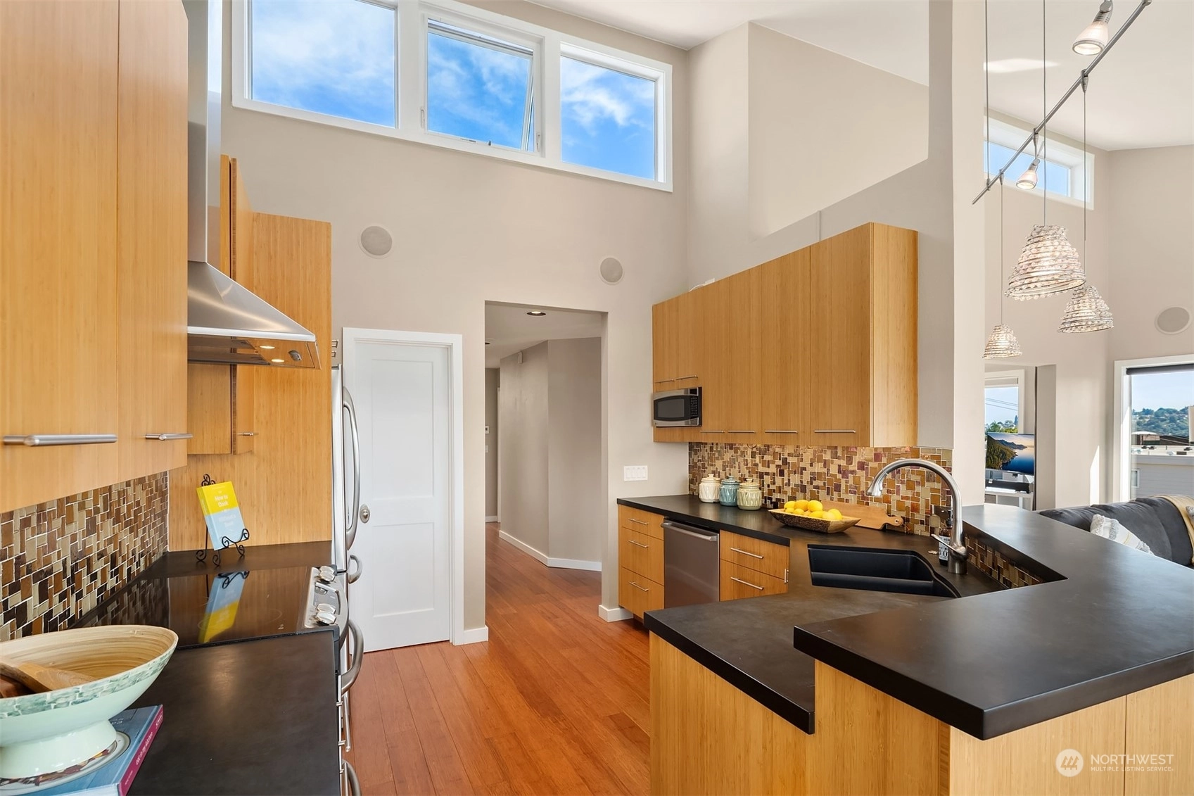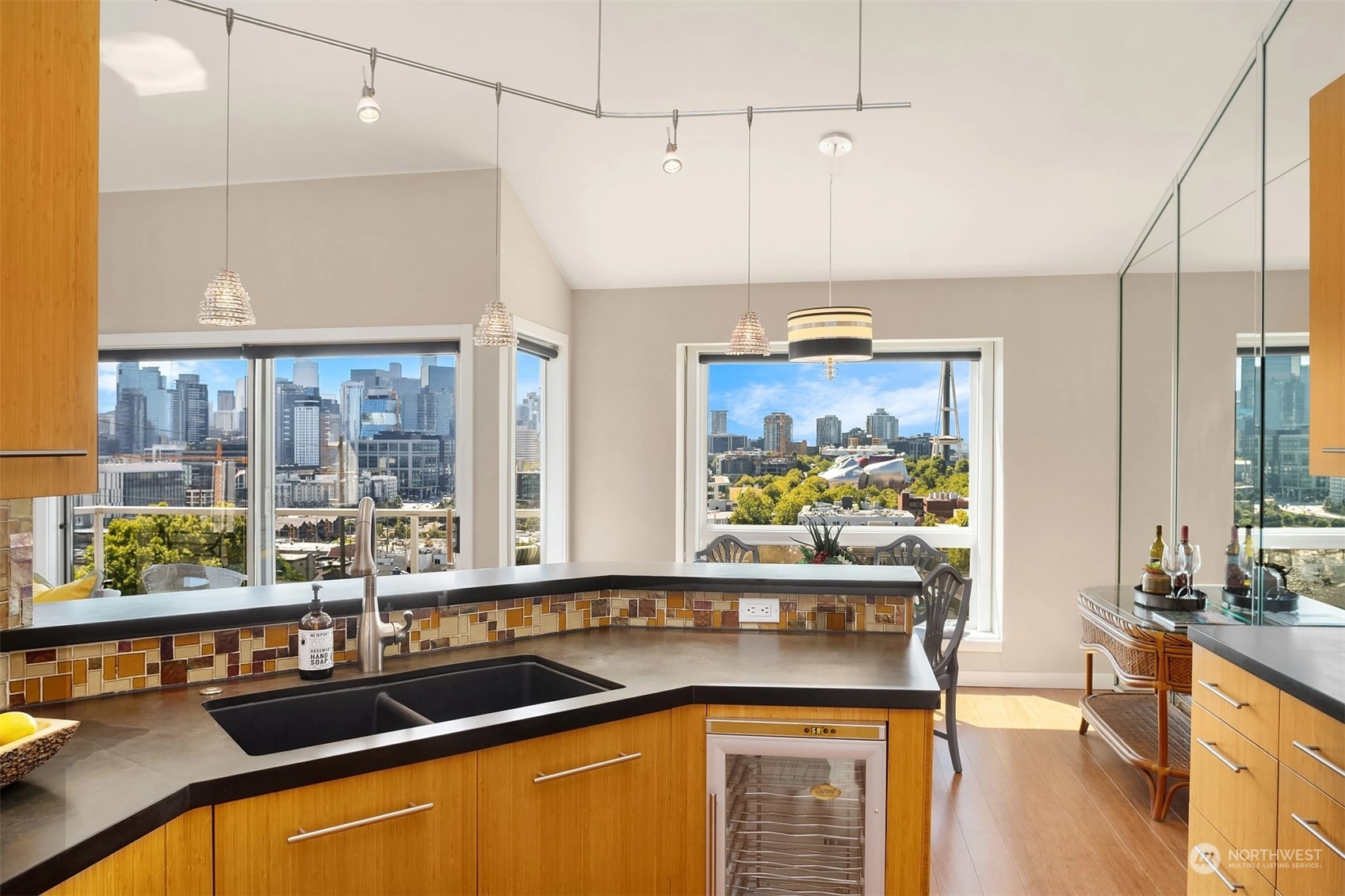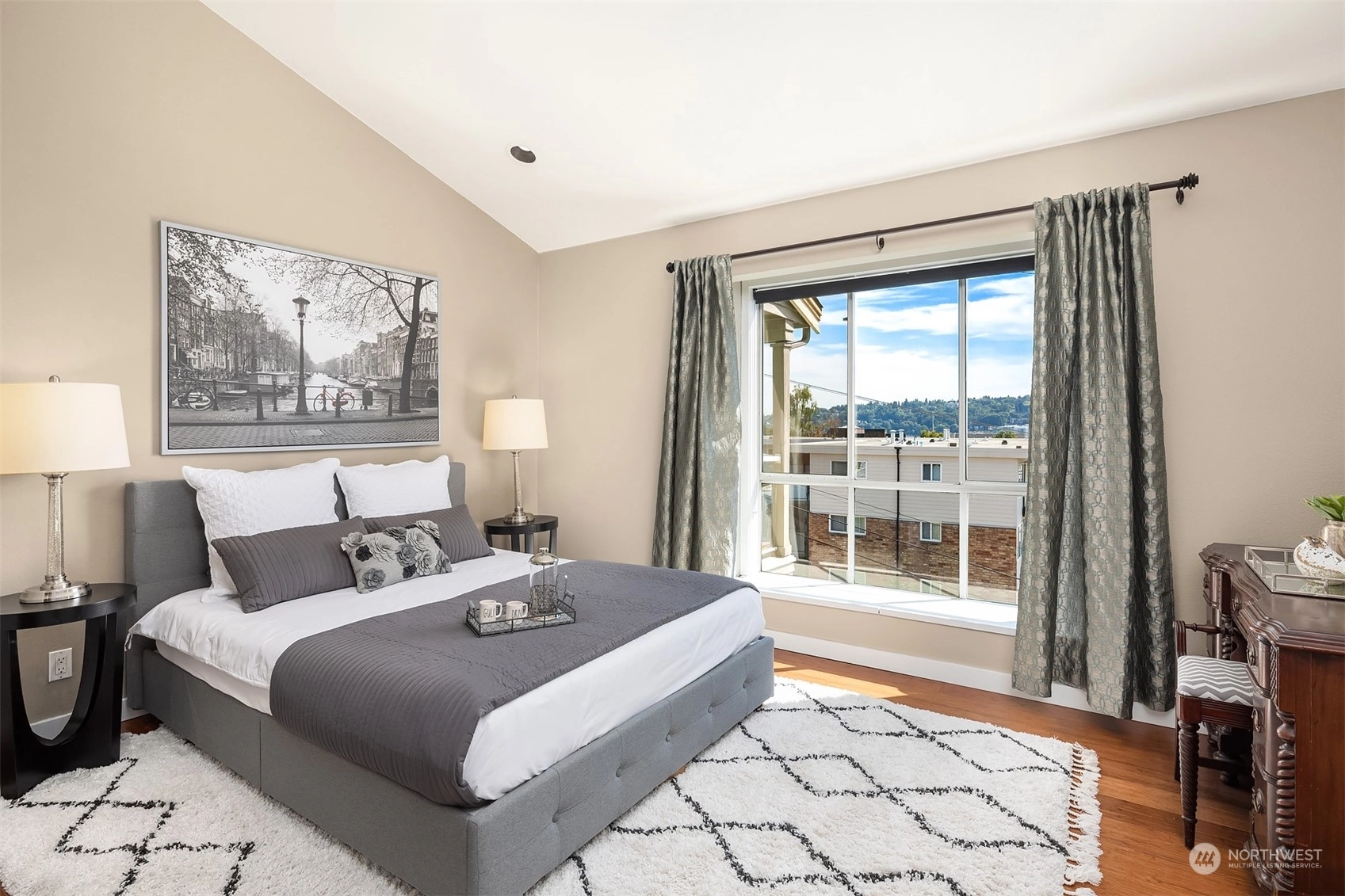 With spectacular Space Needle, city, sound & territorial views, this east slope Queen Anne home is a must see! Beautifully updated throughout, it features the perfect layout for entertaining or just evenings at home enjoying the view. This top floor corner unit is light & bright w/ vaulted ceilings, skylights & views from every window. The primary suite features double closets incl. a walk-in w/ built ins. The 2nd bedroom is currently used as a den / sitting room & offers great flexibility to enhance living / entertaining space. The secure building features a lobby entry & gated garage. Enjoy the vibrant lower Queen Anne neighborhood with restaurants & shops within easy walking distance or hop on the monorail for a quick trip to the city.