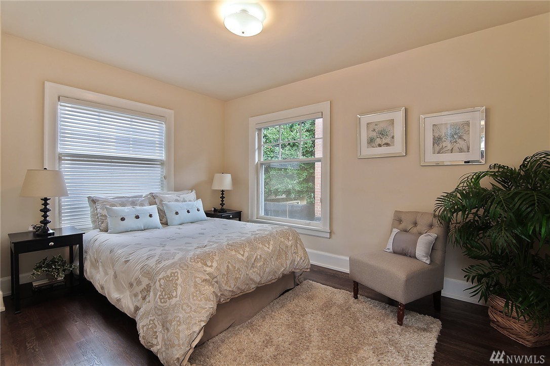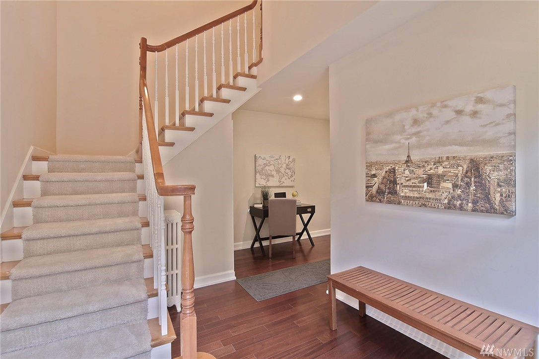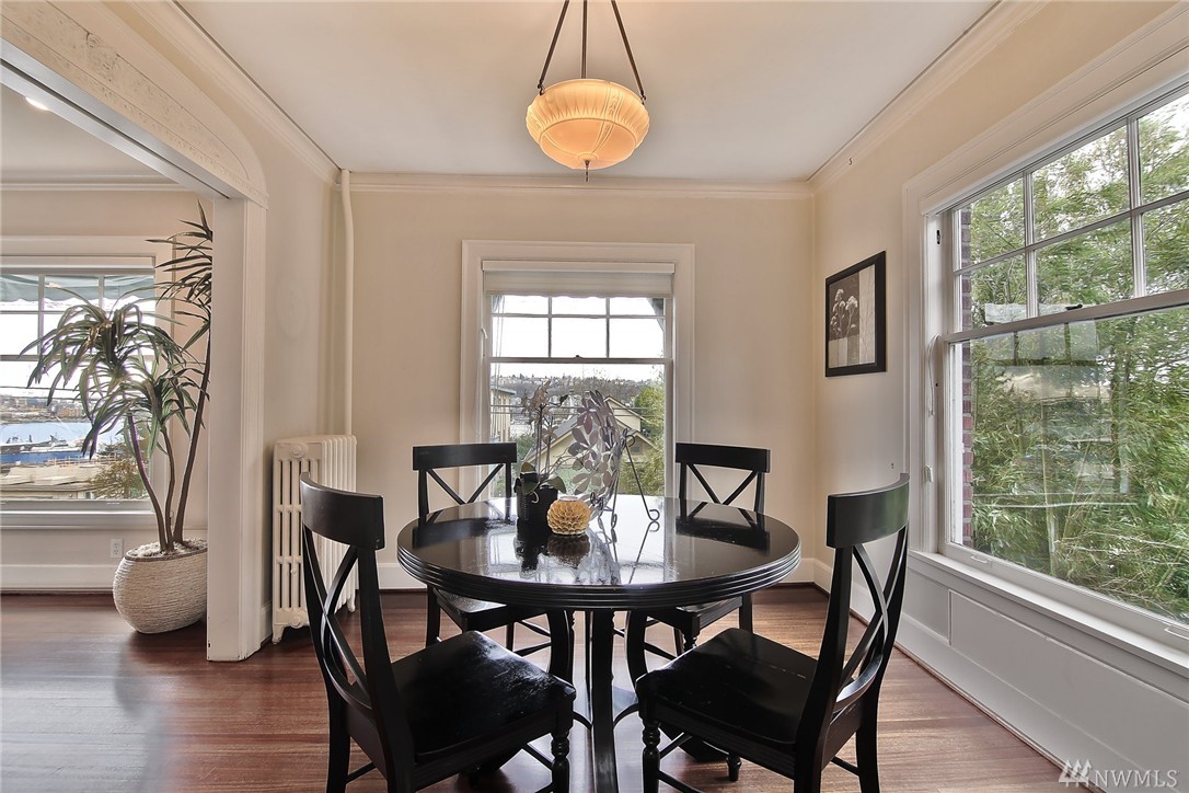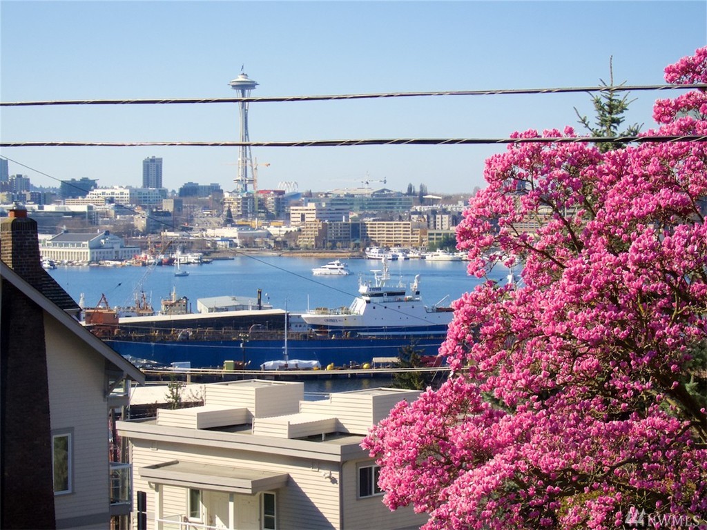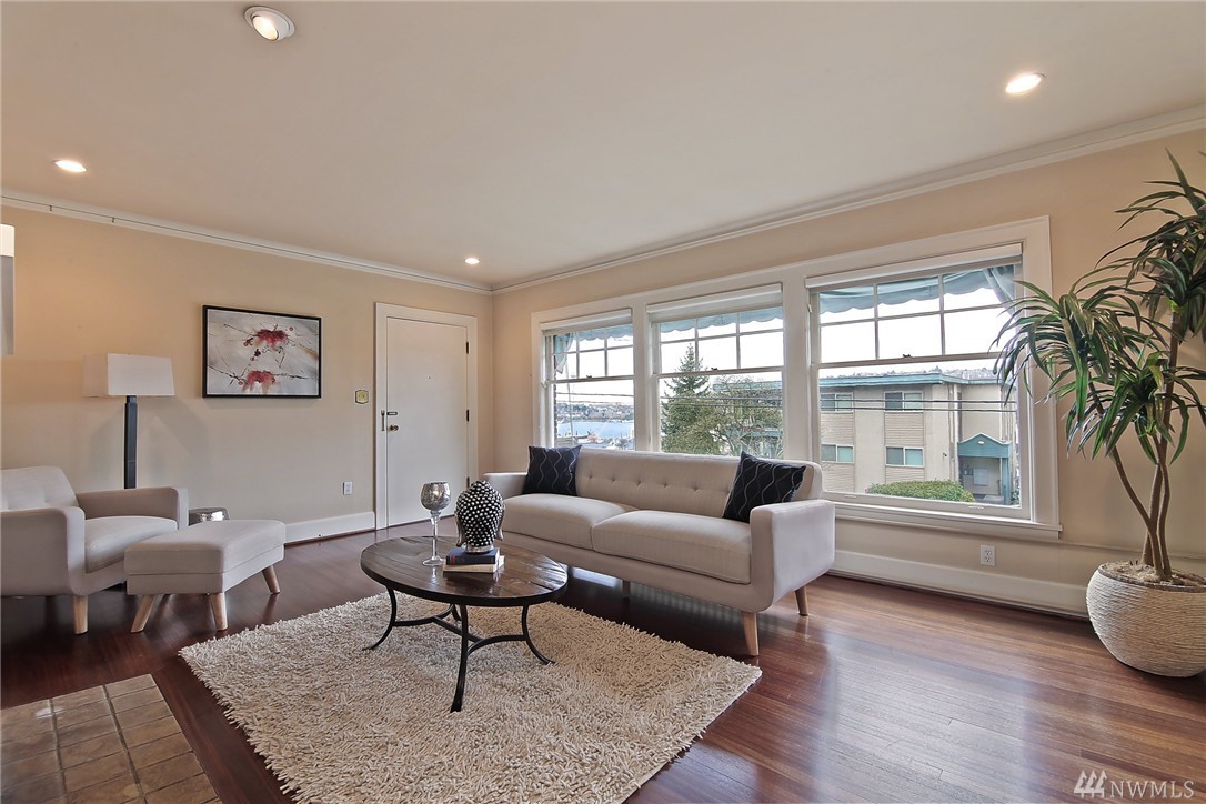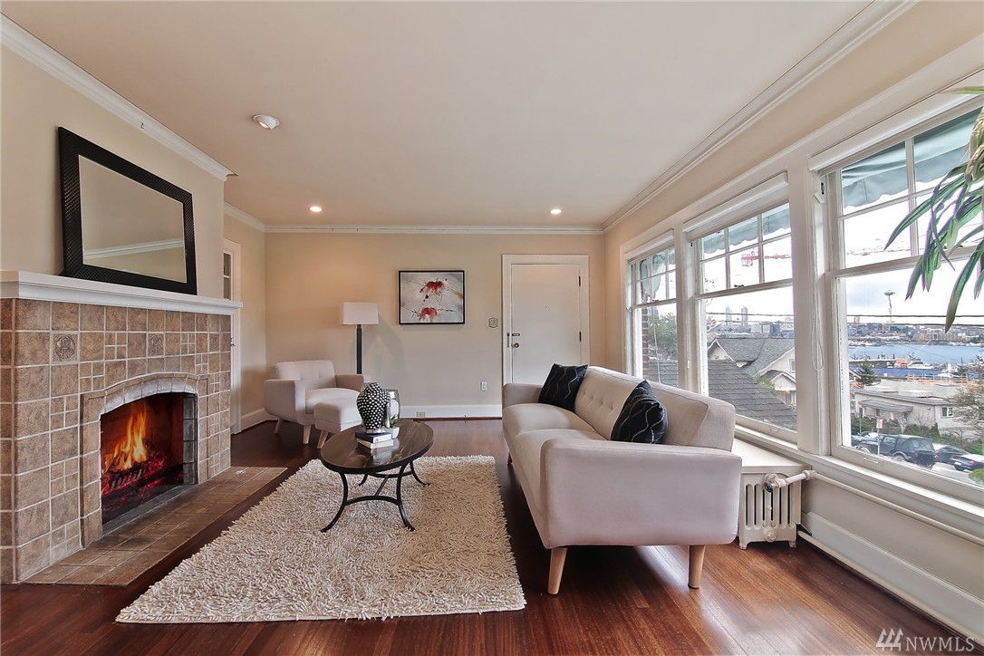 Elegant condo with charm and views. Welcome home to Mahogany hardwood floors and cozy Batchelder FP. The living room flows into dining room. Kitchen offers SS appliance and VIKING stove. Large bedroom on main, excellent storage and full bathroom. Open foyer/home office leads to door that opens to gated courtyard w/ BBQ. Upstairs you will love the light filled master suite with vaulted ceilings, abundant storage, skylights, W/D, master bath w/ tiled shower. Walk to SLU, cafes, bars, bus and lake.