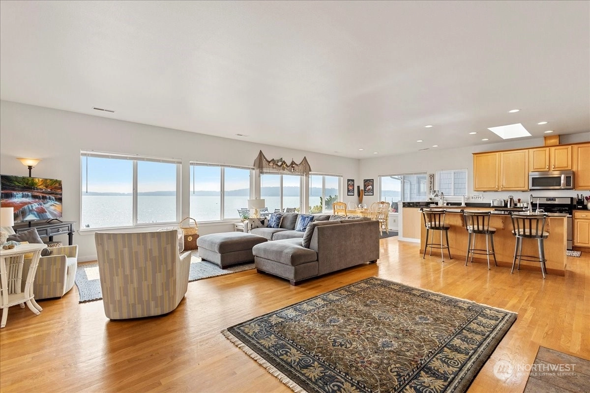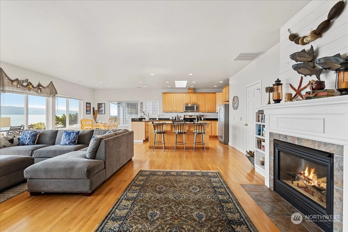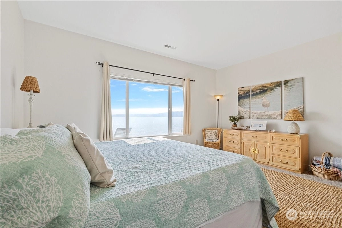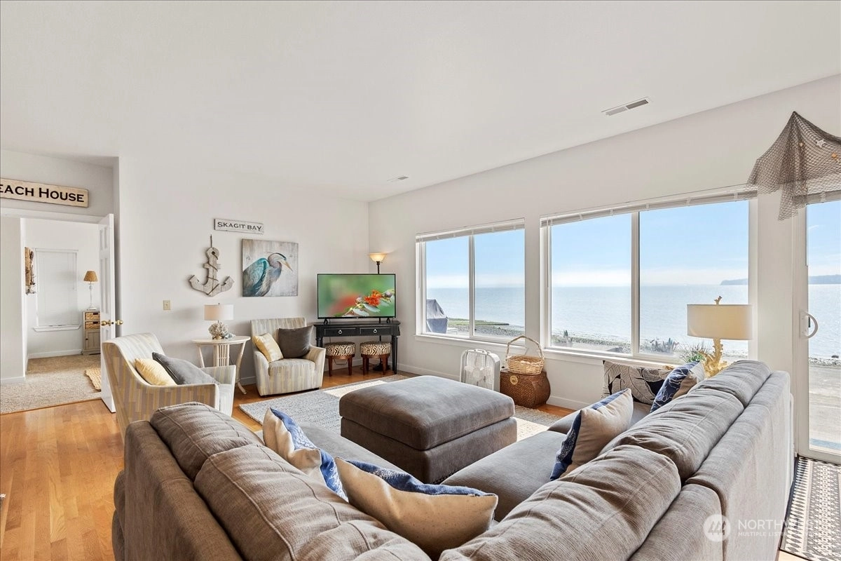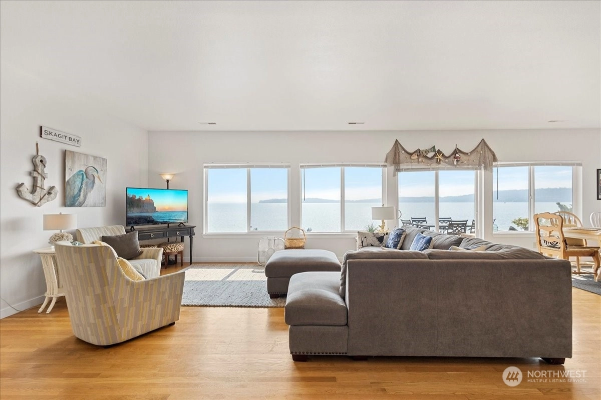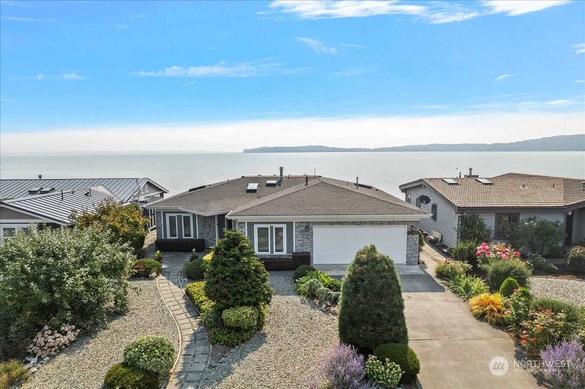Featured on HGTV's Beach Hunters! Welcome home to Mariners Cove! 60ft Waterfront! Soak up the mesmerizing panoramic views of Saratoga Passage, Cascade & Olympic mountains, & Skagit Bay from the kitchen, living room & primary bedroom. Custom built single level home with an open floor plan including spacious kitchen with granite counter and hardwood floors. Enjoy the spectacular view relaxing on your back patio or stroll the beach and go clamming/crabbing or boating. Picturesque neighborhood with a community dock, canals, & moorage!