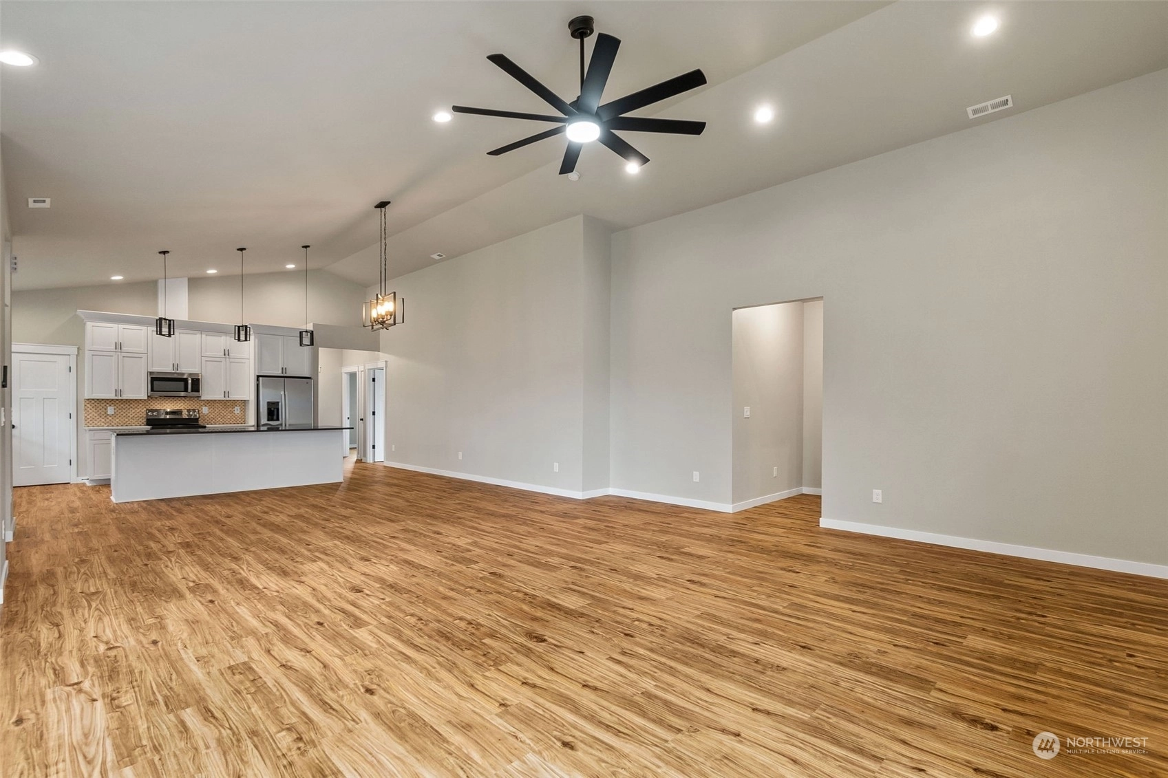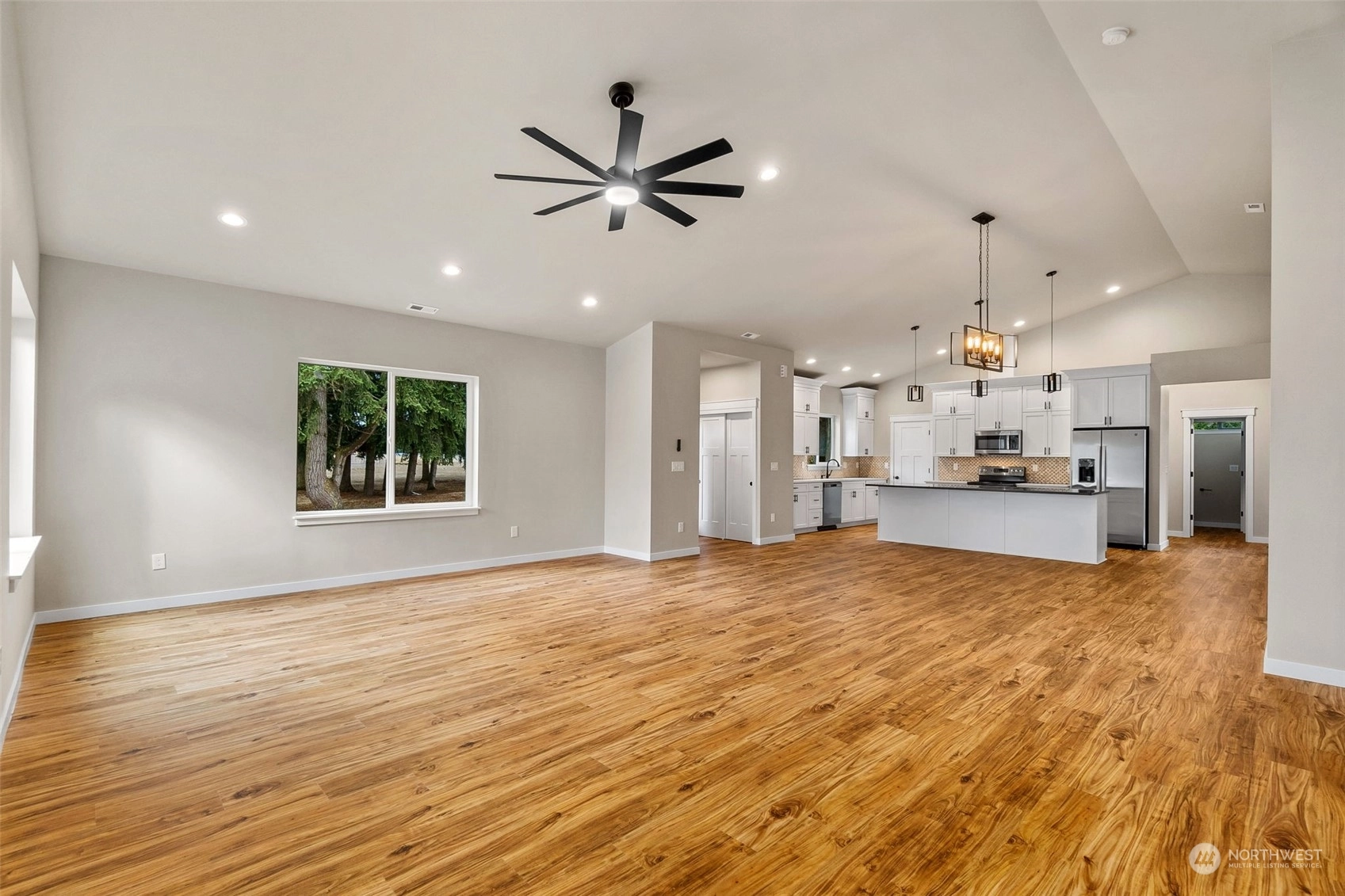 Move-in Ready, high-quality home built by local builders with all the bells and whistles! With over 2000+ SF, this rambler has tons of room for you to stretch out. Large kitchen with white painted cabinets and gorgeous crown molding, quart counters and upgraded stainless appliances (fridge too). All overlooking a huge great room with vaulted ceilings. Luxury vinyl plank flooring throughout the whole home! Primary suite has a walk-in closet and beautiful bath with a full tile walk-in shower with glass door. Forced air furnace with a heat pump, oversize 2-car garage plus tons storage and driveway parking. Located at the end of a dead-end street and the County owns the property to the west for extra privacy.
