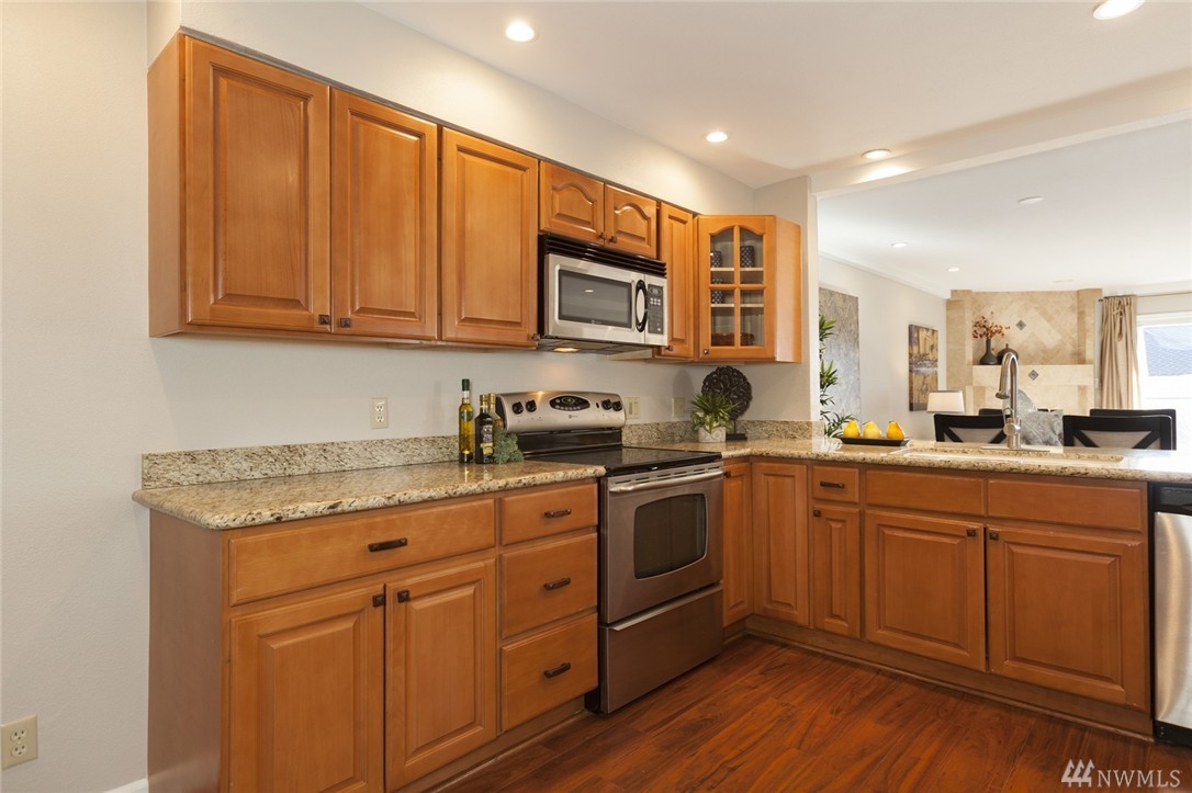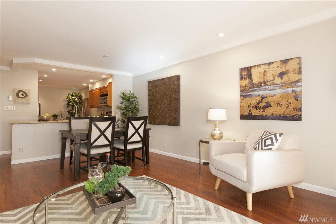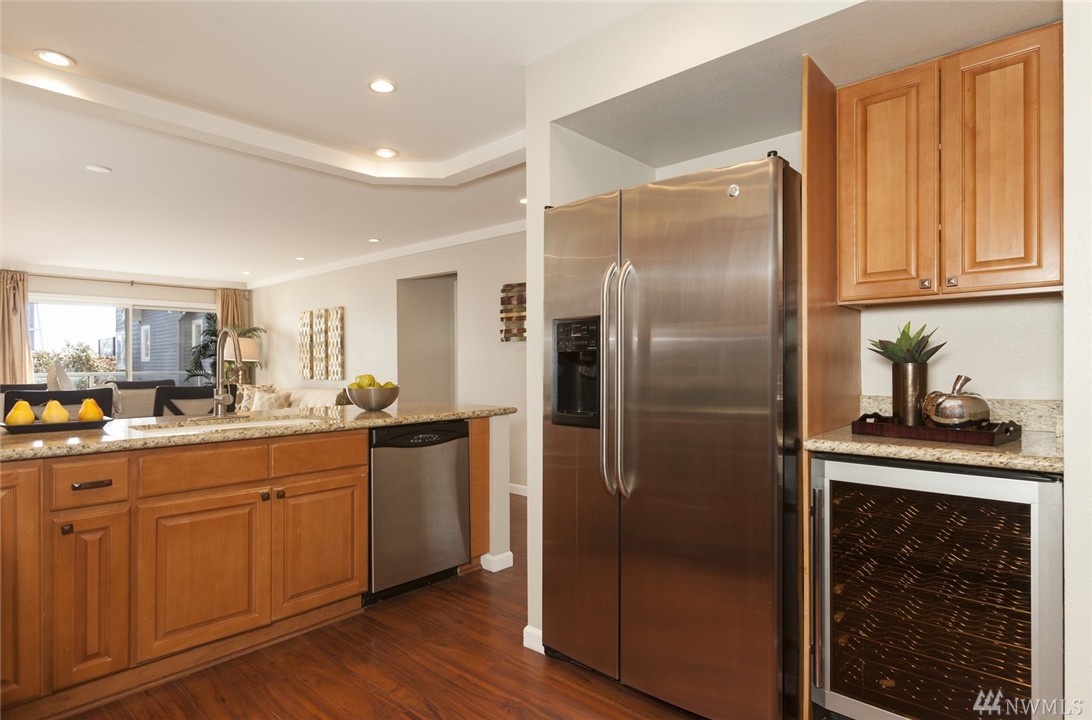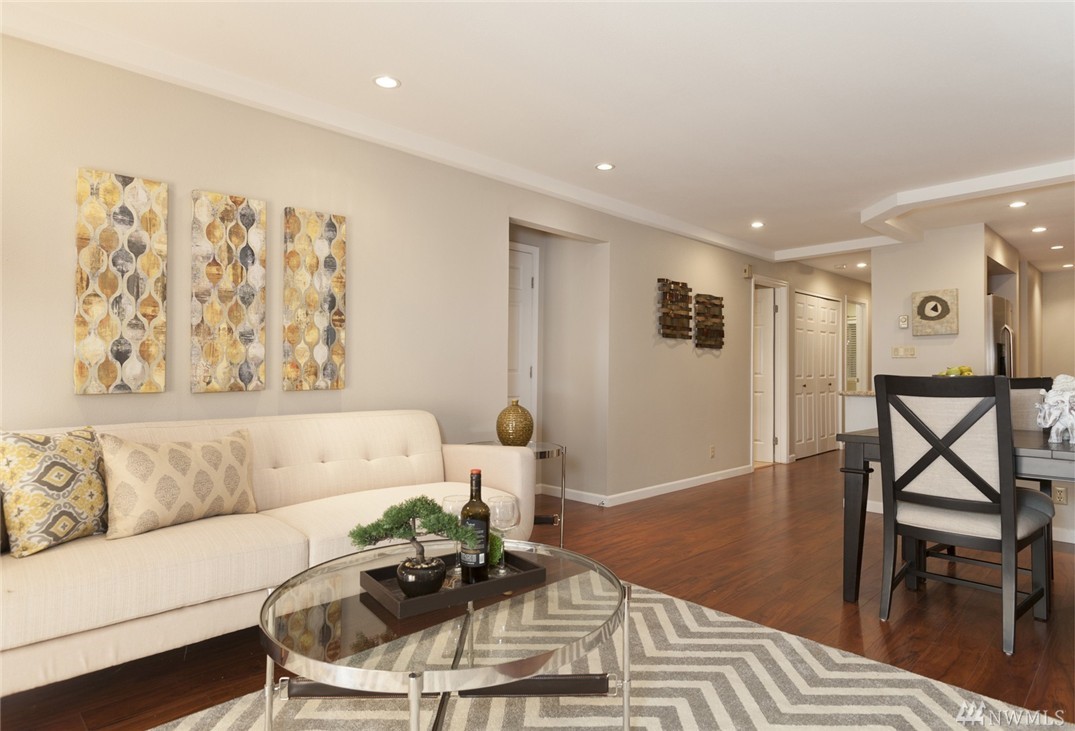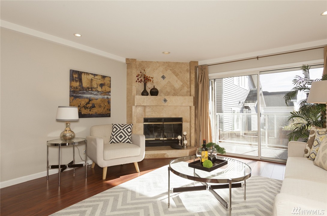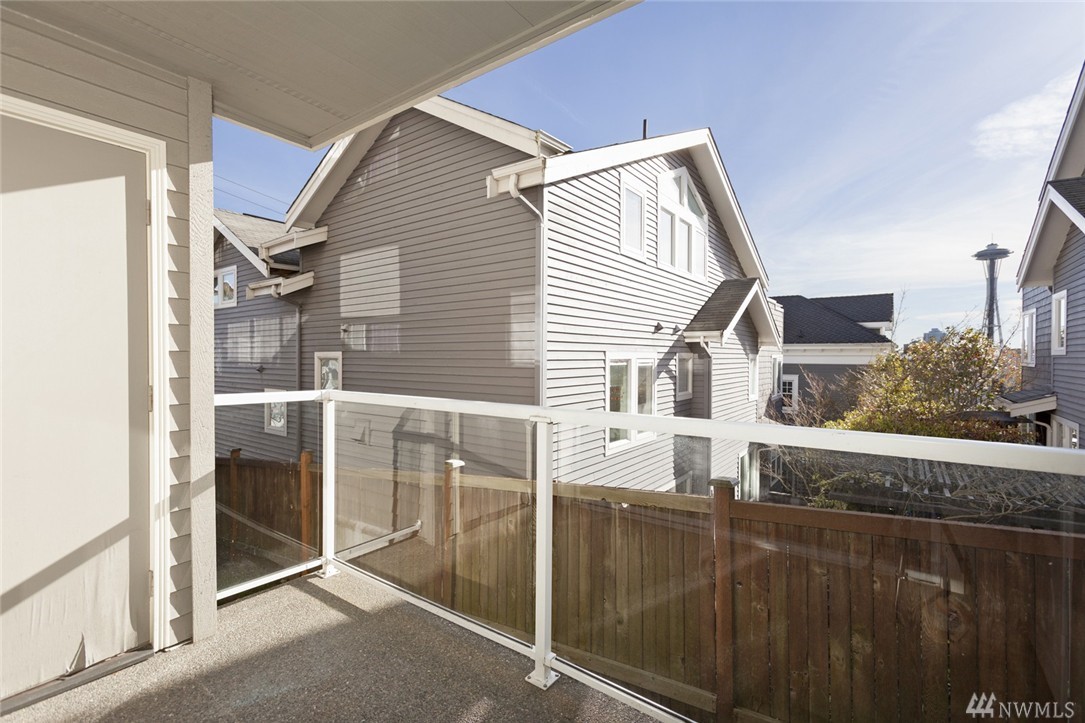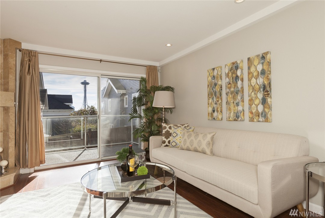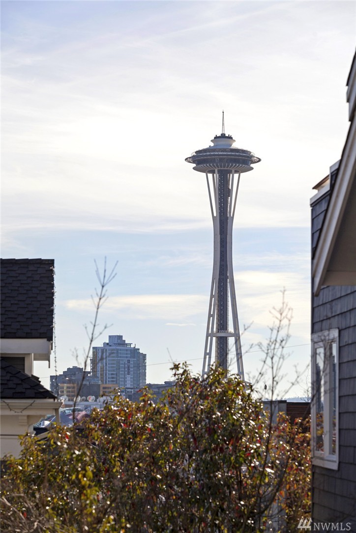Enjoy this spectacular Queen Anne Condo located in the Renaissance. Dramatic view of the Space Needle from your deck and spacious living room. This entertainment friendly floor plan also features your own laundry room. Unit includes wood burning fireplace, large pantry, ample amount of closet space, double-pane windows, wine cooler and a secured entry. 1 secured parking space with storage in the garage and on your patio. Walking distance to Seattle Center and great restaurants & shops.