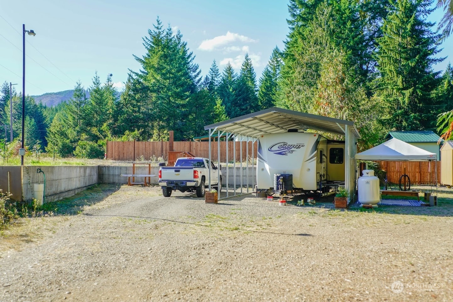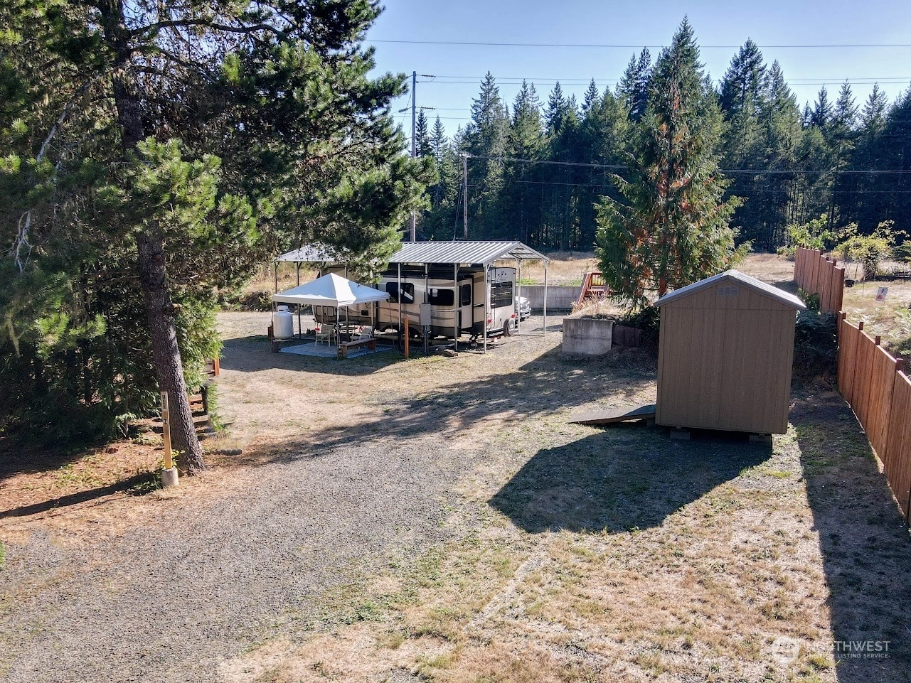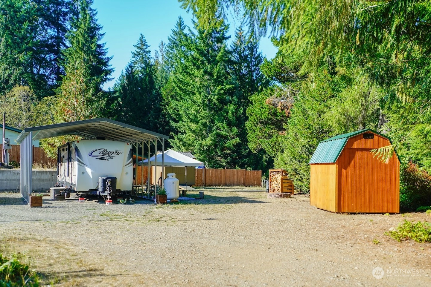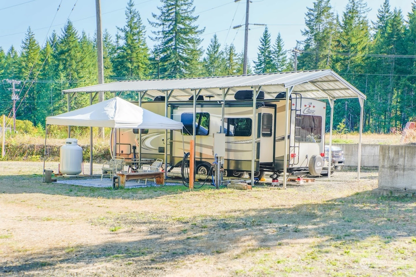 On a quiet street in Division 18, this lot has water, power and 2 bd septic. It is level, but with tiered layout that includes 2 full RV hookups, one on each portion of this plug and play lot. Included is a 32x18 ft steel carport, nice outbuilding and wood storage. Just a short distance to private community access to Lake Cushman, several parks and nearby hiking and recreational activities.