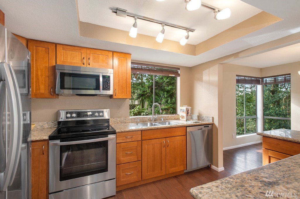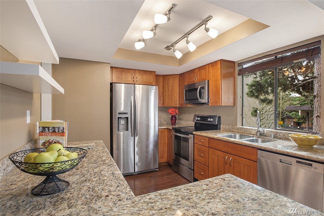 Remodeled 2 bdrm home in excellent location! Newer hardwood flooring on main, remodeled kitchen w/ slab granite counters, stainless appliances & new cabinets. Remodeled bathrooms, newer furnace, lots of storage. Refrigerator, washer & dryer convey. Tucked away overlooking landscaping, yet a short walk to Houghton, dwntwn Kirkland. Trails close by, easy Bellevue/Seattle commute. Great HOA, outdoor pool, basketball/tennis courts, club house. Park & Ride & Cross Kirkland Corridor trail close by.