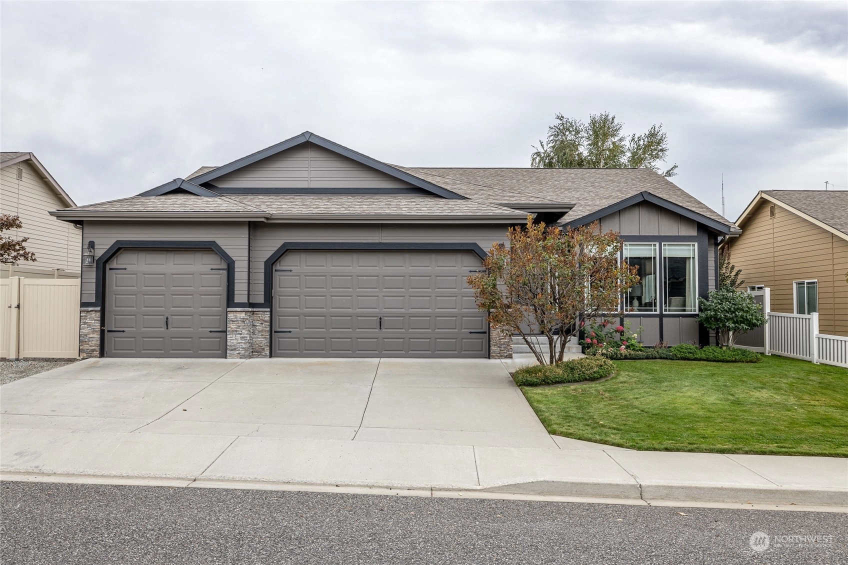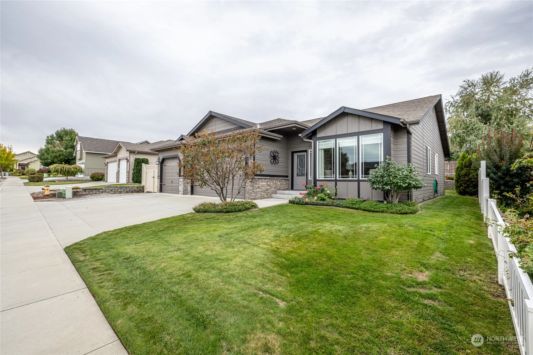 Meticulous, move-in ready rambler with 3 car garage AND RV/toy parking behind fence. Quality home, built in 2009, with timeless finishes - offers 3 bed/2 bath + den. The living room is spacious with vaulted ceilings while the adjacent kitchen/dining welcomes you with white cabinetry, granite counters, island, and large windows. Easy access out to the large patio to relax or entertain. Enjoy the peaceful primary suite with walk-in closet, double vanity, and soaking tub. All appliances stay with the home. Backyard is perfectly sized - designed for easy maintenance with in ground sprinklers and irrigation water. New shed stays.