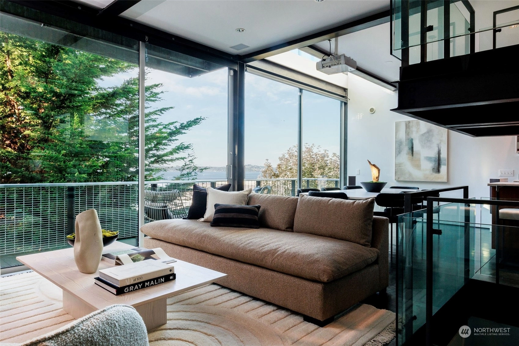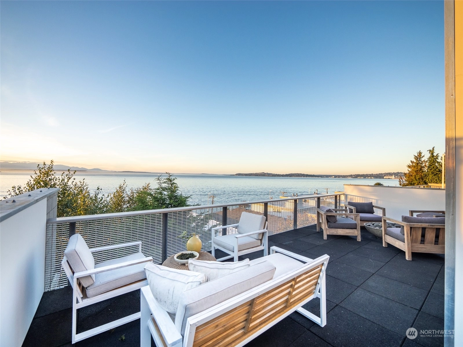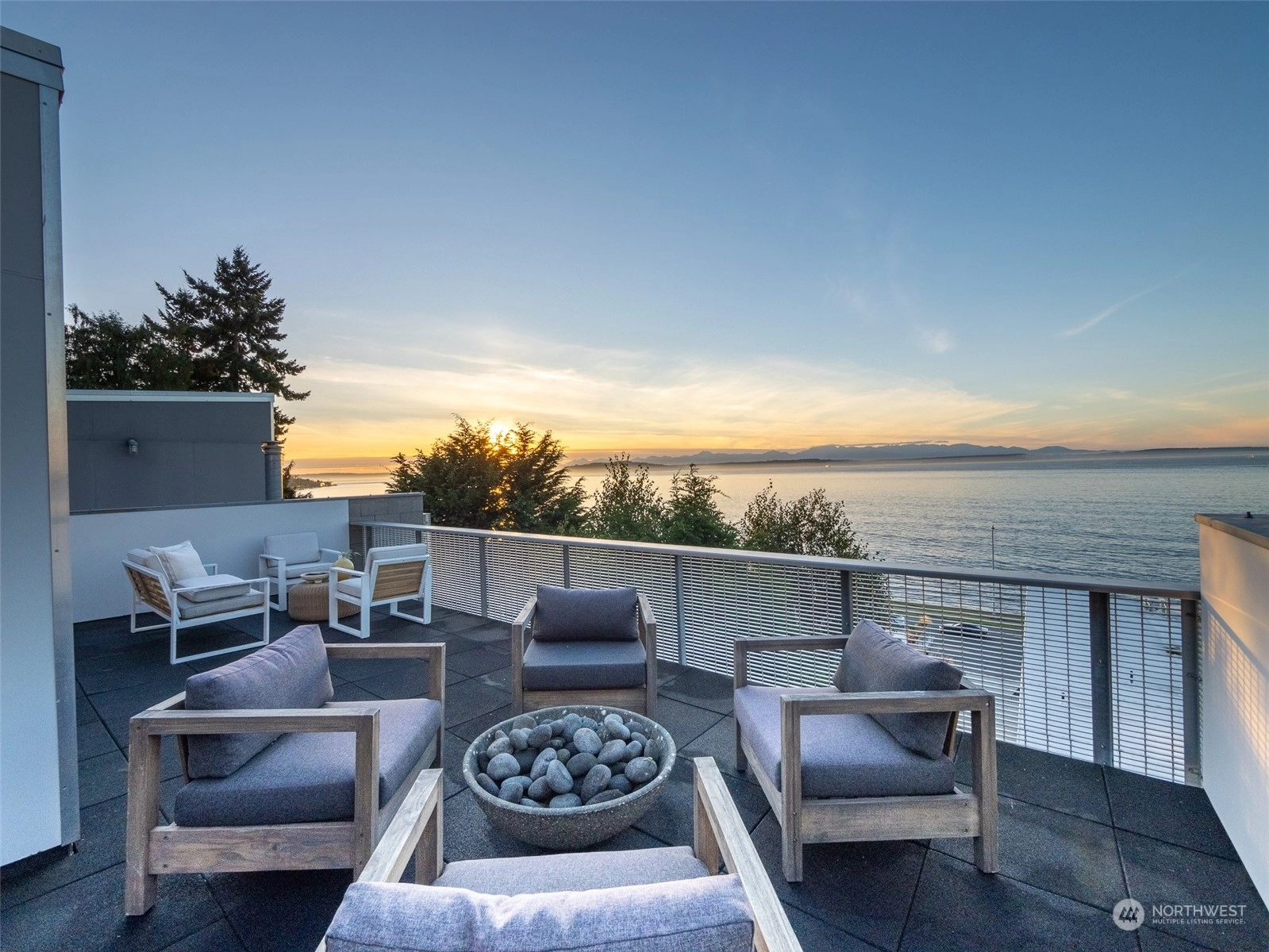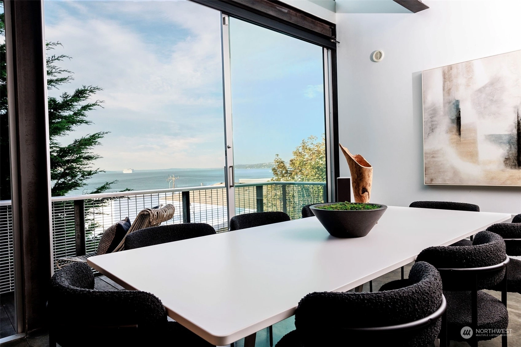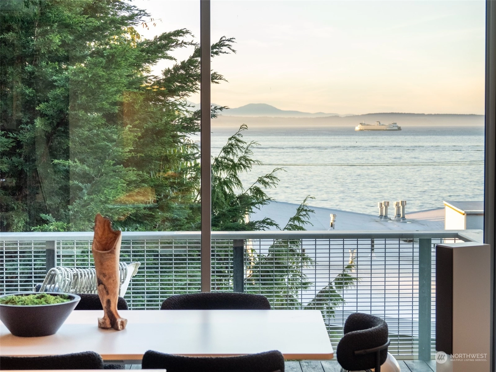 Minimalist and arresting, best describe this AIA award-winning Eric Cobb-designed residence. Timeless materials throughout, including, concrete, exposed steel and glass, complimented by rich cabinetry, fixtures & surfaces. Dramatic steel & glass double height staircase frames the show stopping view. Multiple terraces to take advantage of the Sunsets, Olympic Mountains and the magnificent views overlooking the Salish Sea. The rooftop terrace is truly sublime. Additionally, this home lives on three levels plus the rooftop terrace along with a drive-in view garage. This space is finished and could be considered flex space. This is loft living at its best!