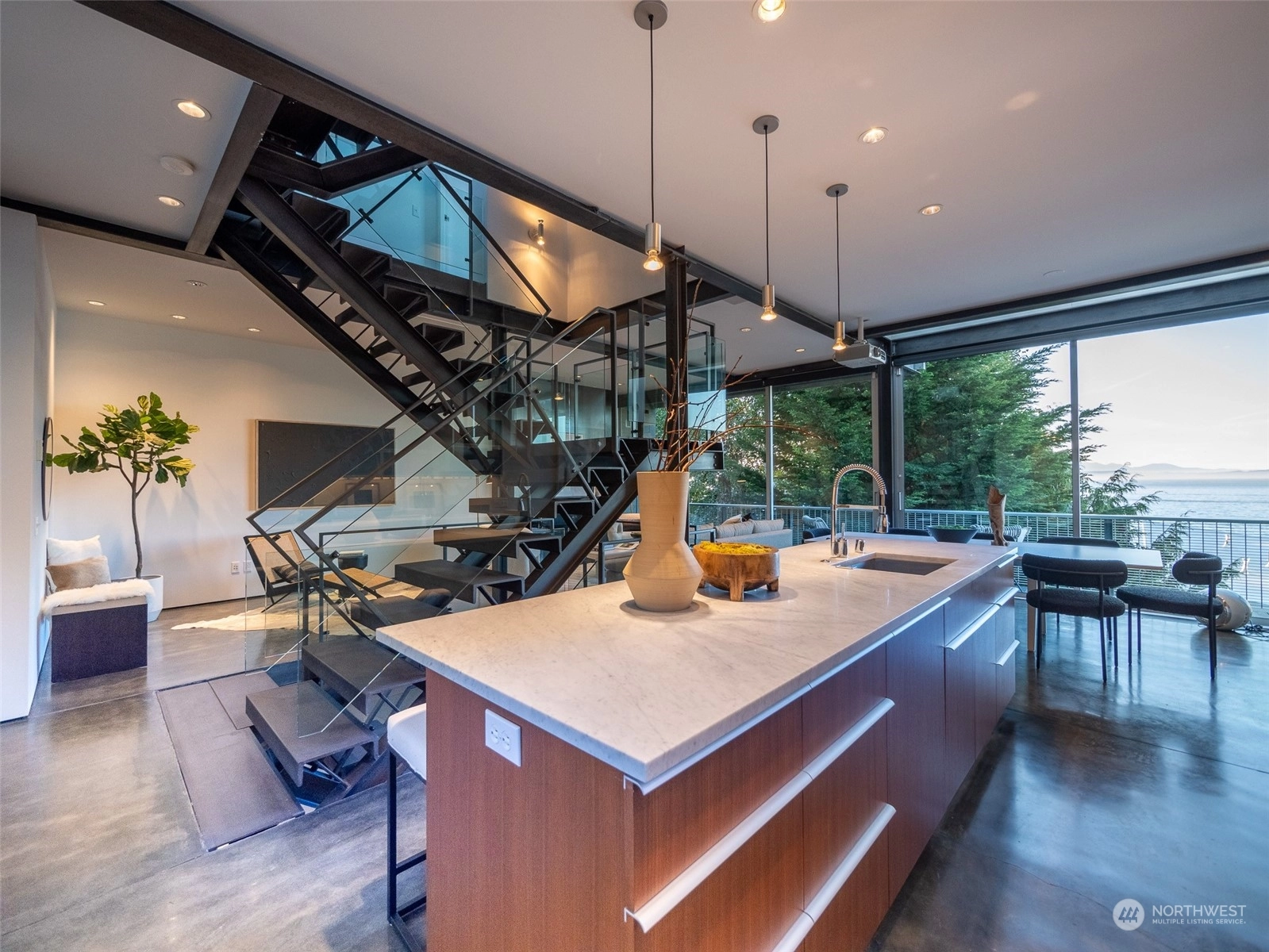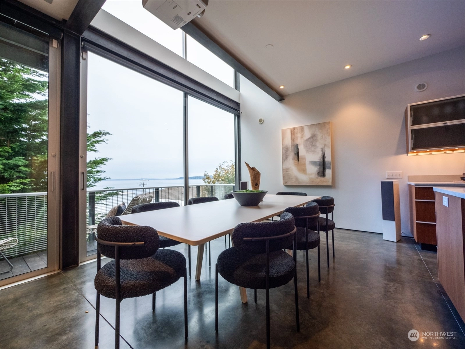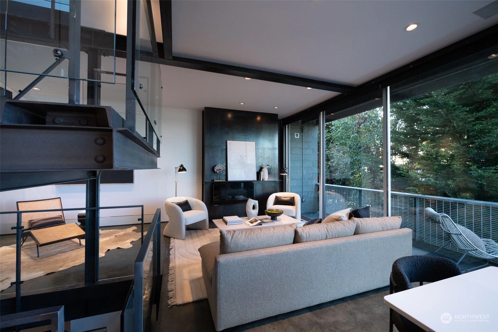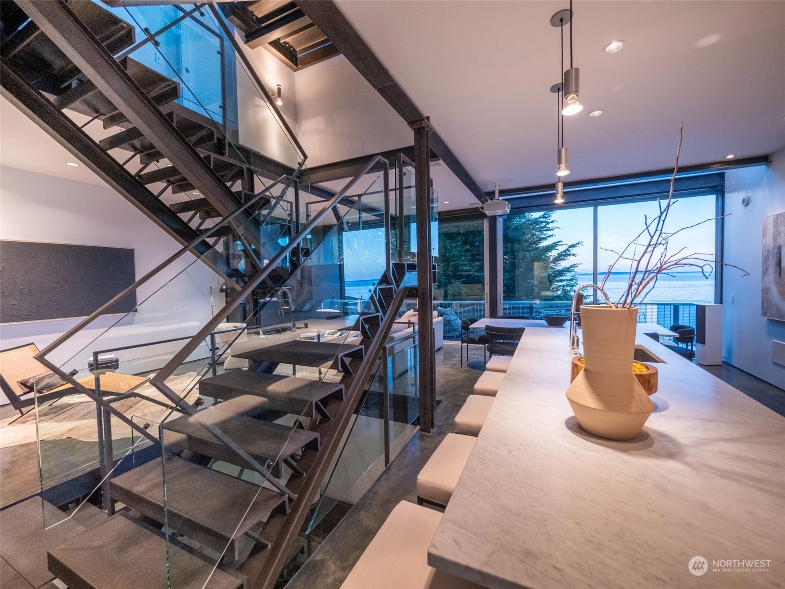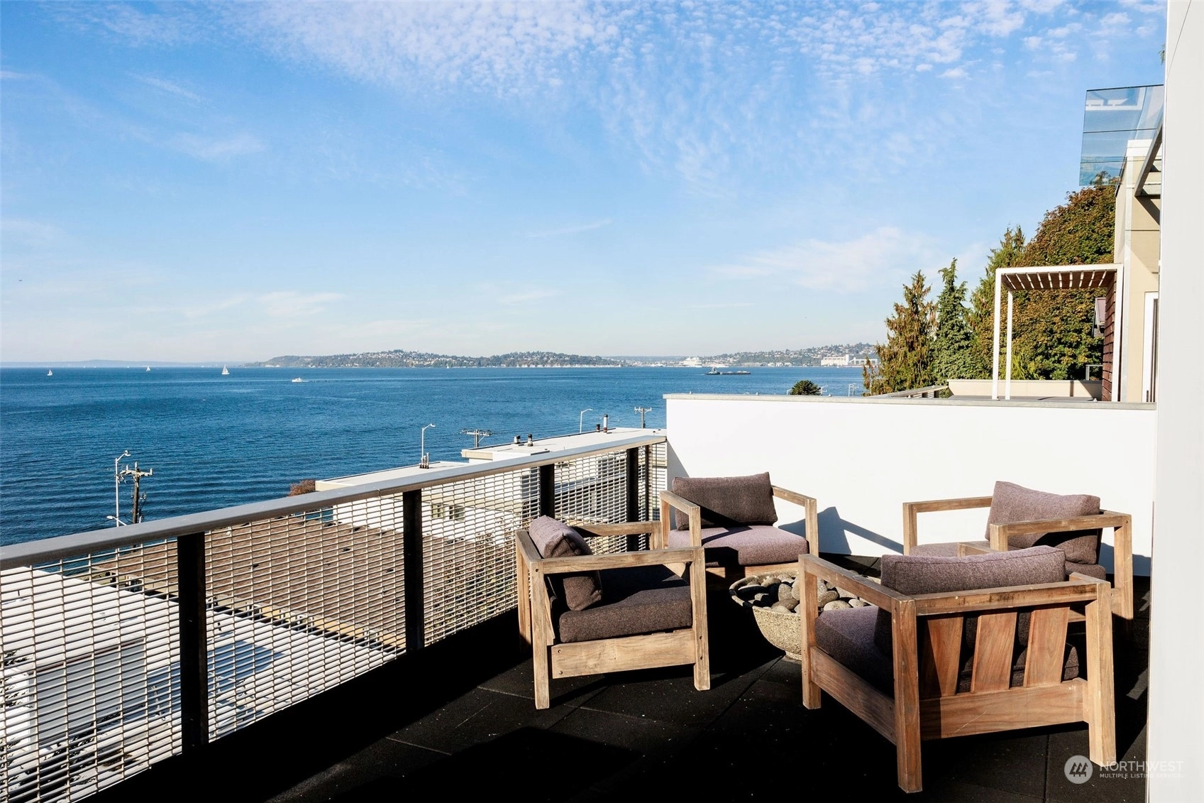 Minimalist and arresting, best describe this AIA award-winning Eric Cobb-designed residence. Timeless materials throughout, including, concrete, exposed steel and glass, complimented by rich cabinetry, fixtures & surfaces. Dramatic steel & glass double height staircase frames the show stopping view. Multiple terraces to take advantage of the Sunsets, Olympic Mountains and the magnificent views overlooking the Salish Sea. The rooftop terrace is truly sublime. Additionally, this home lives on three levels plus the rooftop terrace along with a drive-in view garage. This space is finished and could be considered flex space. This is loft living at its best!