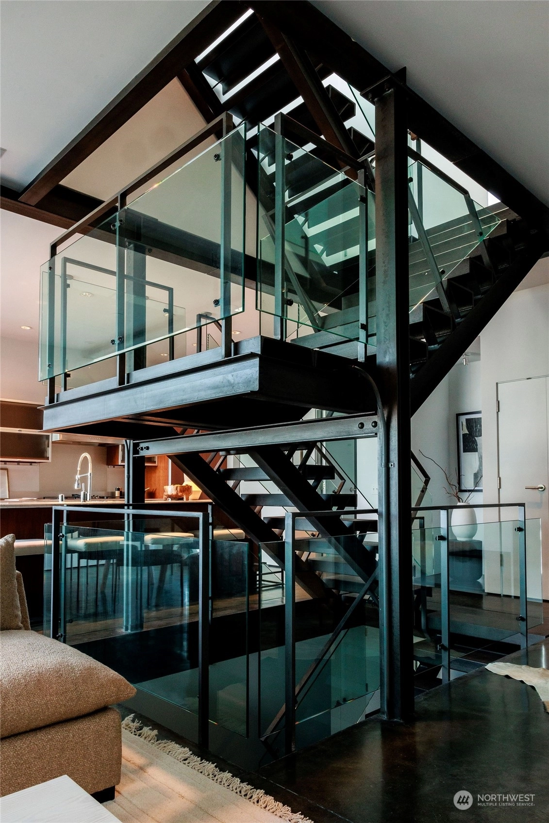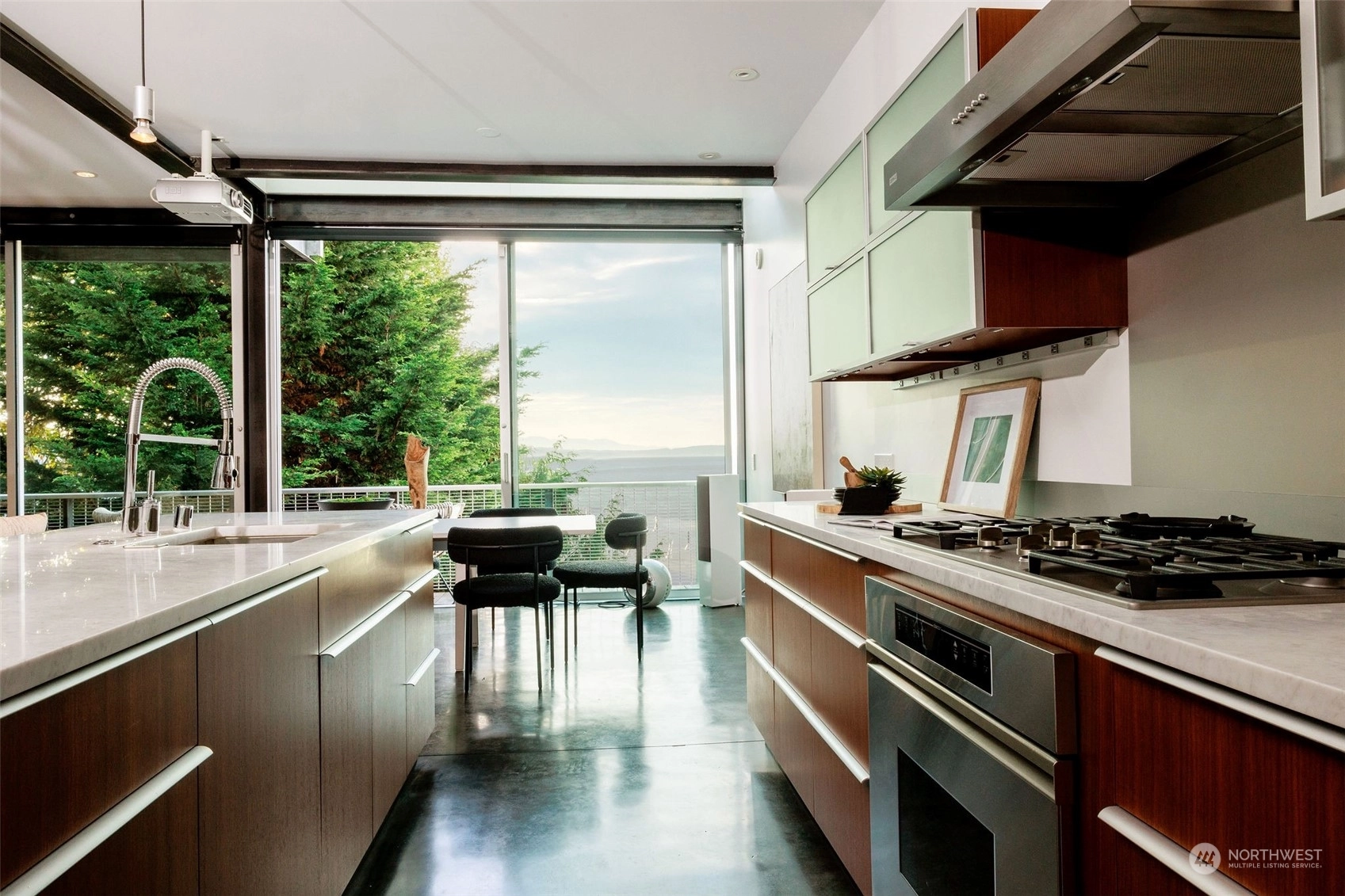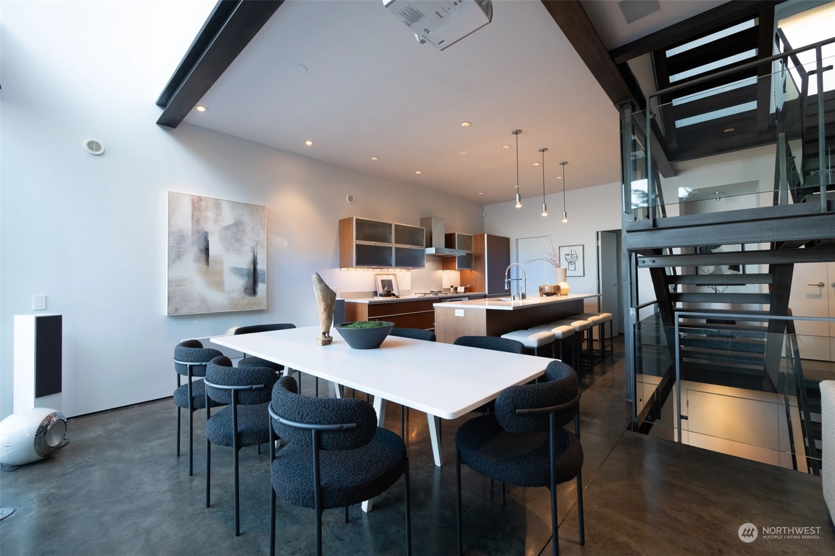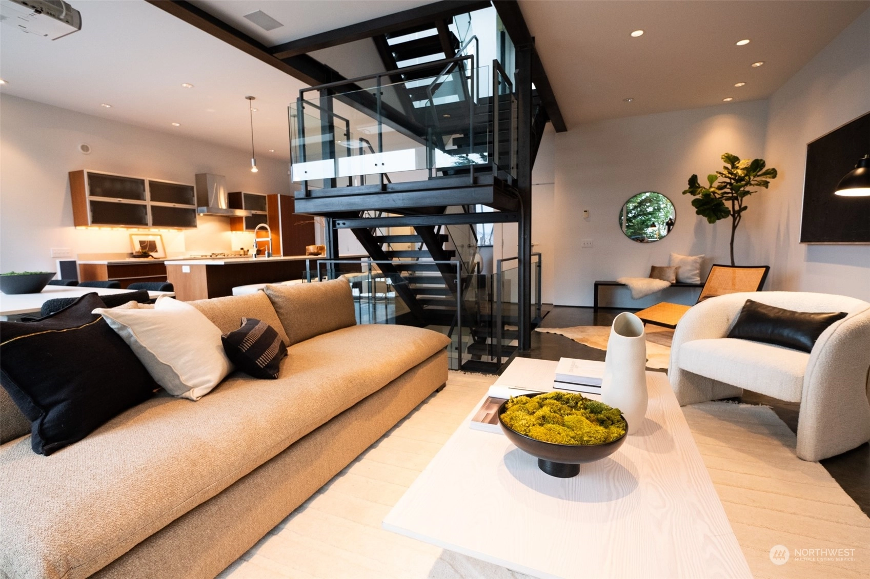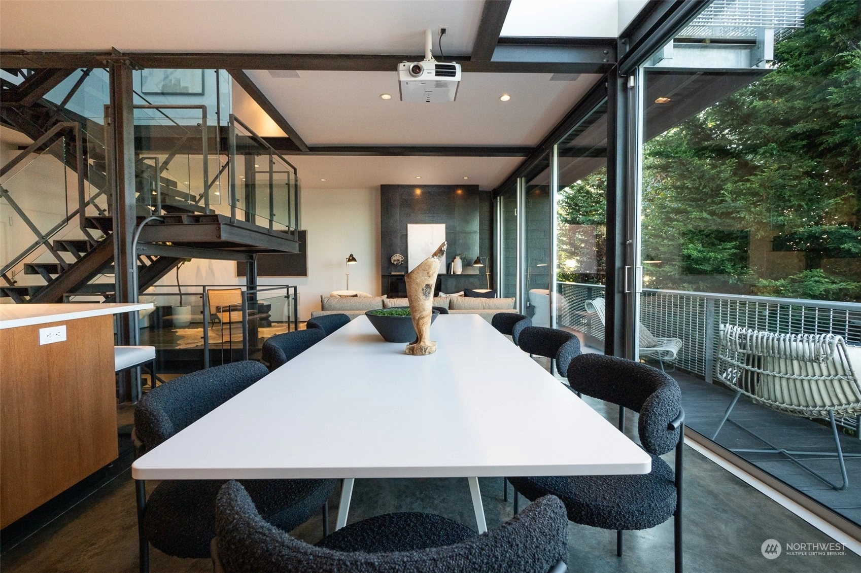 Minimalist and arresting, best describe this AIA award-winning Eric Cobb-designed residence. Timeless materials throughout, including, concrete, exposed steel and glass, complimented by rich cabinetry, fixtures & surfaces. Dramatic steel & glass double height staircase frames the show stopping view. Multiple terraces to take advantage of the Sunsets, Olympic Mountains and the magnificent views overlooking the Salish Sea. The rooftop terrace is truly sublime. Additionally, this home lives on three levels plus the rooftop terrace along with a drive-in view garage. This space is finished and could be considered flex space. This is loft living at its best!