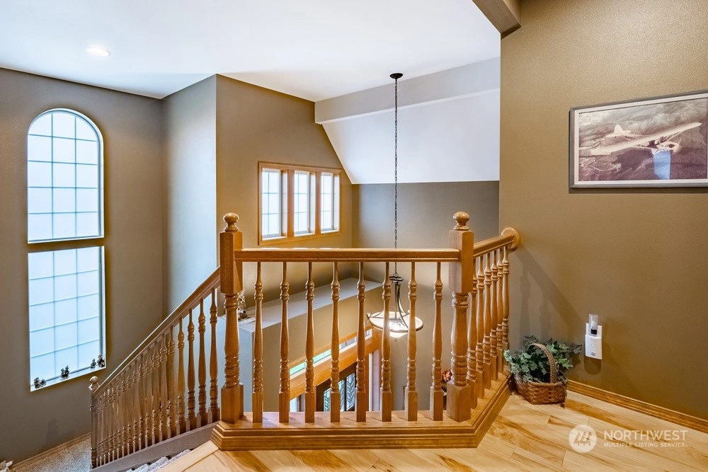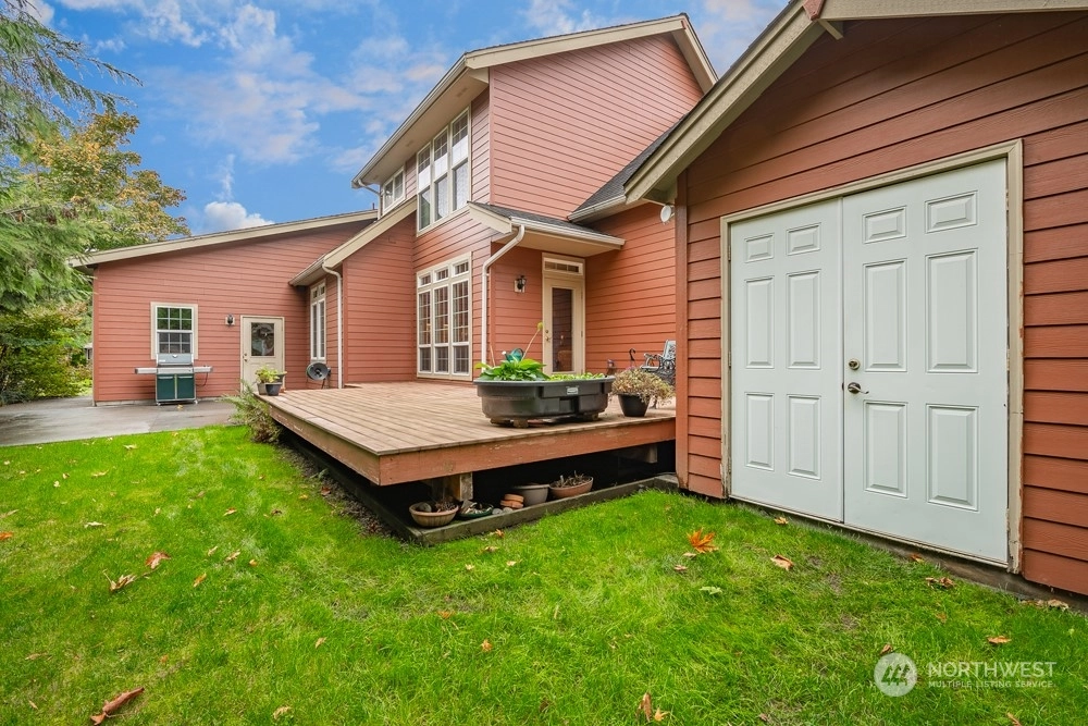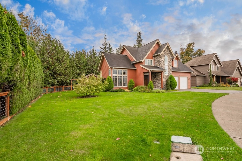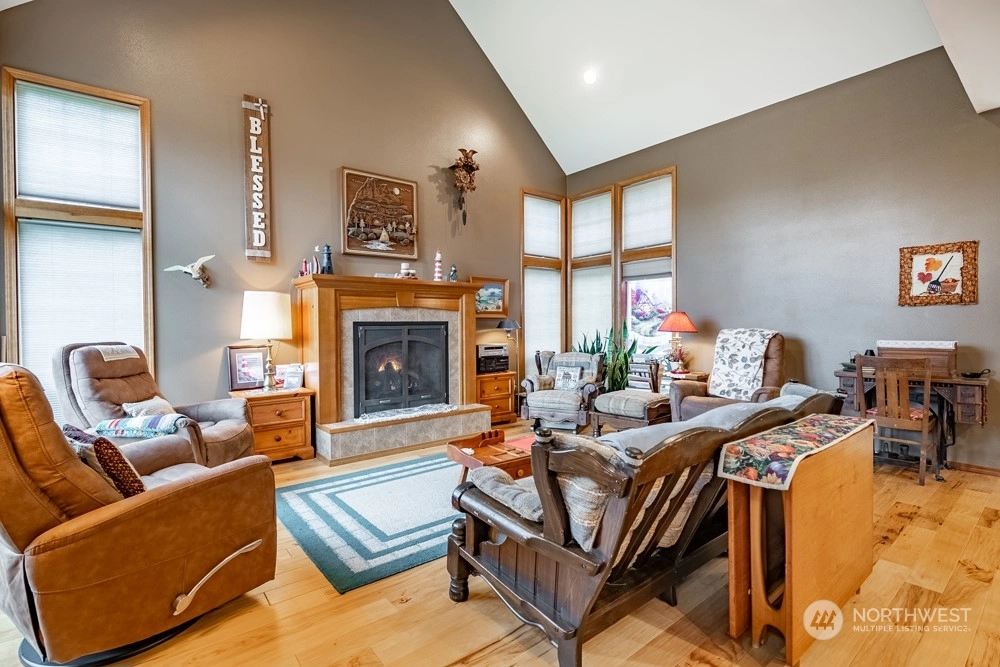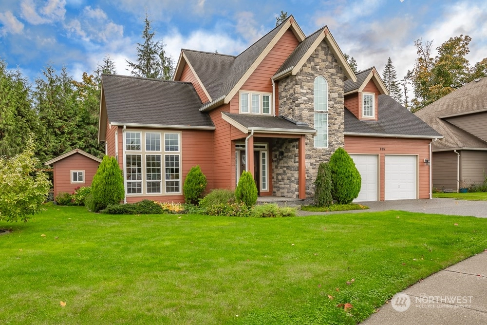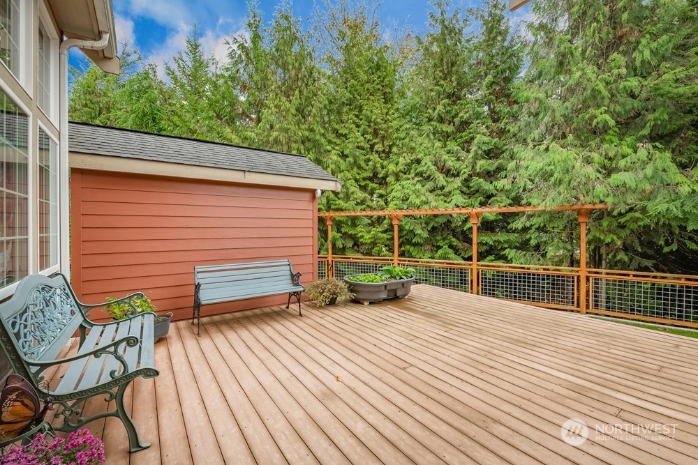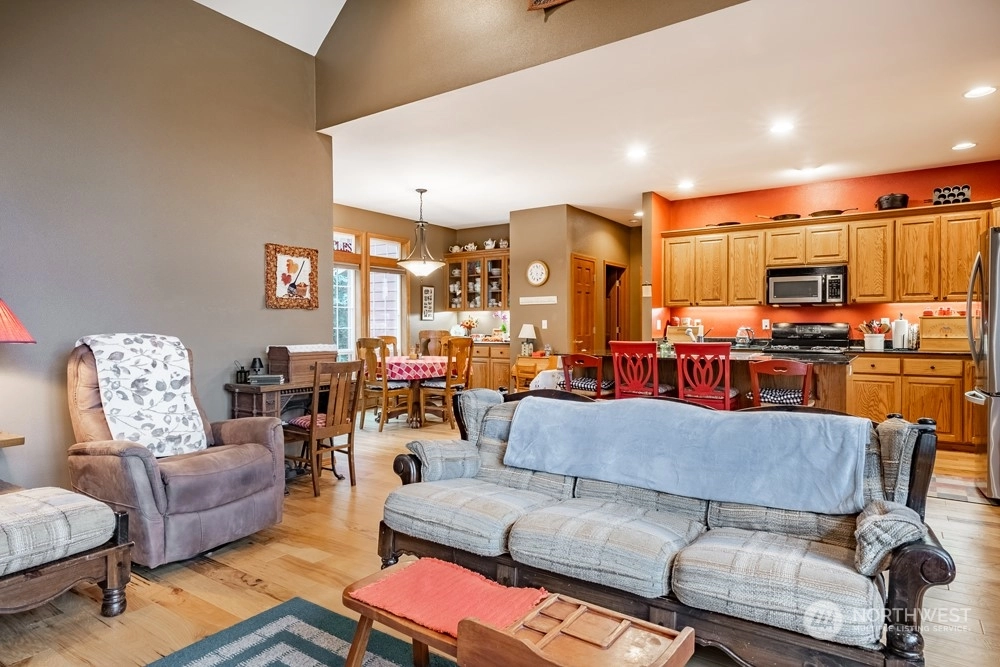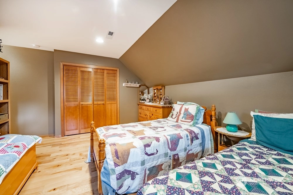This meticulously maintained 4-bedroom home offers low maintenance and is move-in ready. The warm and inviting open living room seamlessly connects to the kitchen and dining area, providing easy access to the expansive deck and patio. Main level bedroom and 3 more upstairs. The hickory wood floors add a touch of elegance throughout. Features include vaulted ceilings, a sprinkler system, walk-in closet, generator wiring, and large windows with transoms that flood the home with natural light. The 4th bedroom is large enough to be a bonus room. 3-car garage along with an attached 15 x 15 insulated and heated shop. There is also a detached garden shed. The backyard is adorned with trees and pathways leading down to a seasonal creek and fire pit