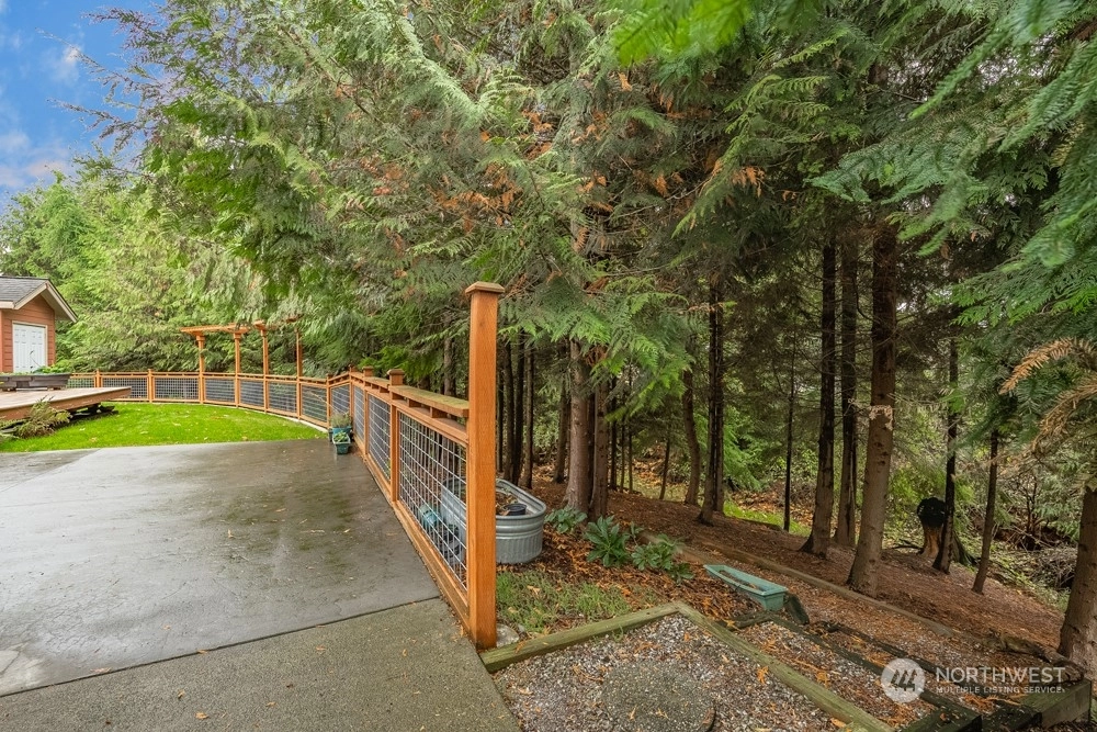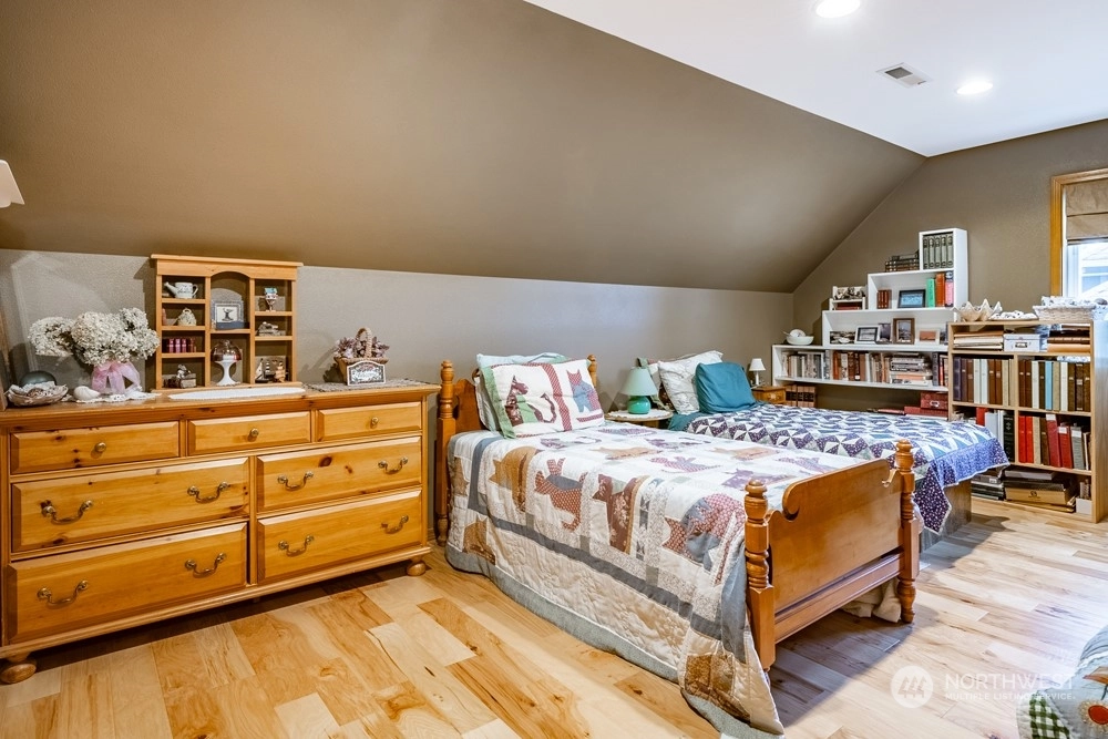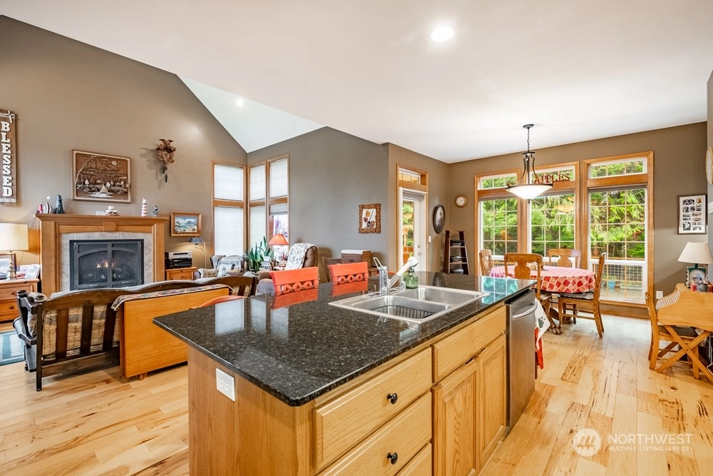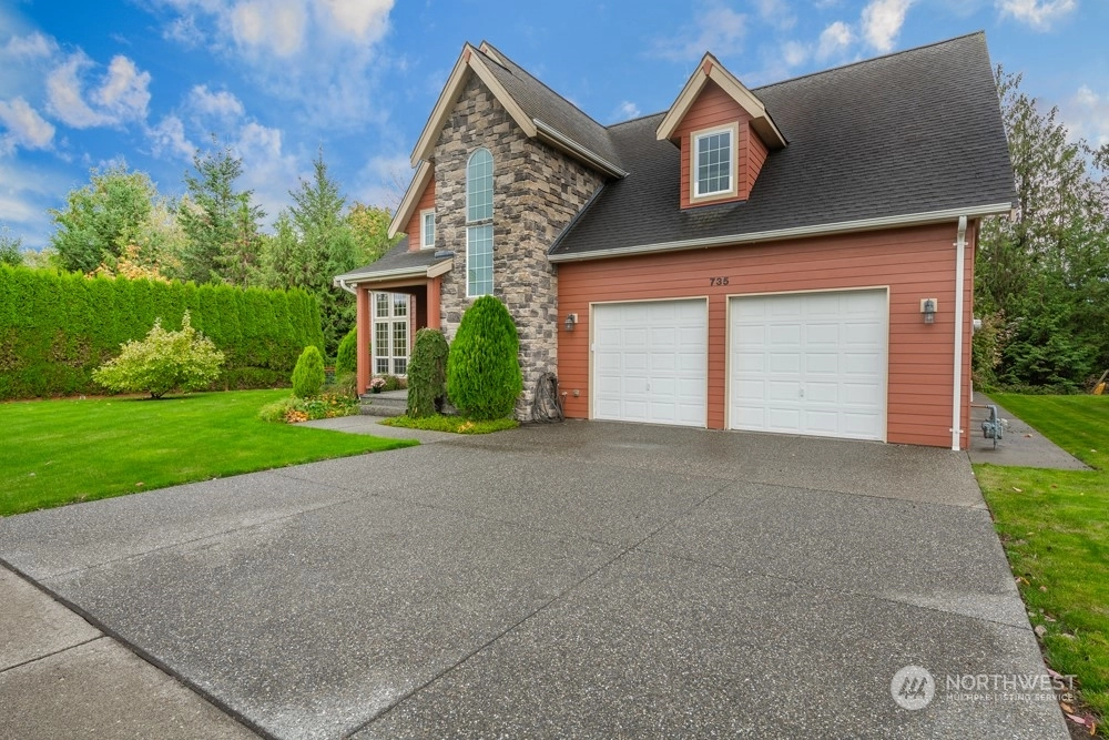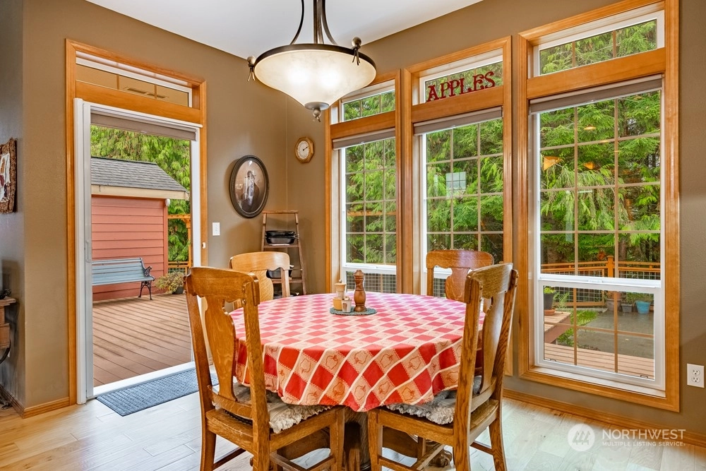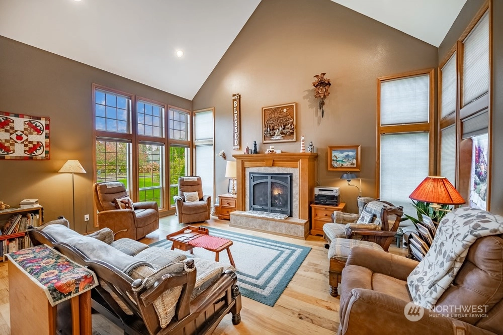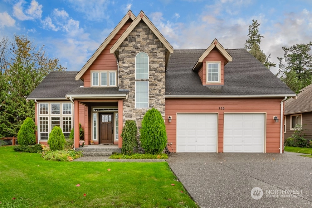 This meticulously maintained 4-bedroom home offers low maintenance and is move-in ready. The warm and inviting open living room seamlessly connects to the kitchen and dining area, providing easy access to the expansive deck and patio. Main level bedroom and 3 more upstairs. The hickory wood floors add a touch of elegance throughout. Features include vaulted ceilings, a sprinkler system, walk-in closet, generator wiring, and large windows with transoms that flood the home with natural light. The 4th bedroom is large enough to be a bonus room. 3-car garage along with an attached 15 x 15 insulated and heated shop. There is also a detached garden shed. The backyard is adorned with trees and pathways leading down to a seasonal creek and fire pit