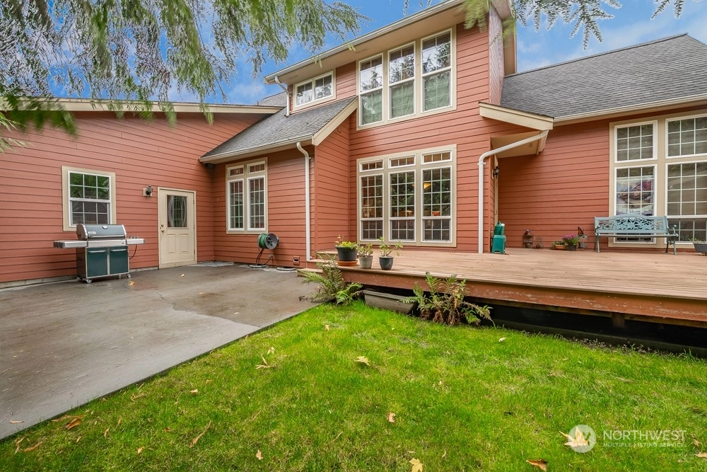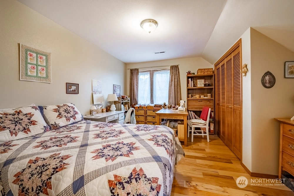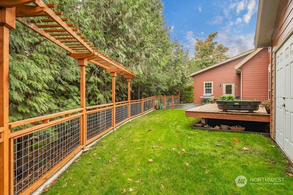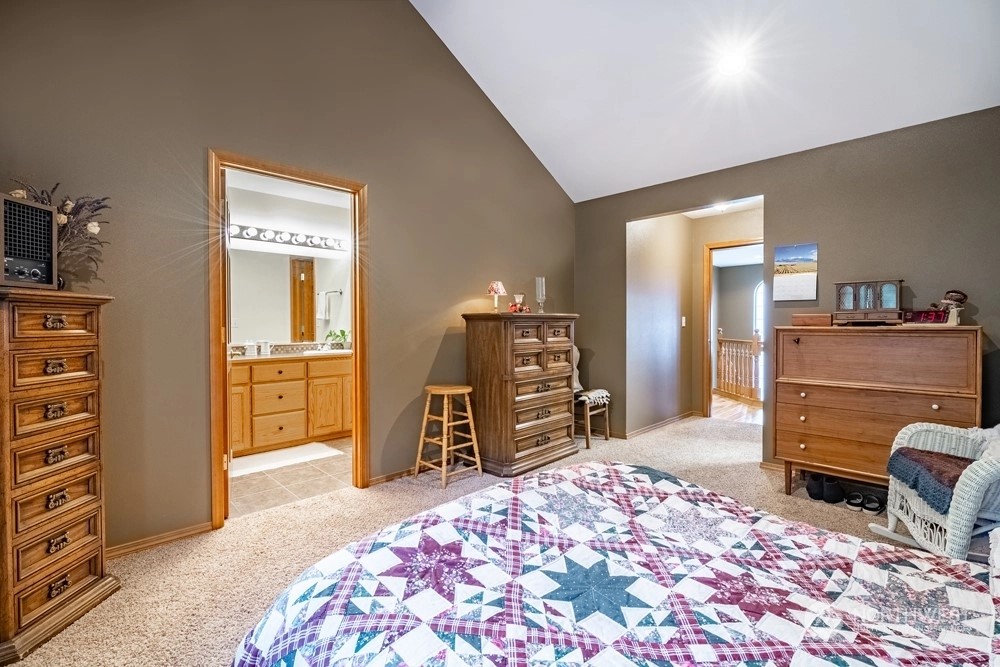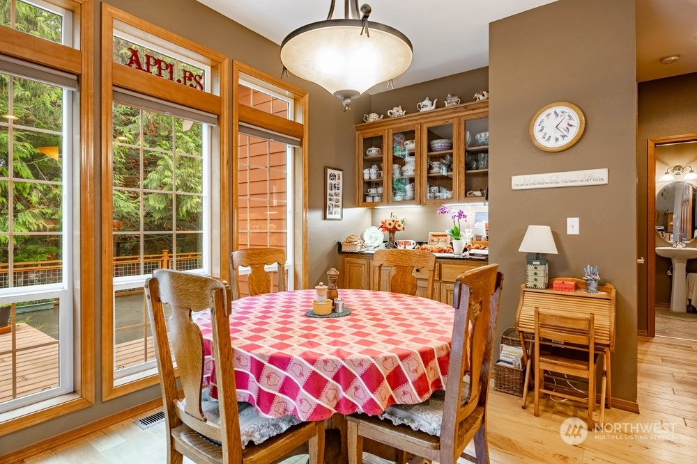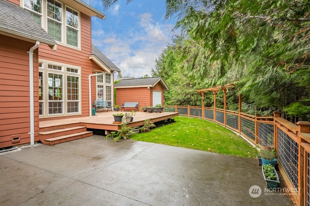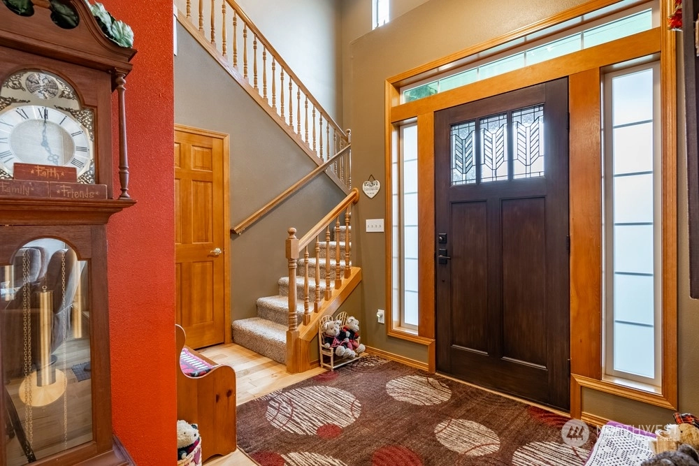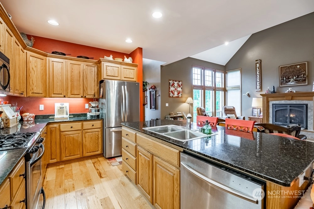 This meticulously maintained 4-bedroom home offers low maintenance and is move-in ready. The warm and inviting open living room seamlessly connects to the kitchen and dining area, providing easy access to the expansive deck and patio. Main level bedroom and 3 more upstairs. The hickory wood floors add a touch of elegance throughout. Features include vaulted ceilings, a sprinkler system, walk-in closet, generator wiring, and large windows with transoms that flood the home with natural light. The 4th bedroom is large enough to be a bonus room. 3-car garage along with an attached 15 x 15 insulated and heated shop. There is also a detached garden shed. The backyard is adorned with trees and pathways leading down to a seasonal creek and fire pit