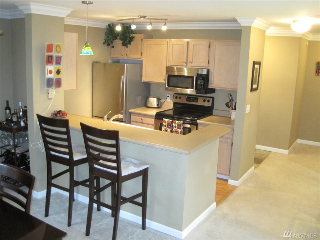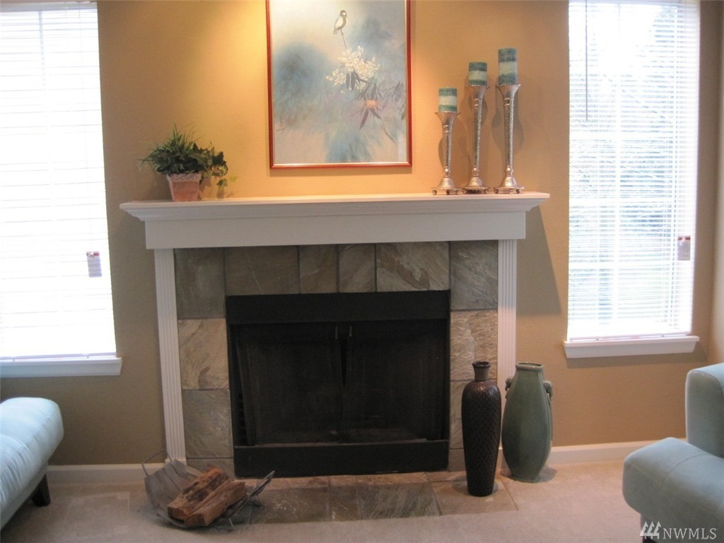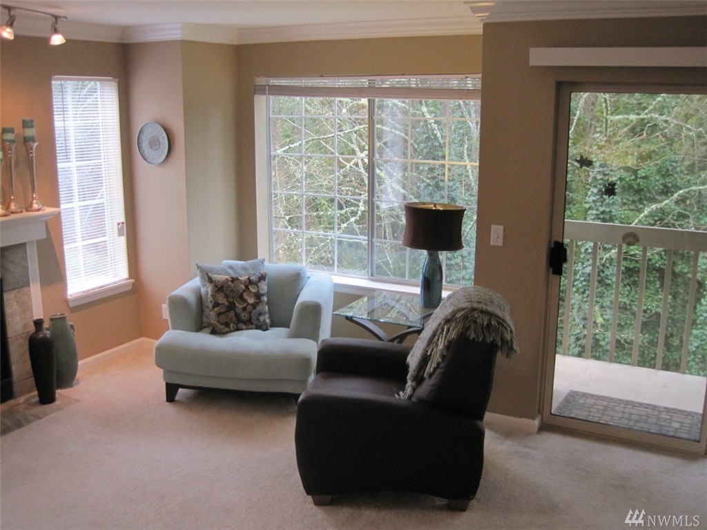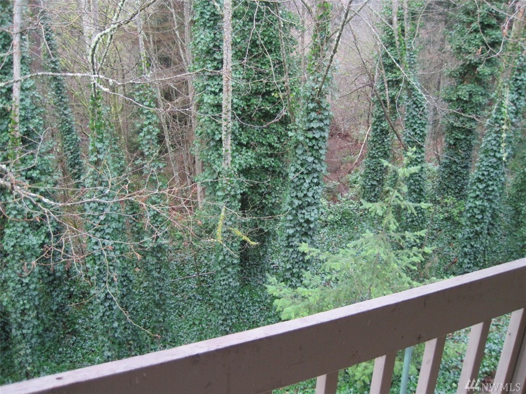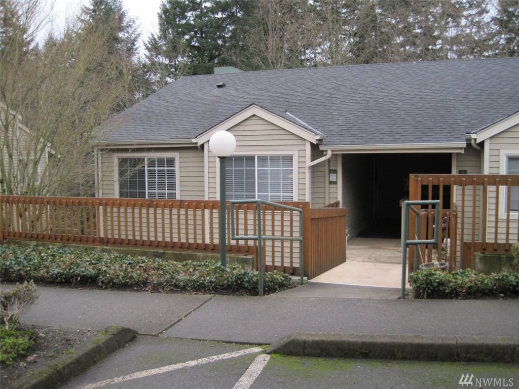 Top floor end unit with no stairs and backs to greenbelt for privacy. Slate entry opens to spacious living room with wood burning fireplace. Kitchen has stainless steel appliances and bamboo floor. Lots of windows brings in plenty of natural light. Bath has been updated with tile and accent paint. Both bedrooms have walk-in closets. All appliances included. Two covered parking spaces (41 & 42). HOA dues include water, sewer and garbage.