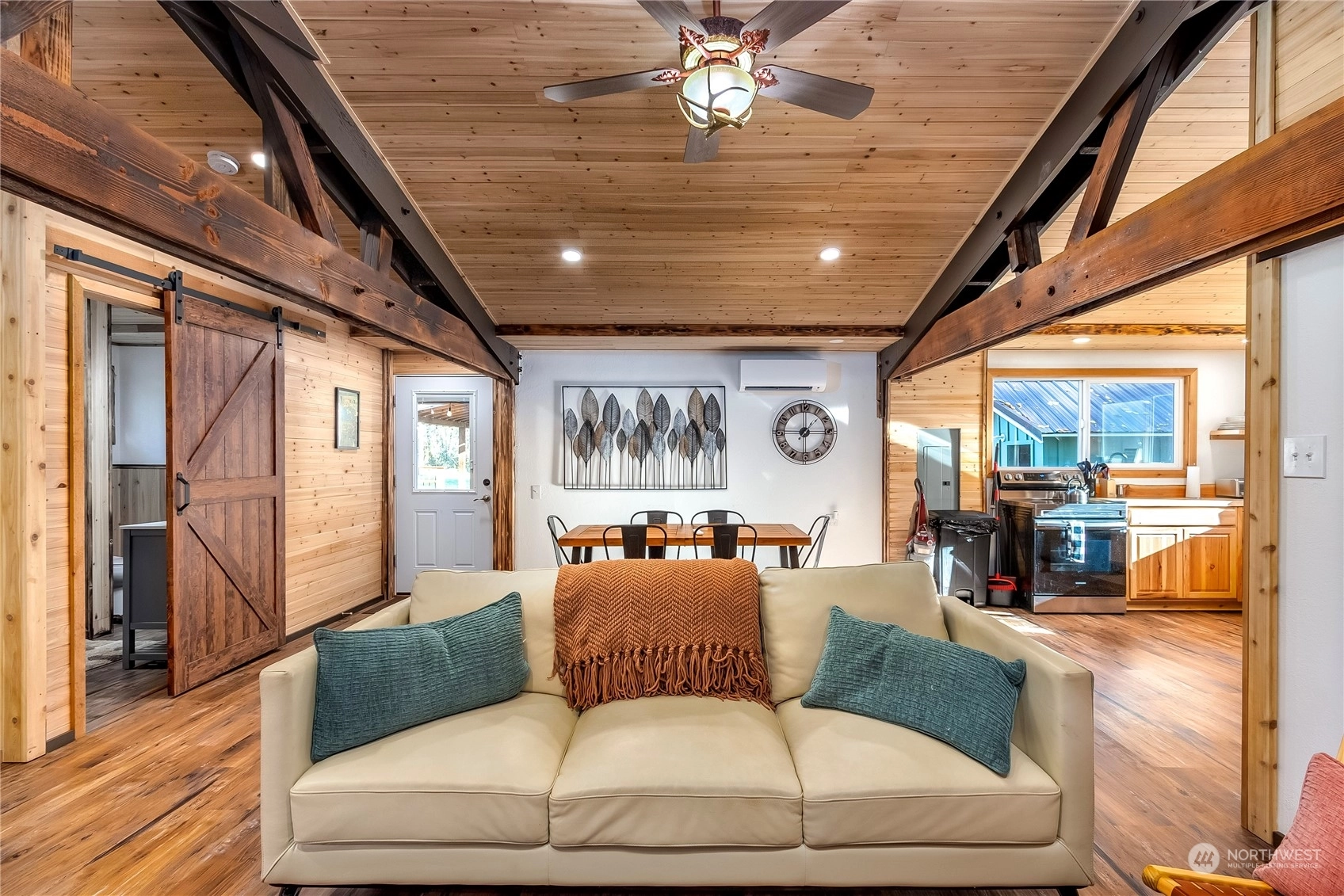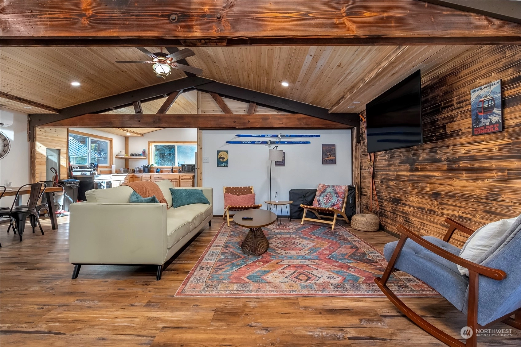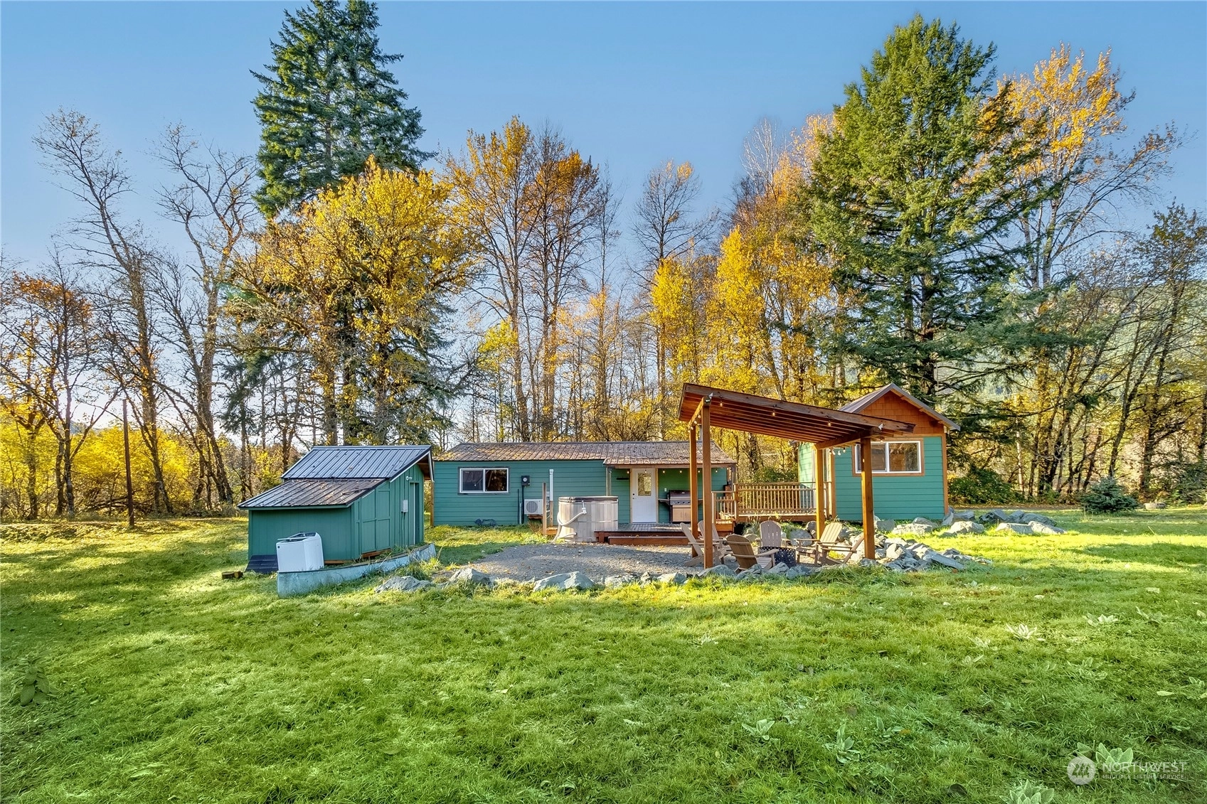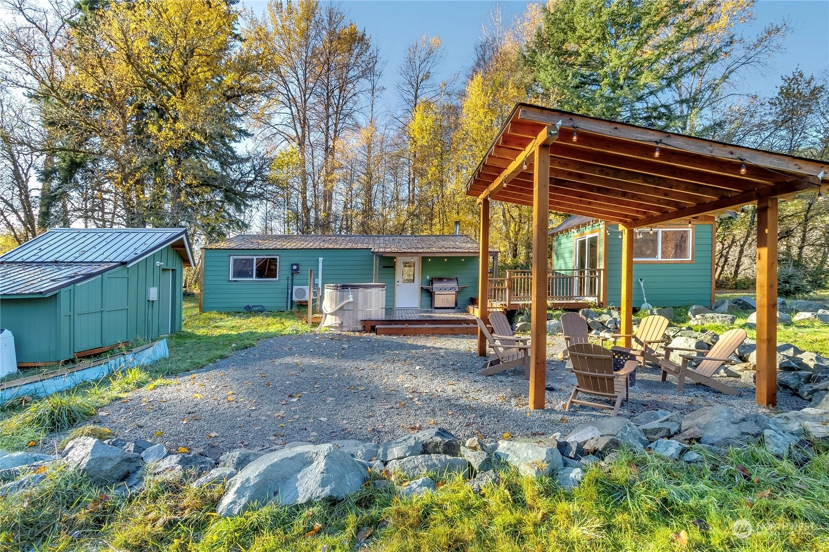 Modern, rustic single level cabin on 2.40 acres just minutes from Packwood. Exposed beams & custom wood detailing throughout put this little cabin over the top. Open floor plan with updated kitchen and bath make this a perfect solitary get-away or bring a group. Single king size bedroom plus a detached bunkhouse with 2 queen beds. Bringing an extra crowd? RV parking and hook-ups are available. Easy access just off the highway but a great tree buffer lends to your privacy. Relax in the custom cedar soaking tub to take in the foothill views, gaze at the stars and watch the wildlife pass by. Covered wood fire pit & spacious deck are perfect for outdoor entertaining. Successful, highly rated short term rental! Short trip to White Pass!