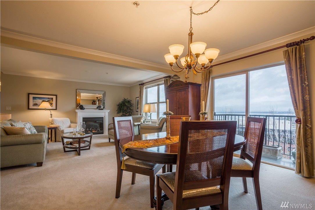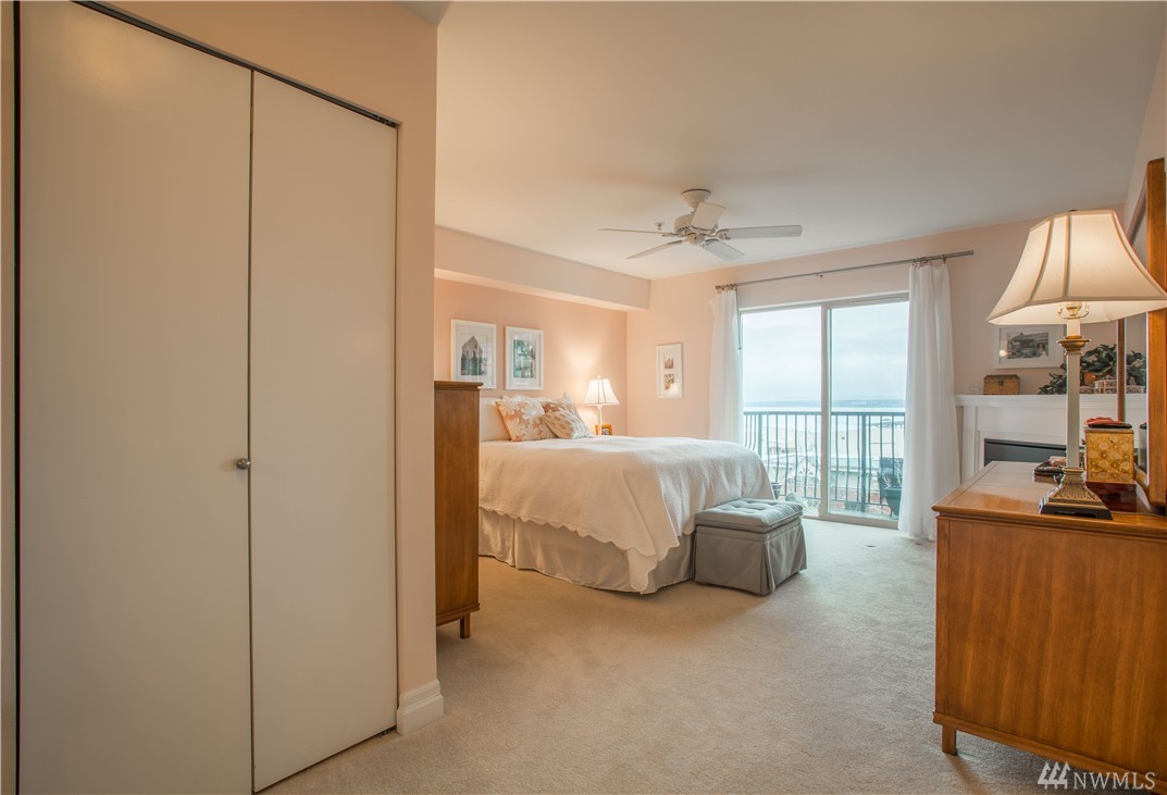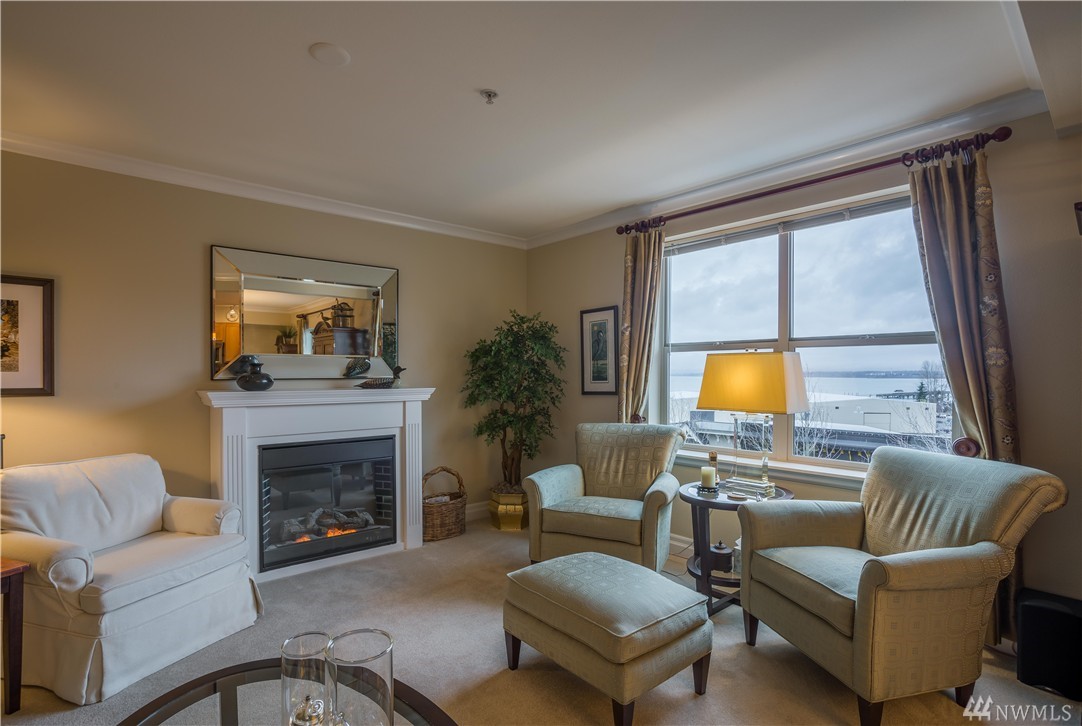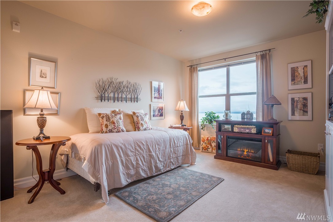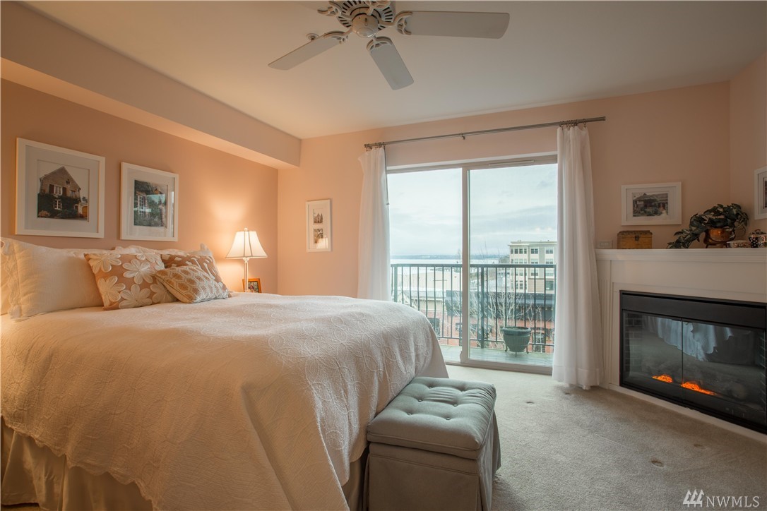 Harris Square Condo: One-level, beautifully maintained 2 bd/2ba in the heart of Fairhaven. Secure lobby entrance & elevator, garage parking for 2 cars! Featuring large oversized window, unobstructed views of Bay, City & mountains, open kitchen with SS appliances, Lv room w/fireplace & Master-suite w/walk-in, plus a fireplace, warm designer colors throughout. Condo is in spotless condition, perfect in every way.