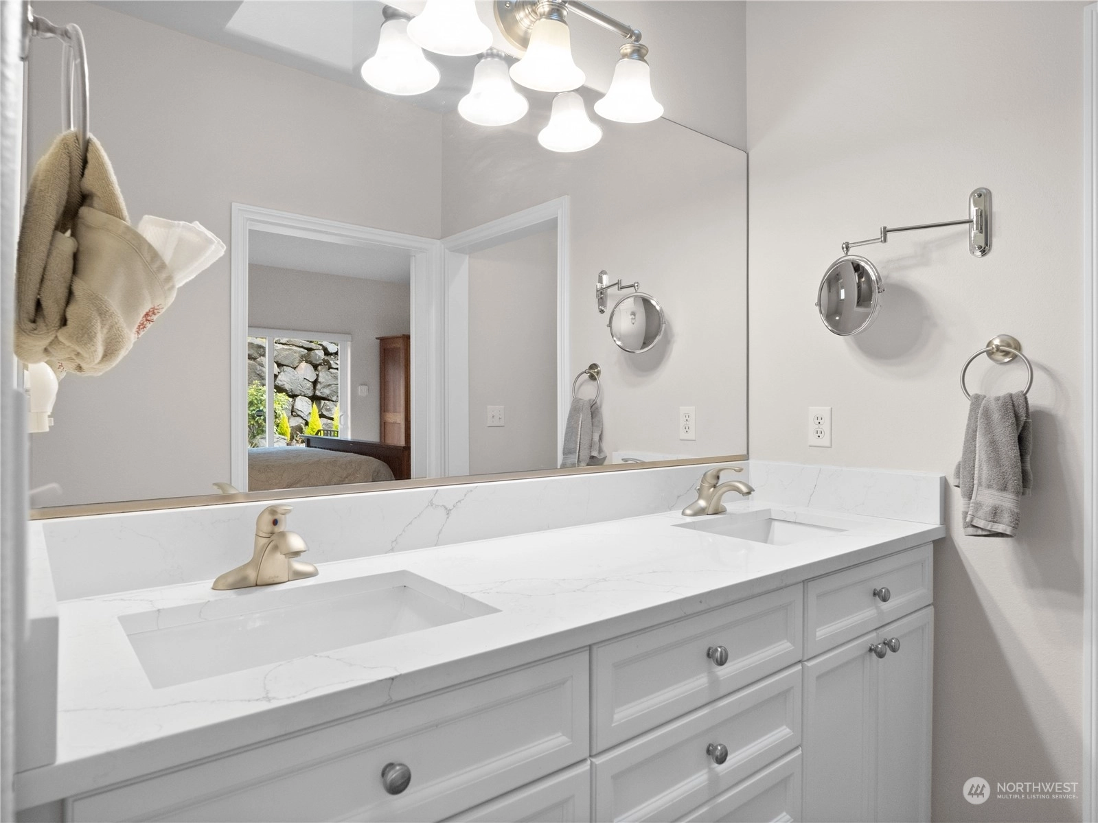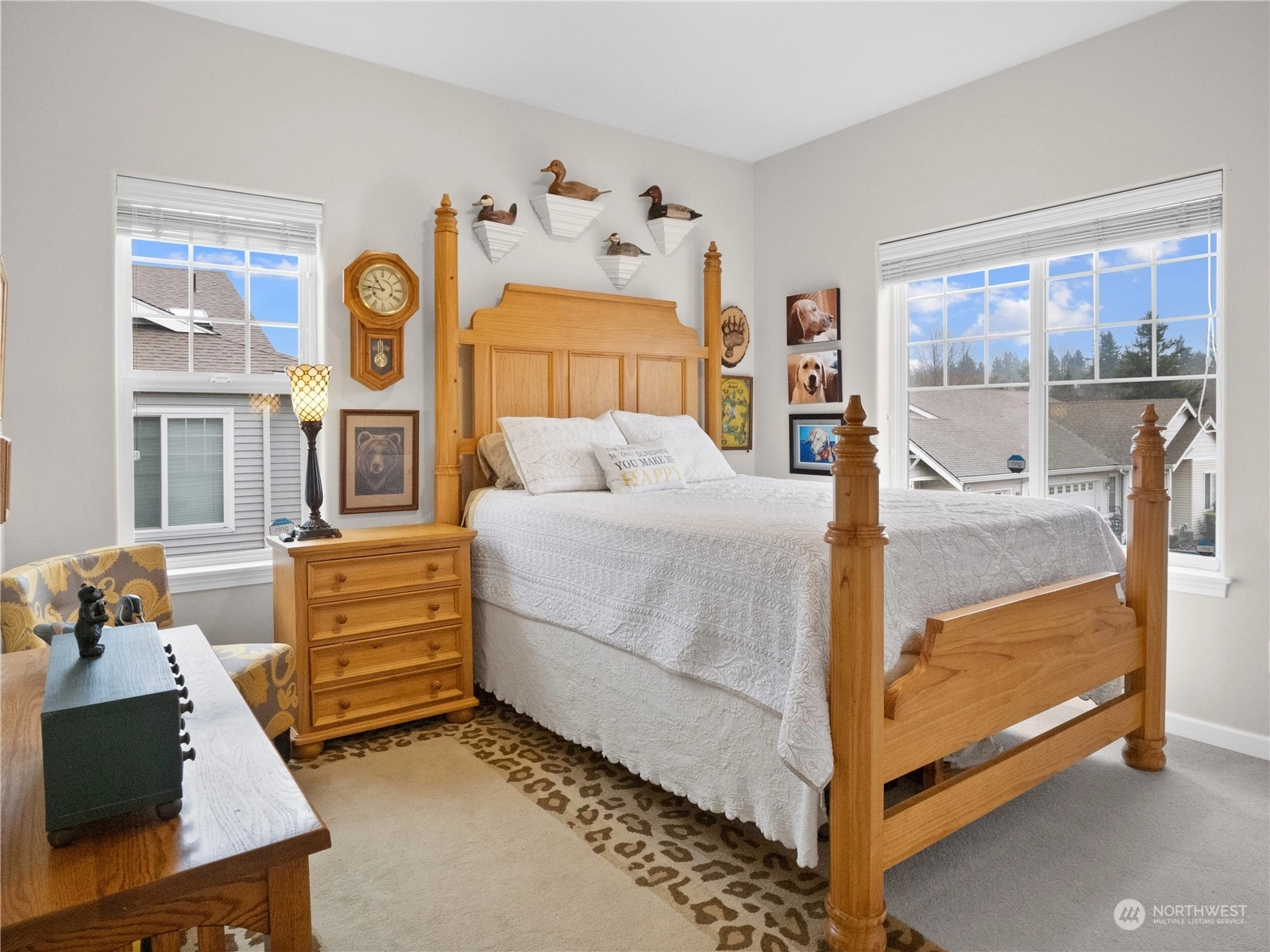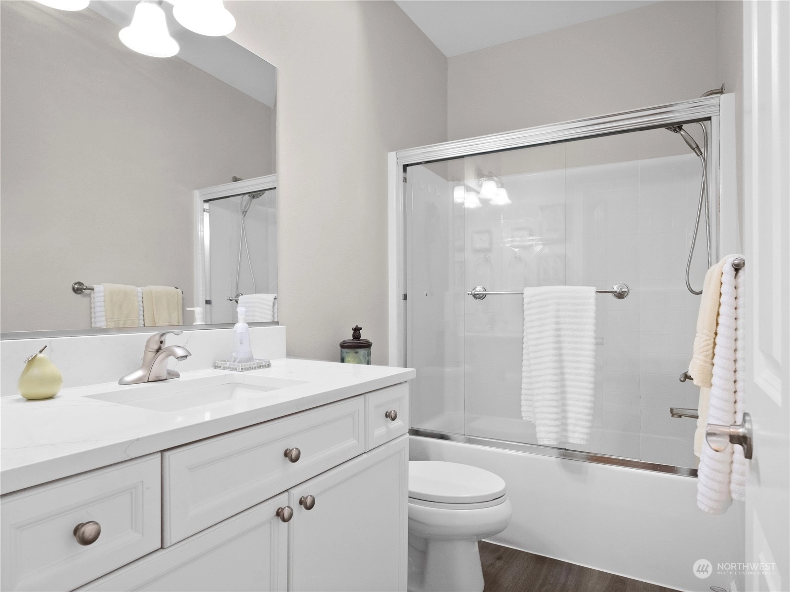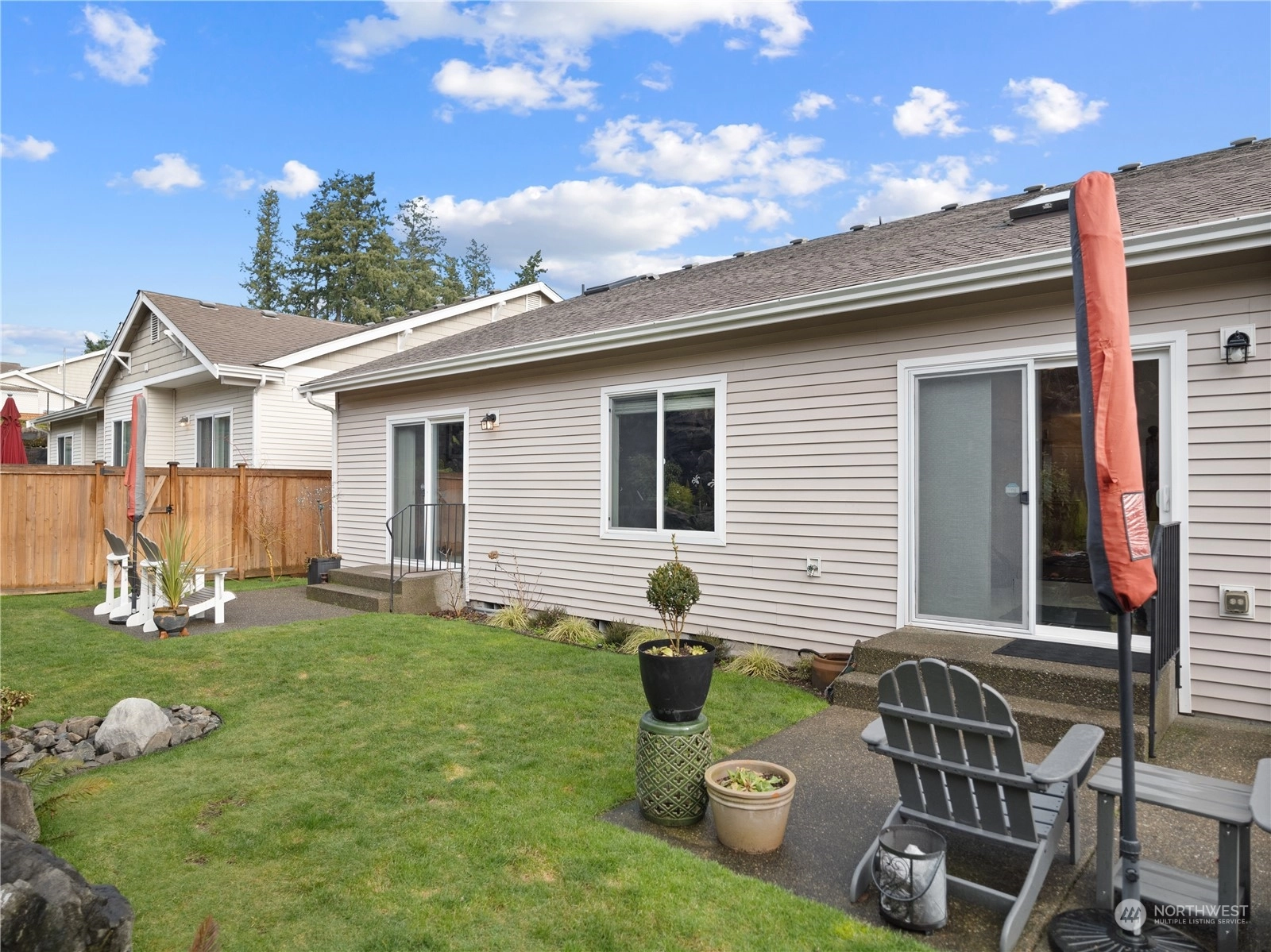 Semi-open concept living with lots of natural light! Updates are throughout. Quartz countertops in bathrooms, kitchen, island, and laundry room, primary bedroom with widened doorway to primary bath, updated shower, soaking tub, and new carpet. Primary bedroom and living room have sliding door access to private backyard. New flooring throughout kitchen and entry, new carpet in living room. New heat pump/AC. Tucked away in a private gated community that is quiet and very well-maintained! The community is NOT a 55+ community. Great location close to freeway access, Chamber Bay Golf Course and parks, shopping and so much more!