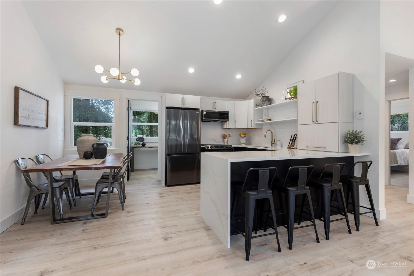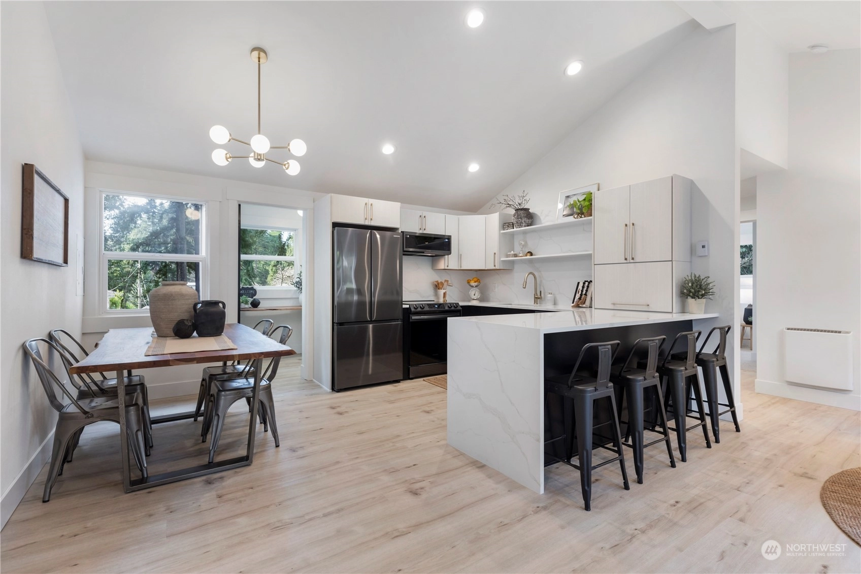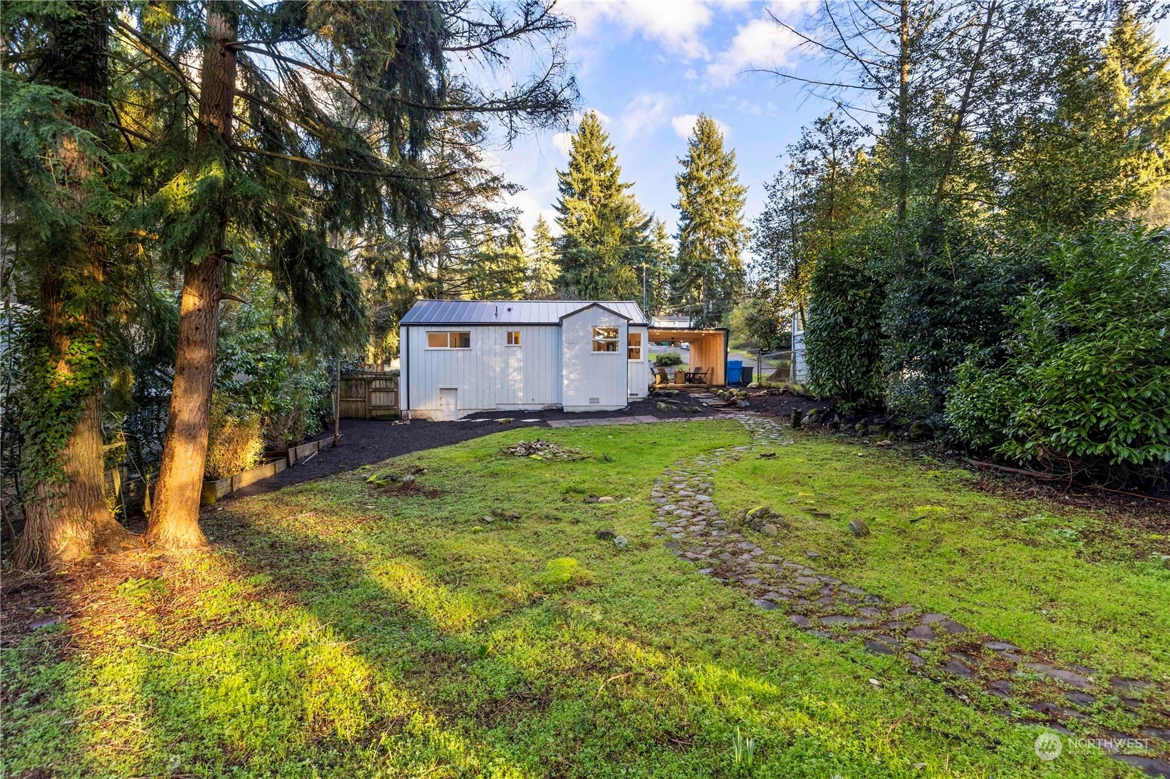 Charming, fully renovated rambler with no HOA dues: more value than a new condo and still get the upgrades. Remodeled from the studs out, it’s all new including the metal roof! Stylish vaulted ceilings, recessed lighting, stunning quartz counters, backsplash & shelves. Separate laundry & pantry room, and a dry storage room below. Innovative modern eHeat system & smart kitchen appliances included. The covered outdoor living space and an 8K+ sq ft lot provide countless options for pets, gardening, or even an ADU. On a peaceful street away from traffic, yet minutes from major commuter routes. One mile west of Shoreline South light rail station. Take pride in the exceptional work & professionally designed property from “The Fixer Upper Couple!"