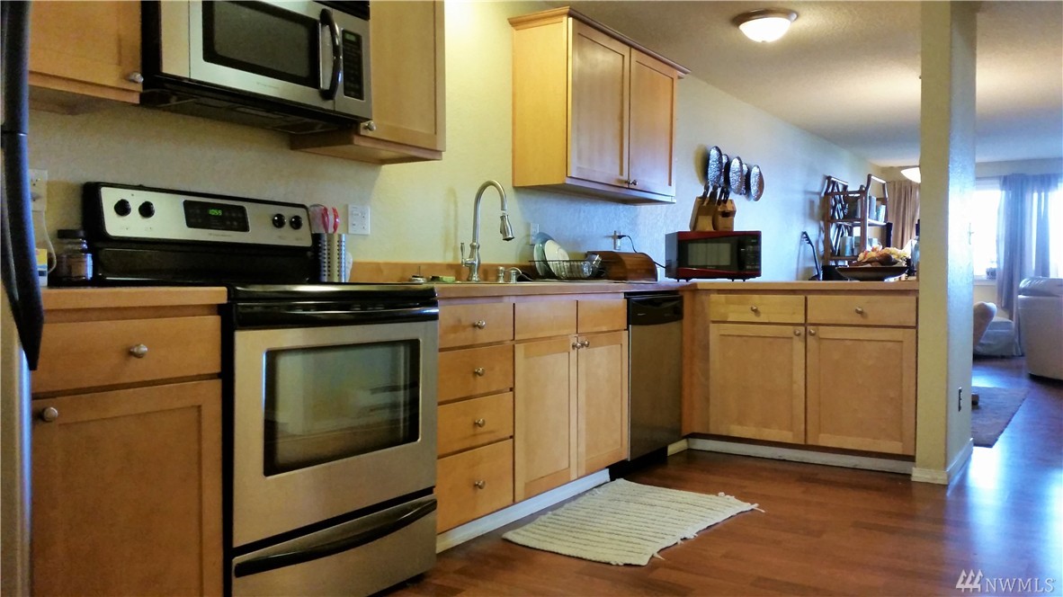 Excellent Condo with views of the Everett Waterfront! This lovely 2 bedroom 1 bath condo is updated with luxurious wood floors and stainless steel appliances. You'll come home to a spacious kitchen and bar with open layout to the dining and front rooms. Relax by the wood burning fireplace or enjoy the views of the Olympic Mountains and Everett Waterfront and Marina from your private balcony. Conveniently located within walking distance to shopping, restaurants, and transportation. Gated entry.
