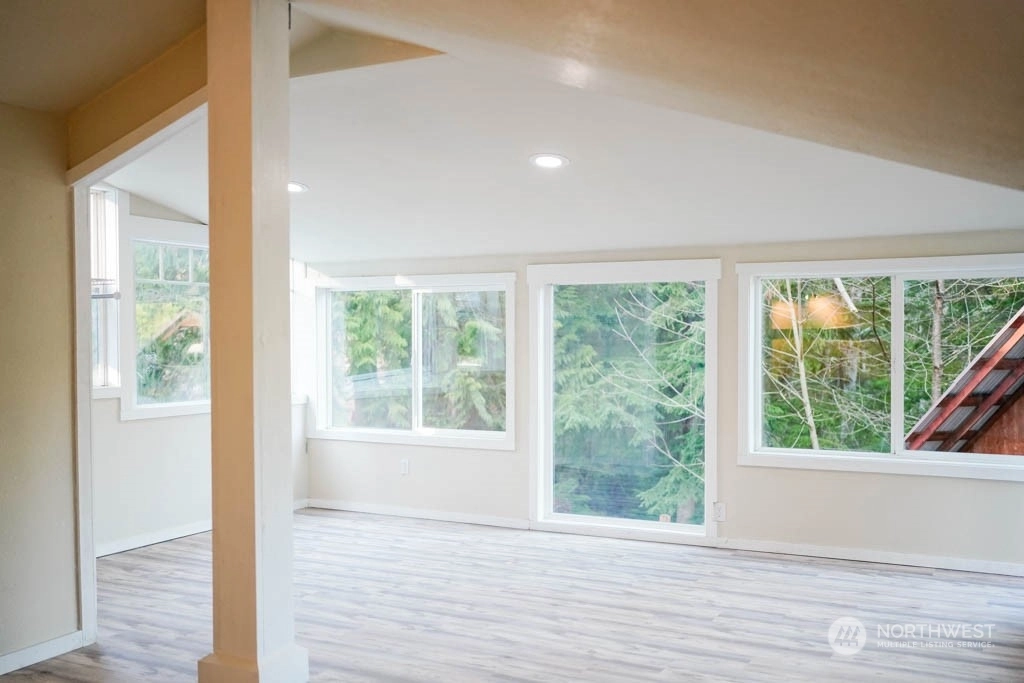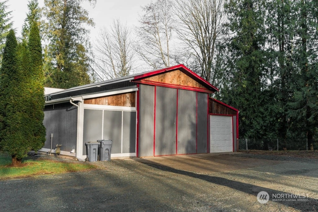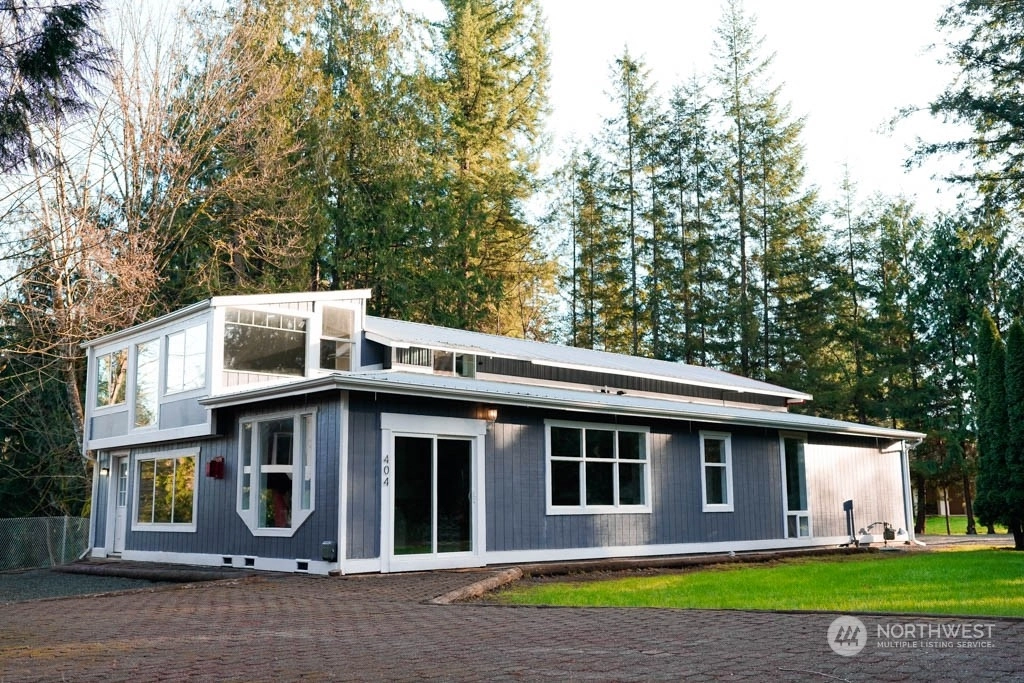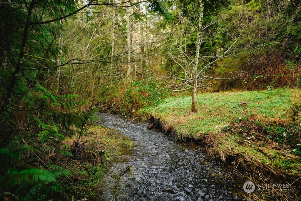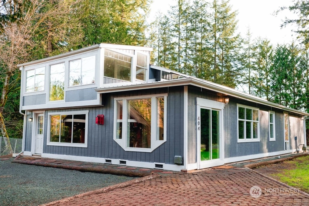 Hidden treasure on over 1 acre ~ nestled in a wooded setting w/creek frontage! An ideal, private, dead-end road minutes to town ~ UPDATED HOME with LARGE SHOP! Light-filled 2bd +office or 3rd bdrm and open living/dining w/lots of built-in storage. Updated kitchen features new appl, lighting and warm wood cabinetry. Impressive floor to ceiling windows brings in the natural light! Upper-level hosts spacious primary ensuite w/vaulted ceilings. Freshly painted inside-n-out! Shop boasts lg doors, half bath, utility sink and circular drive. Another splendid feature of this property is the 336 SQ' pole building with loft space and deck ~ an impressive leisure and entertainment space that overlooks the creek! Lawn, landscaped terrace and RV hookup!