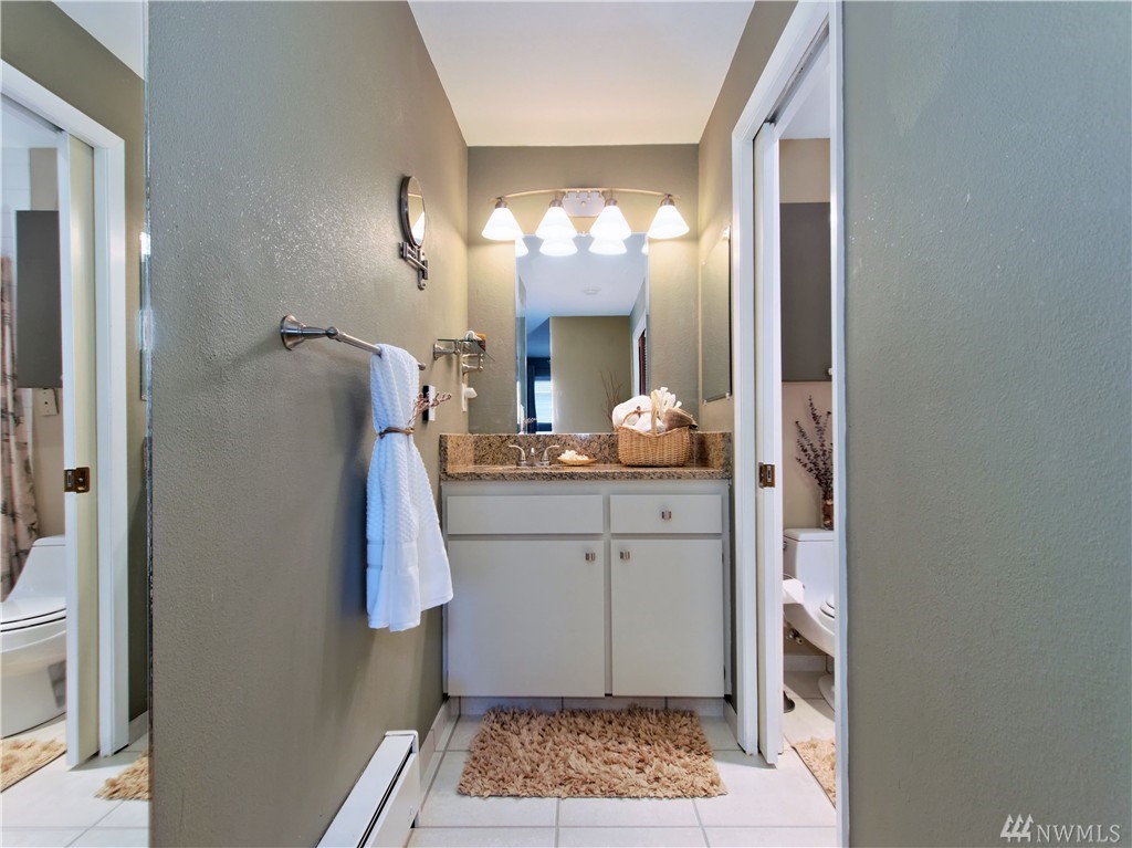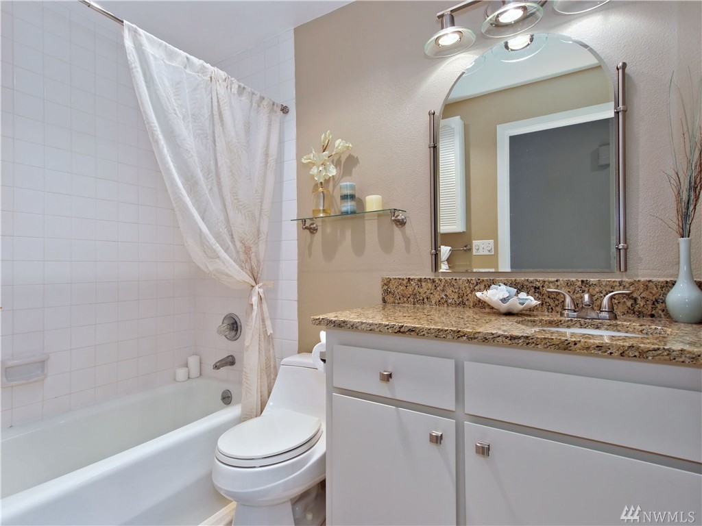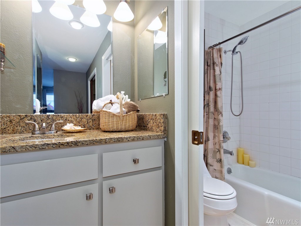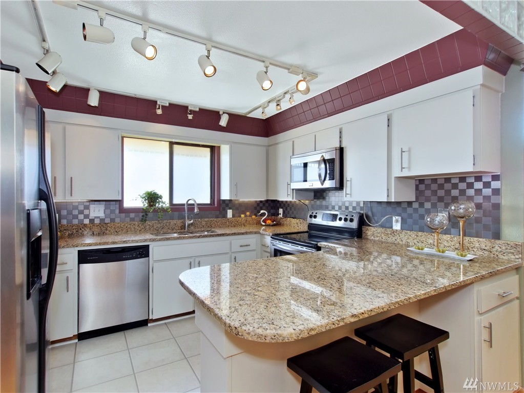 Custom built Des Moines waterfront community condo home. Updated, move-in-ready top floor, corner unit. 1260 sq. ft. open floor plan with vaulted ceiling. Granite counter tops with matching bath vanities, ss appliances. Engineered white oak hardwood floors throughout. Master suite with walk-in closet. Two real porcelain bath tubs. Wrap-a-round private deck. Next to the shores of Puget Sound including fishing pier, marina, beach conservation area and bike trail. "Top Floor Living"