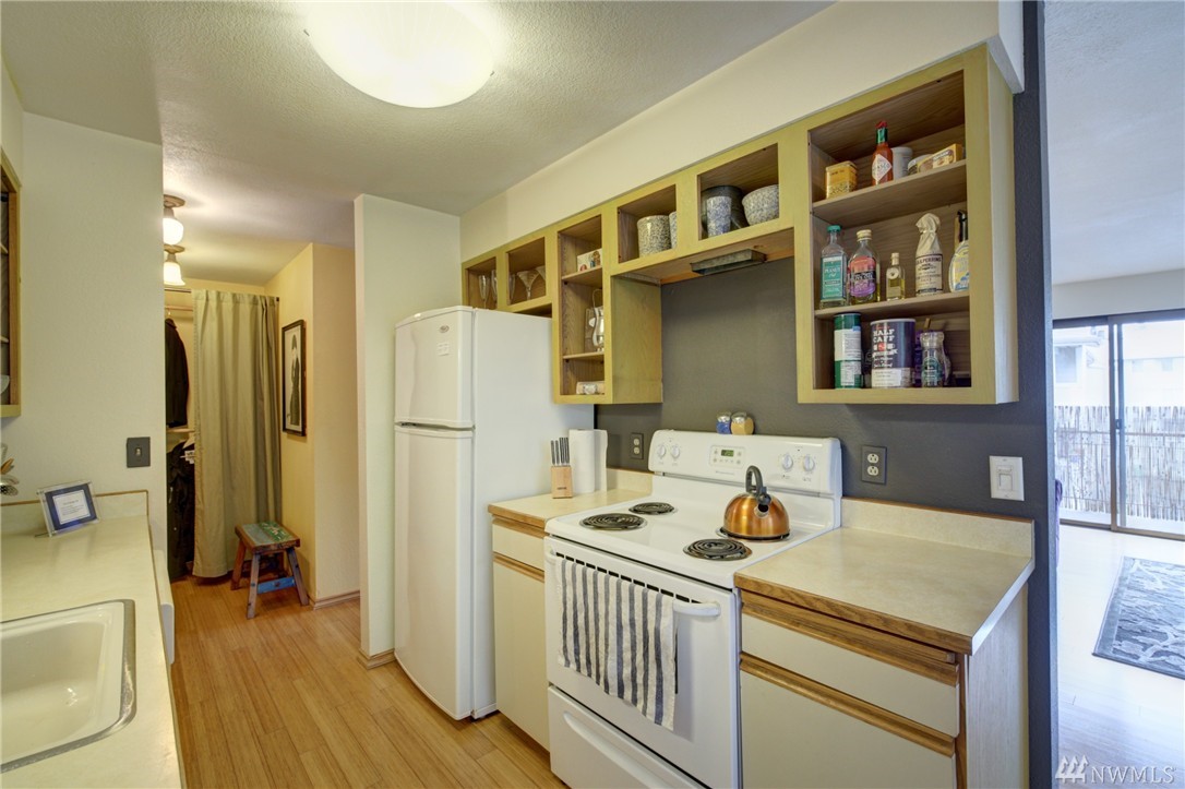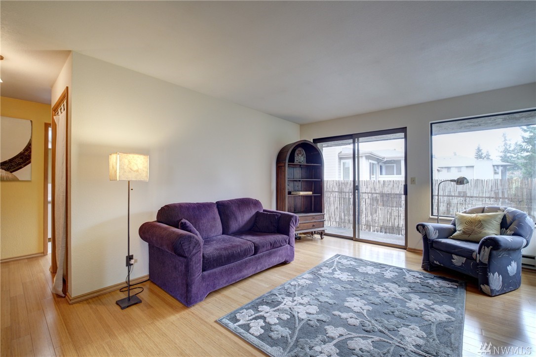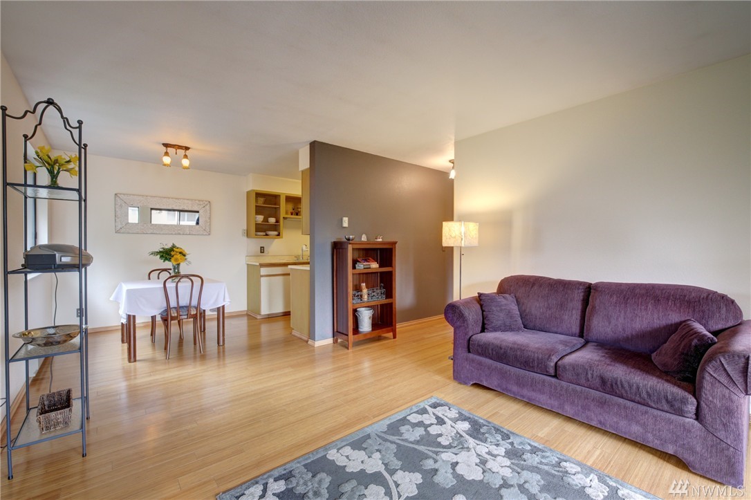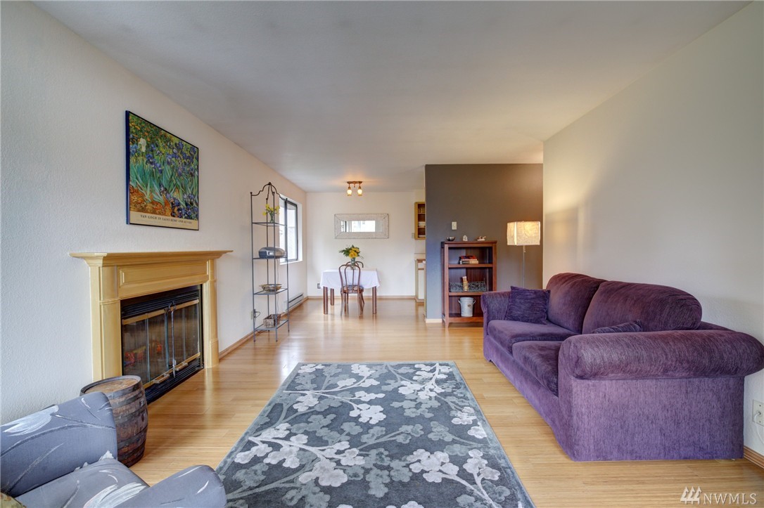 This move-in ready condo is your serene urban sanctuary. Top floor corner end unit w/ private covered deck/balcony gives you a luxury tree house feel. Beautiful bamboo floors, fresh paint & newer appliances. Efficient floor plan w/ lots of natural light. Big bedroom w/ huge closet. Nice size living room is anchored by a tasteful fireplace w/ custom mantle. Peaceful dining area just off kitchen. Secure entry, private storage, designated off-street parking & steps to shopping & major bus routes.