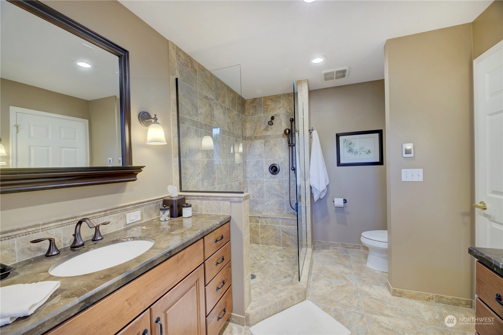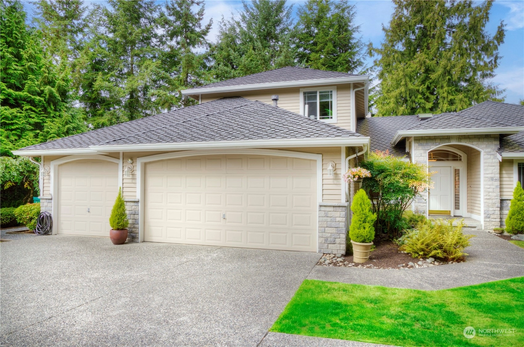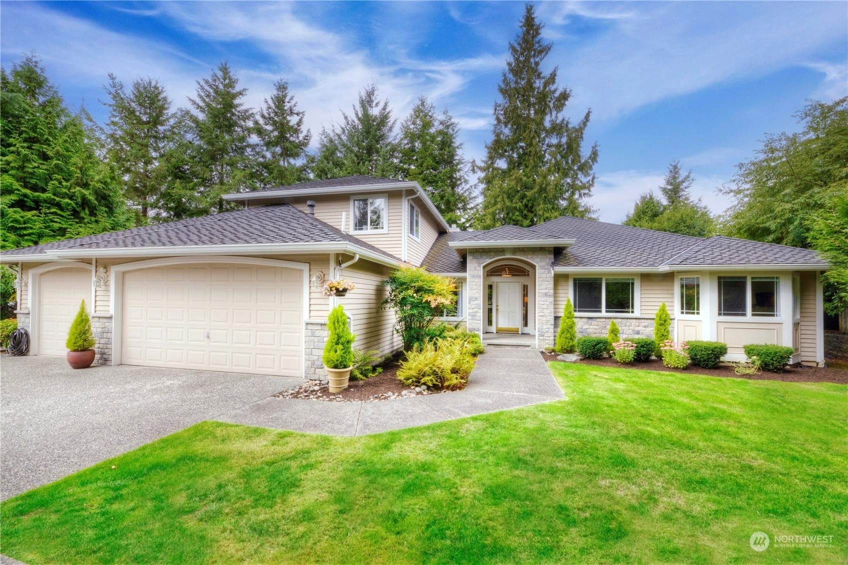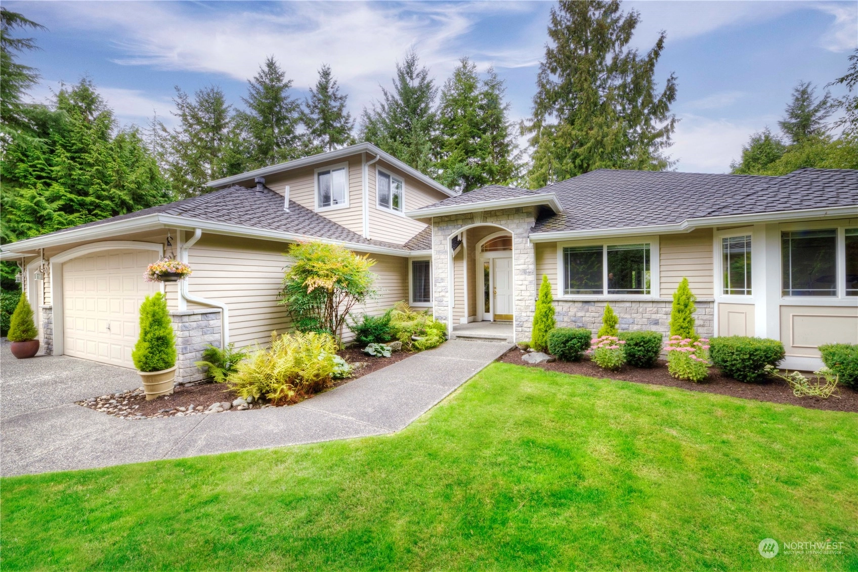 Rare rambler in the Aspen division of Mill Creek with a guest suite above the 3 car garage. Private park-like setting. This one owner custom-built home has been extensively updated over the past 24 years. Open, well-lighted floorplan. Chef's kitchen with stainless appliances, 2 way gas log FPL between the family/living areas, oversized primary bedroom with large walk-in closet and attached remodeled bathroom with heated floor. 2 add'l bedrooms, formal dining area, remodeled main bathroom and half bath, a nice size den and laundry room complete the main level amenities. Hardwoods resurfaced! 50 year roof installed in 2013. Owner is a licensed RE Broker. Seller to pay up to $15K towards buyer's allowable closing costs, prepaids or buydowns!