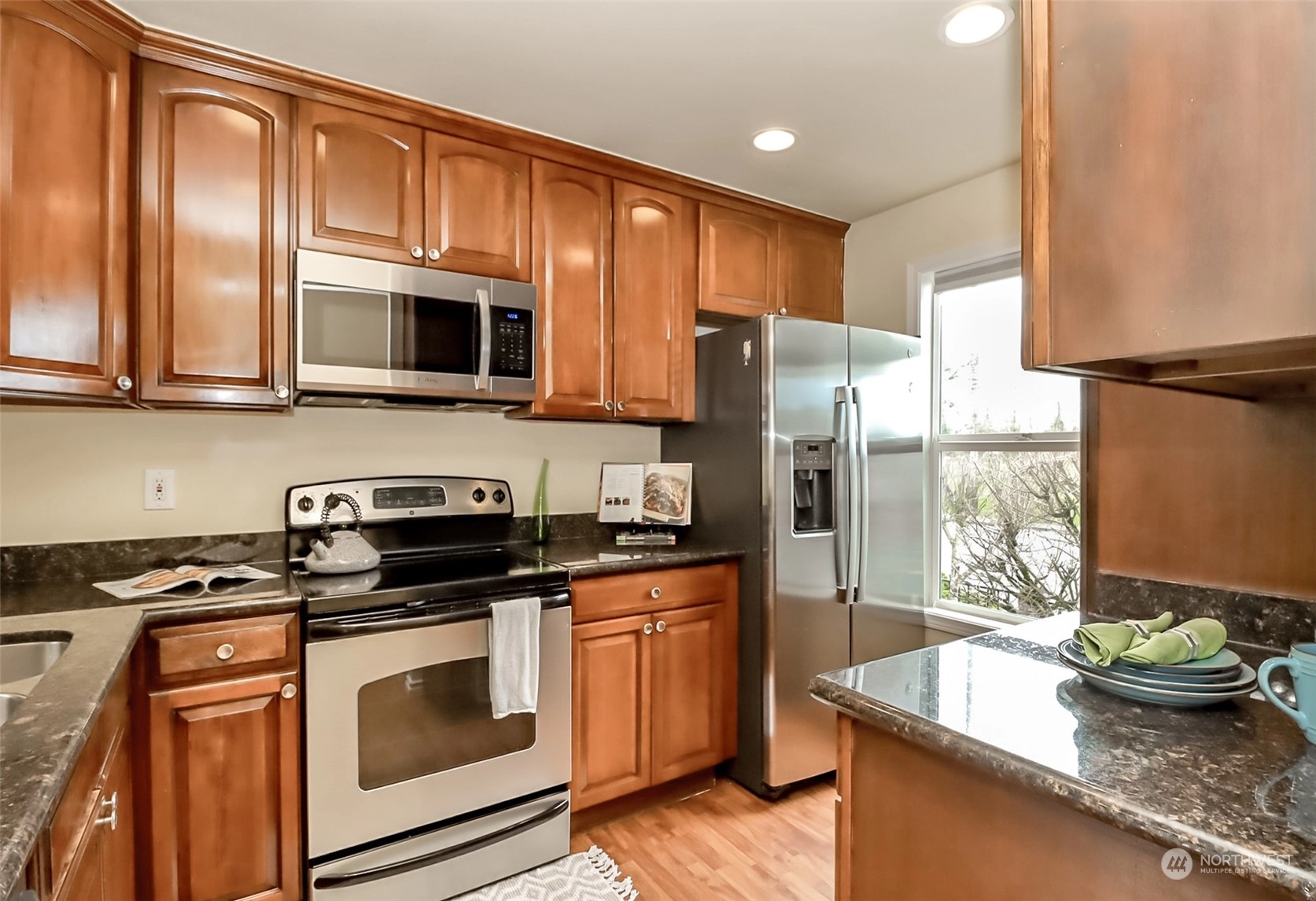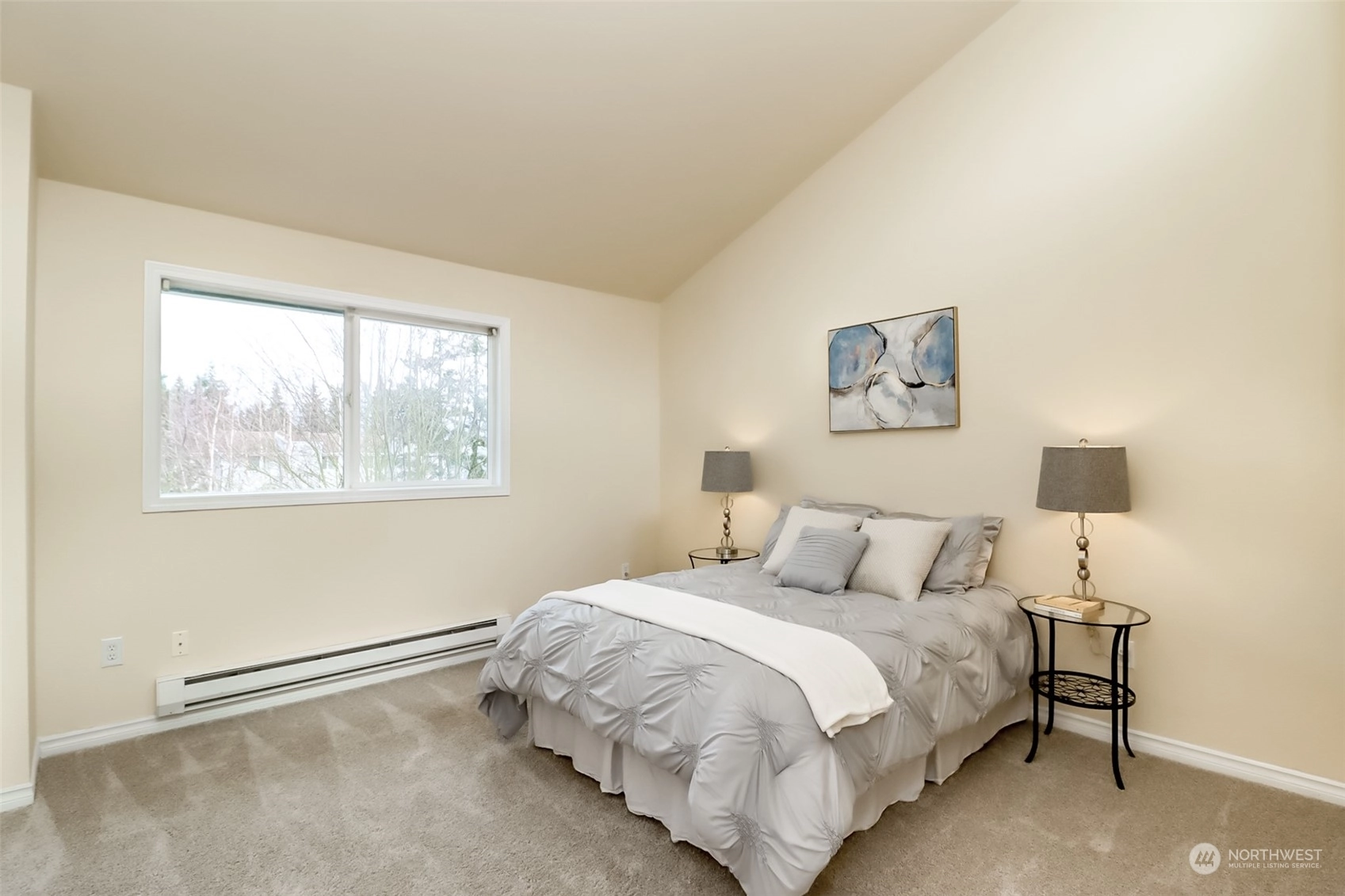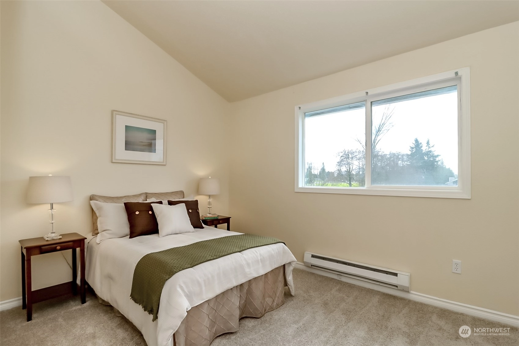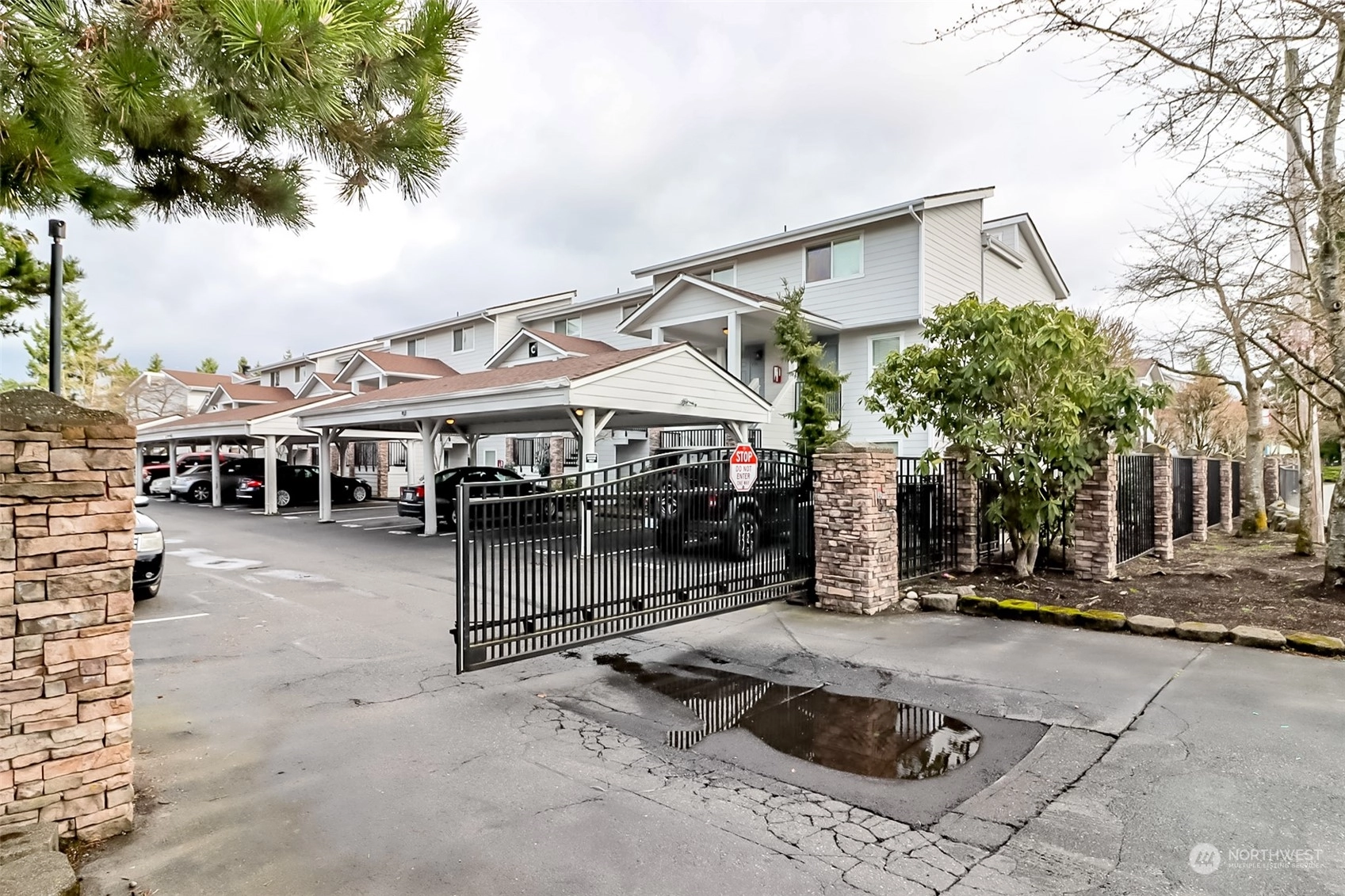 Spacious top-floor 2 story condo in the heart of Everett! Ideally located across the street from Walter E Hall Park w/an easy commute to Boeing & Paine Field Airport. Vaulted ceilings and skylights flood this move in ready home w/plenty of natural light. Kitchen features granite countertops, hardwood floors, solid wood cabinets & stainless steel appliances. Relax by the wood burning fireplace or outside on the private balcony overlooking the peaceful common area gardens. Other features include: NEW carpet, in-unit W&D, ample storage, and 2 dedicated parking spaces! Pet-friendly & no-rental cap! Located in a gated community along public transit and close to freeways, shopping, dining & golf! A great price for this fabulous investment!