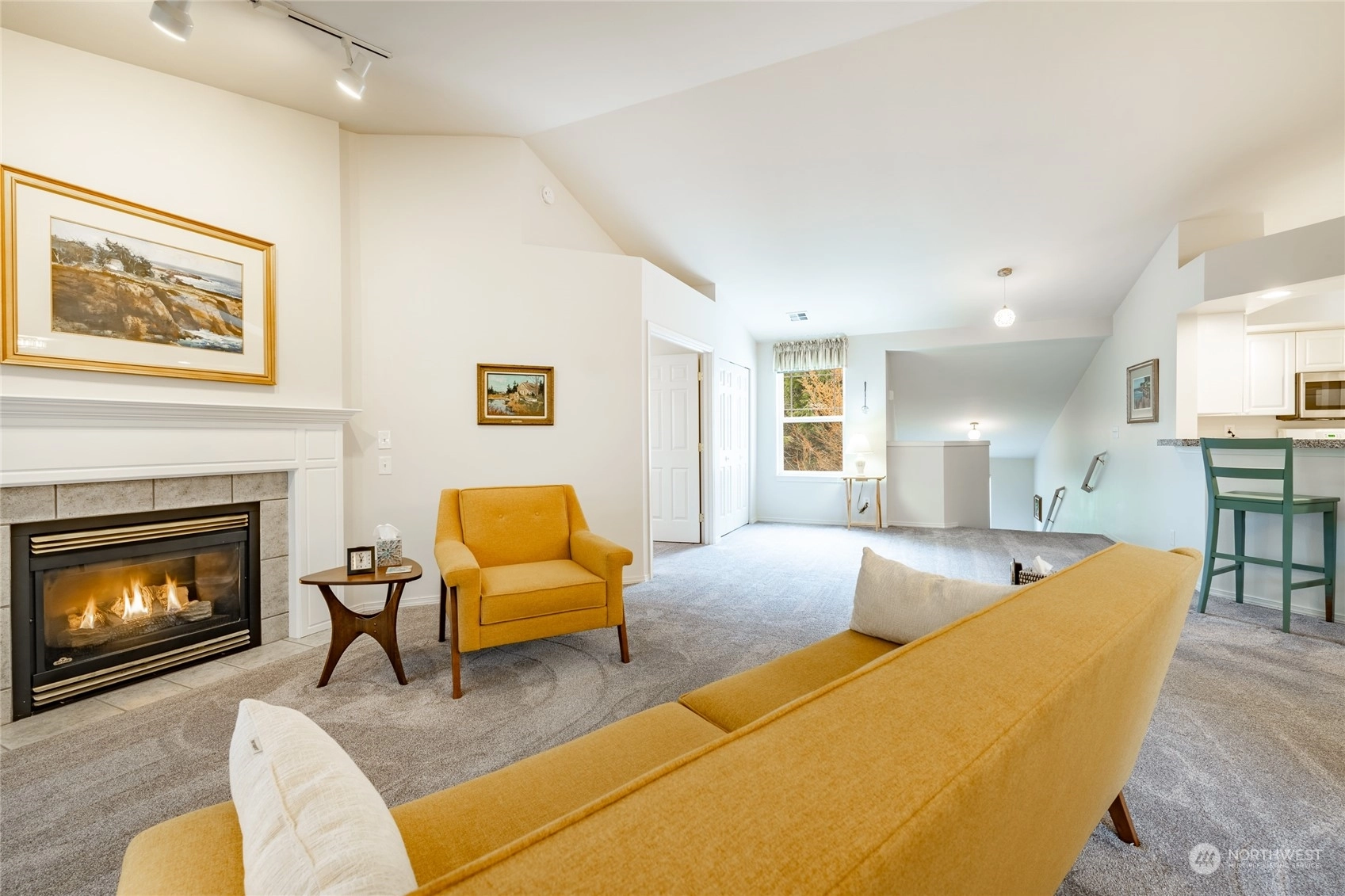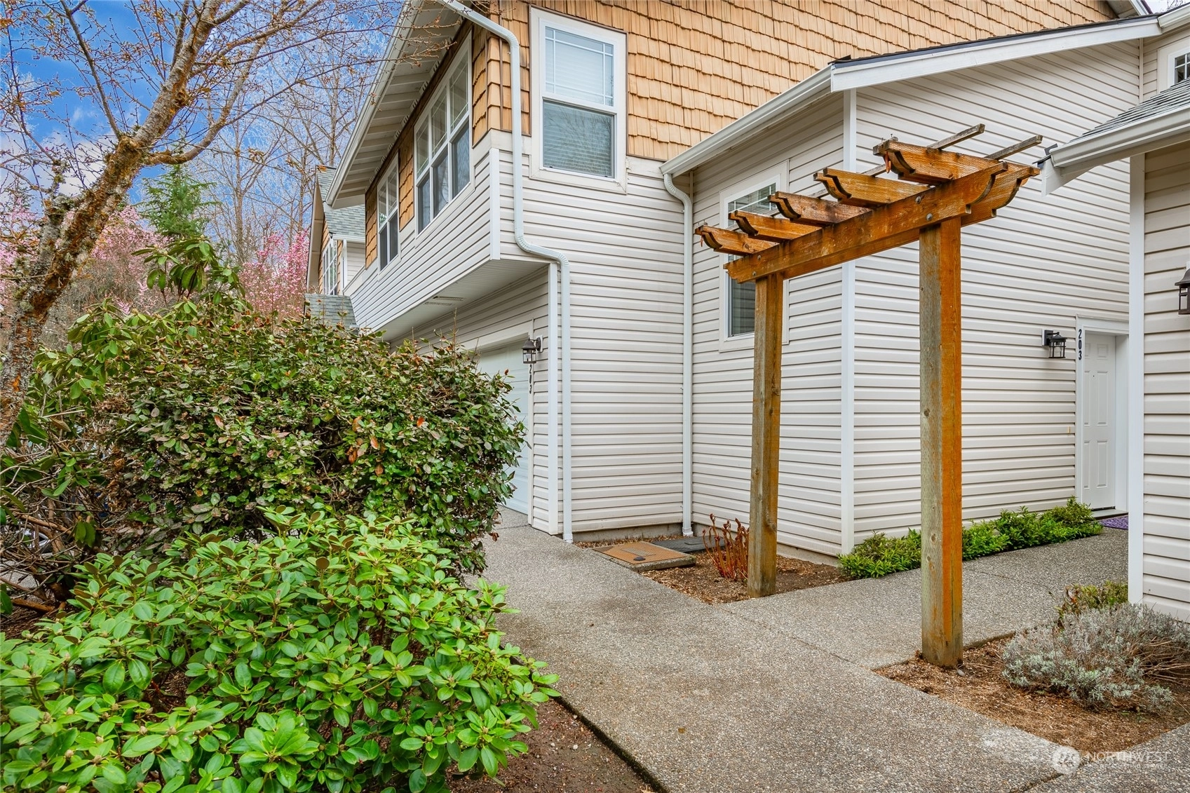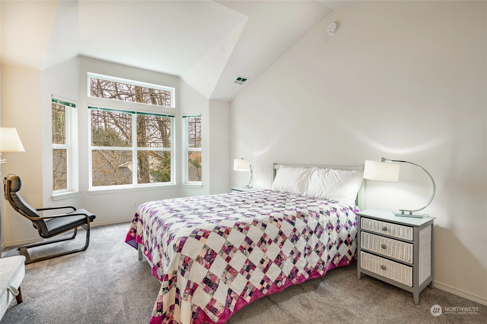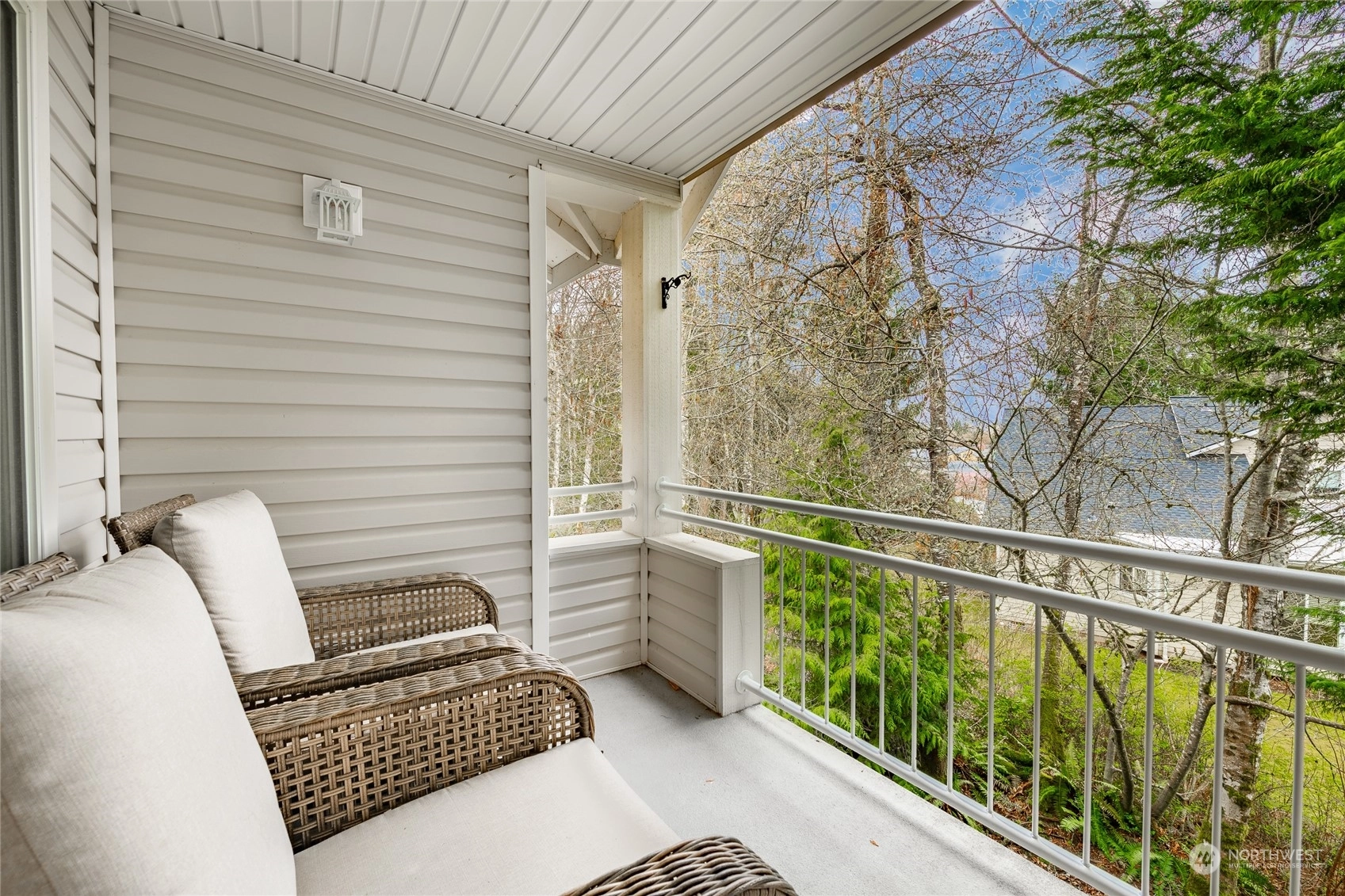 Quiet top floor condo situated ideally on the southside of Bellingham. Nestled away from roads and backing to a greenbelt, a private and rural feel right near Fairhaven. 2 bedrooms and a den/office ideal for working from home. Open floor plan with lots of windows & skylights filling the home w/ natural light, vaulted ceilings, and a gas fireplace. Large master w/ensuite, two closets, including a walk-in. Spacious kitchen w/ lots of storage & counter space. All appliances included. New carpet in 2022, flooring in entry, kitchen & baths. Lots of upgrades. Attached double garage with more storage, plus a private turnout for extra parking. Next to the Interurban Trail for easy access to Fairhaven, Downtown Bellingham, parks, waterfront, & more.