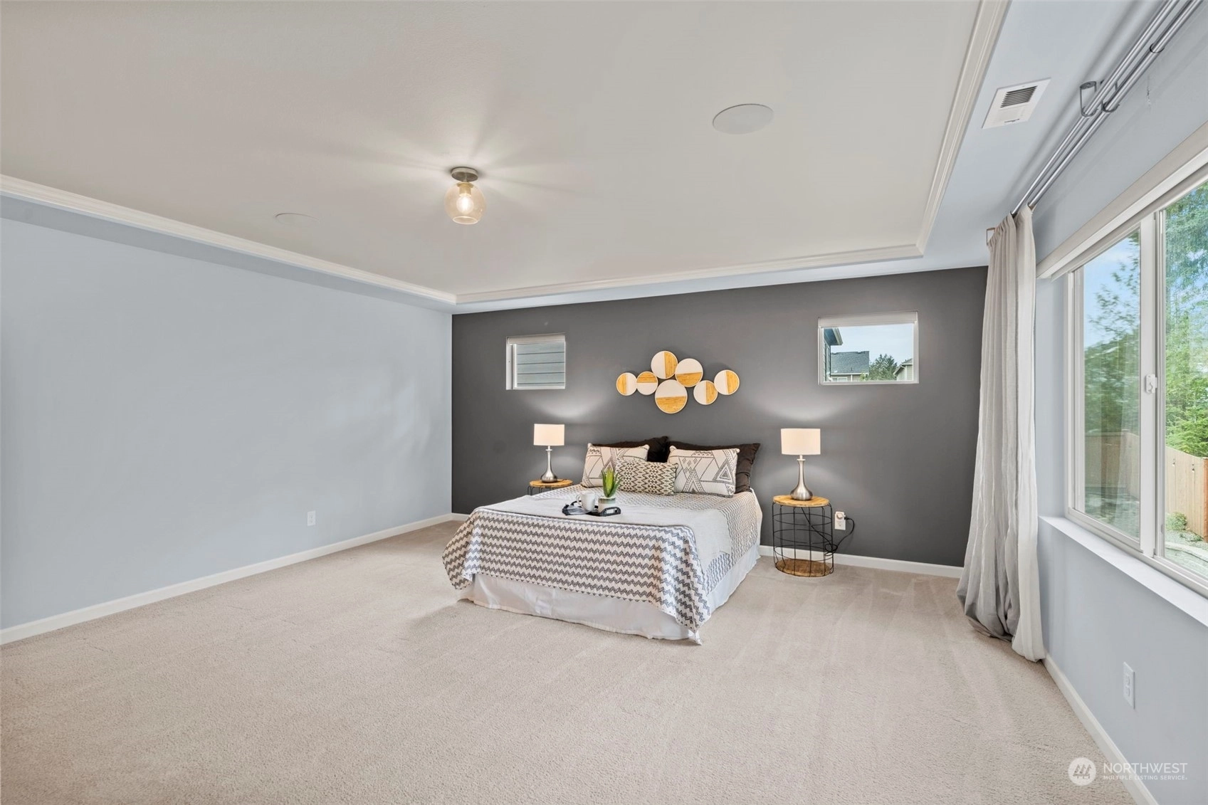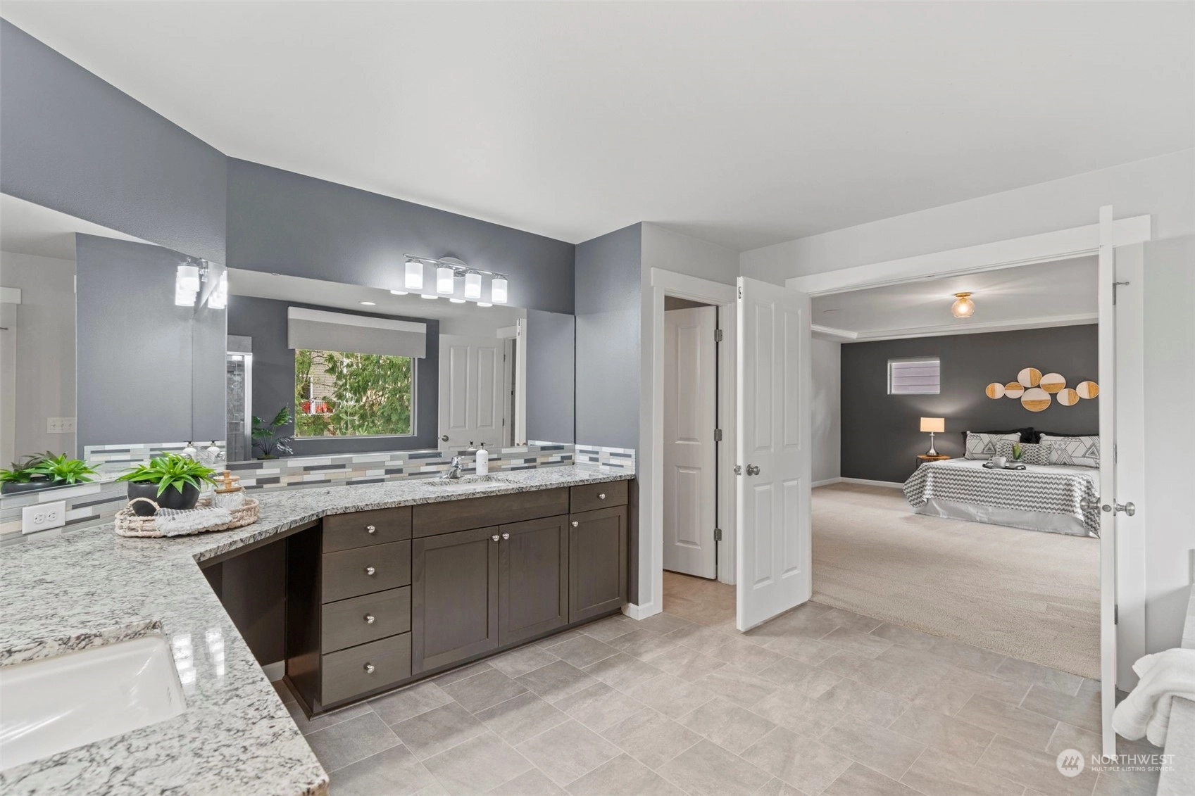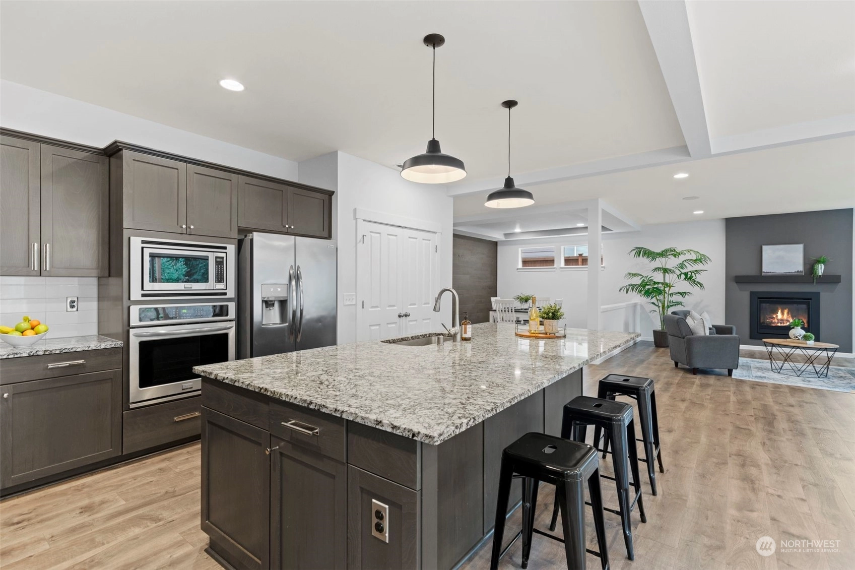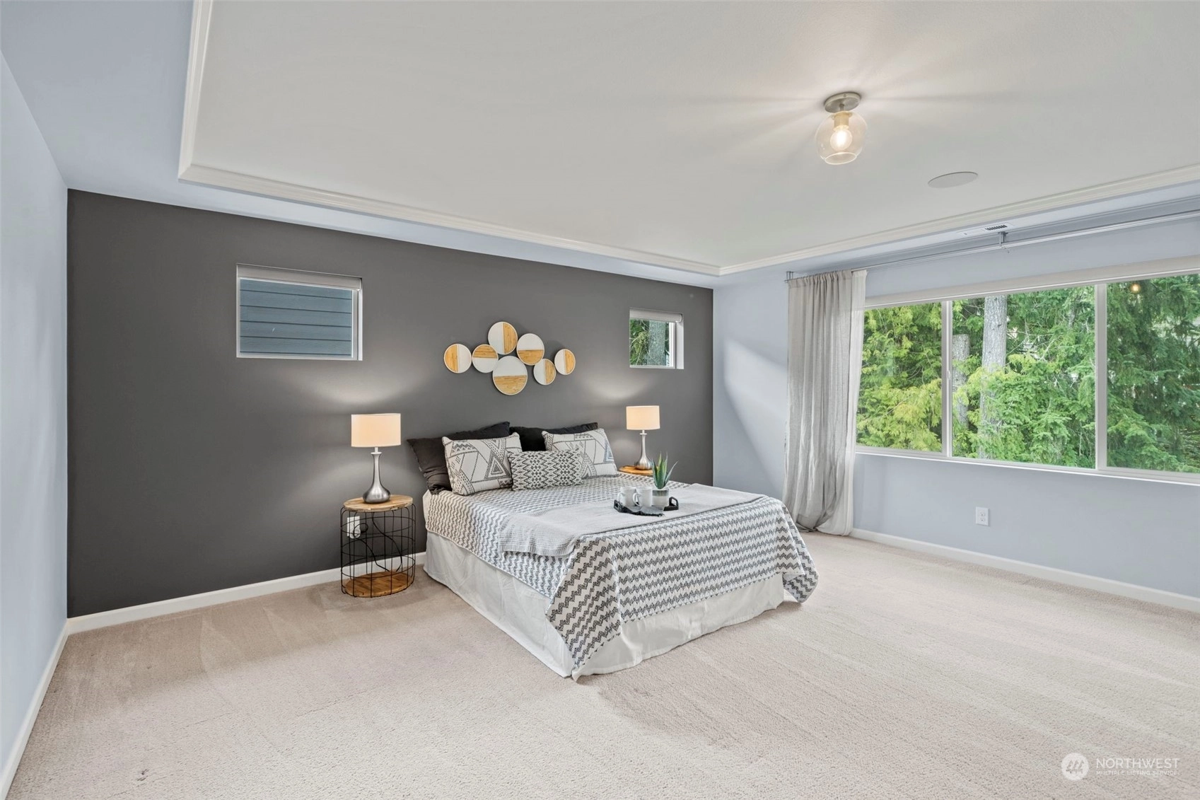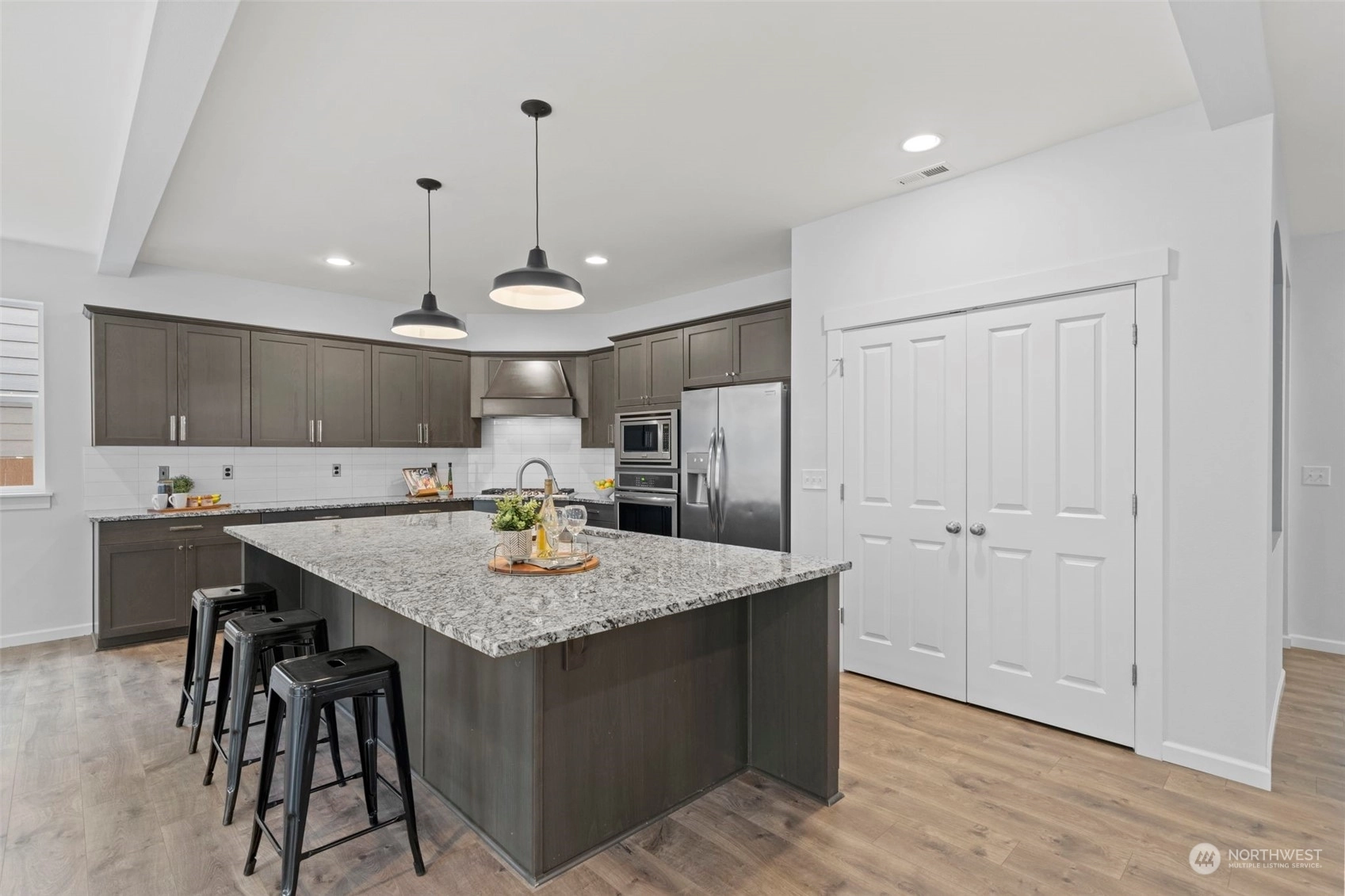 Modern, open concept, former model home on a cul de sac street. Huge primary suite with french doors to 5 piece primary bath and walk in closet. Upstairs bedrooms open up to skylit hallway and sun-filled family room with Juliette balcony. 5th bedroom on main floor can also serve as an office. Kitchen boasts 10 foot island and opens up to 2 entertaining spaces, massive dining room, and brand new backyard that backs up to a beautiful green belt. Backyard thoughtfully designed for parties, pets, with turf, hot tub and trex deck. Upgrades: finished garage with epoxy floors, custom shades in every room, built in speakers, and sprinkler system. Prime location, walking distance to school, duck pond, baseball fields, Cushman trail! Welcome Home!