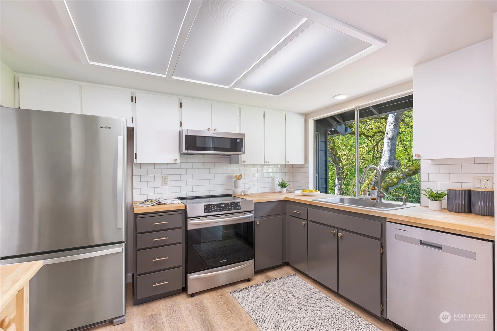Centrally located on a picturesque street-to-street lot, this tastefully updated Bryant home offers comfort & convenience. Move-in ready, featuring a bright, light-filled living + dining area w/vaulted ceilings & west-facing deck, overlooking the huge, private backyard—over 8,400 sq ft of your own serene park-like setting! The classic floor plan includes 3 bdrms + 1.75 baths on one level & open kitchen equipped w/new SS appliances. A flexible rec room, spacious laundry room & oversized 2 car garage round out the lower level. The unique charm of the outdoor space - mature trees, outdoor gazebo, charming creek & raised beds - make it one of kind. Blocks from PCC, Met Market, Burke Gilman, numerous parks & all the best NE Seattle has to offer.