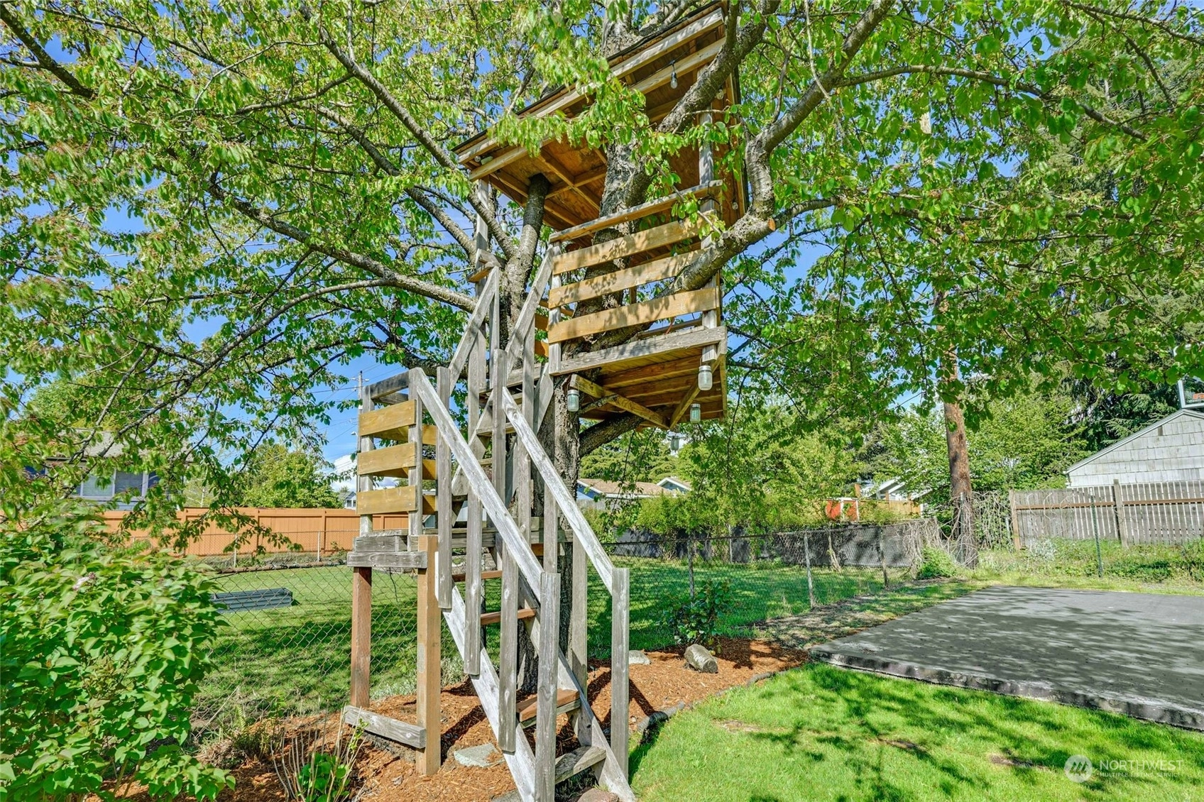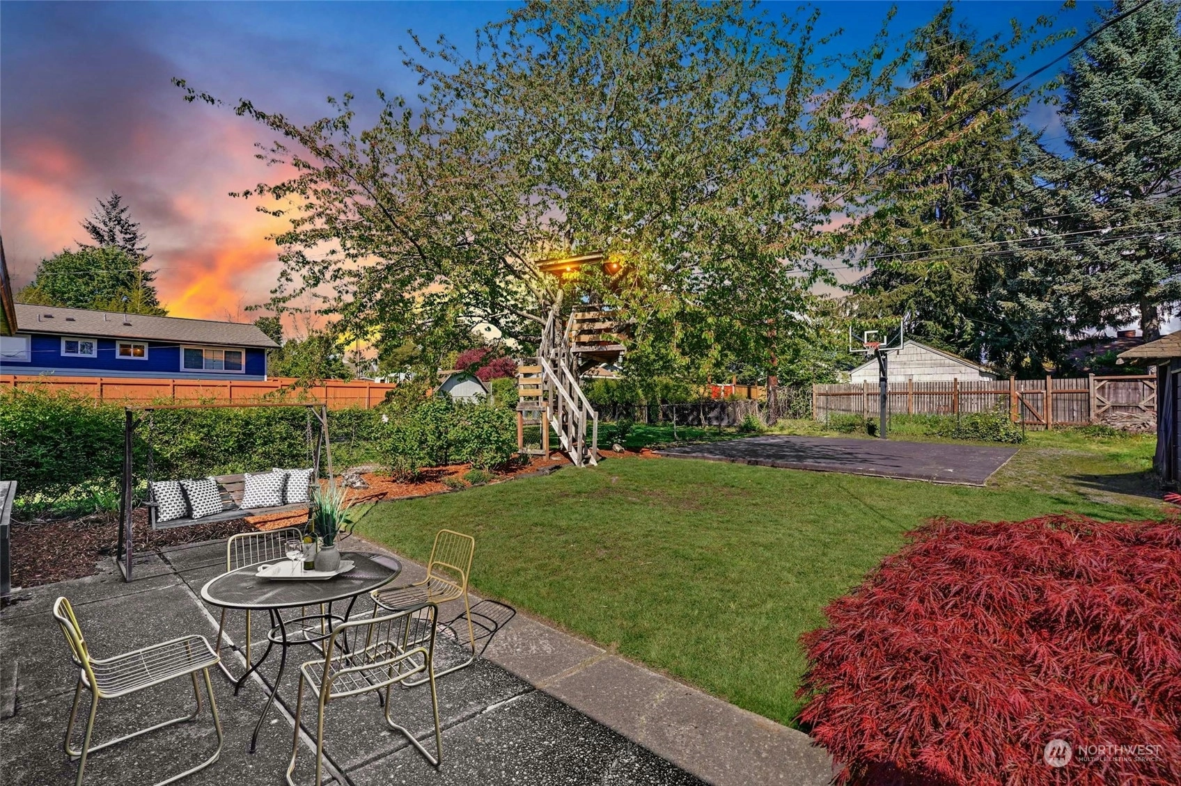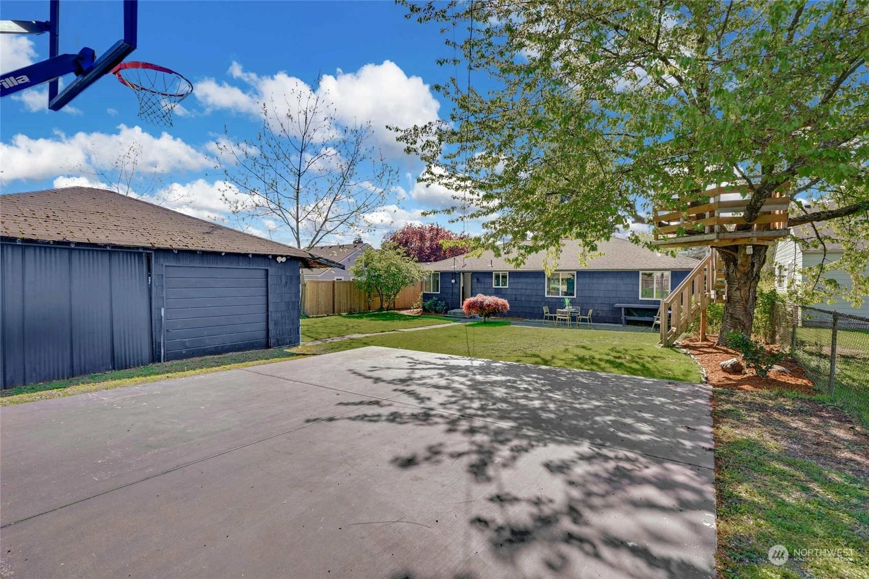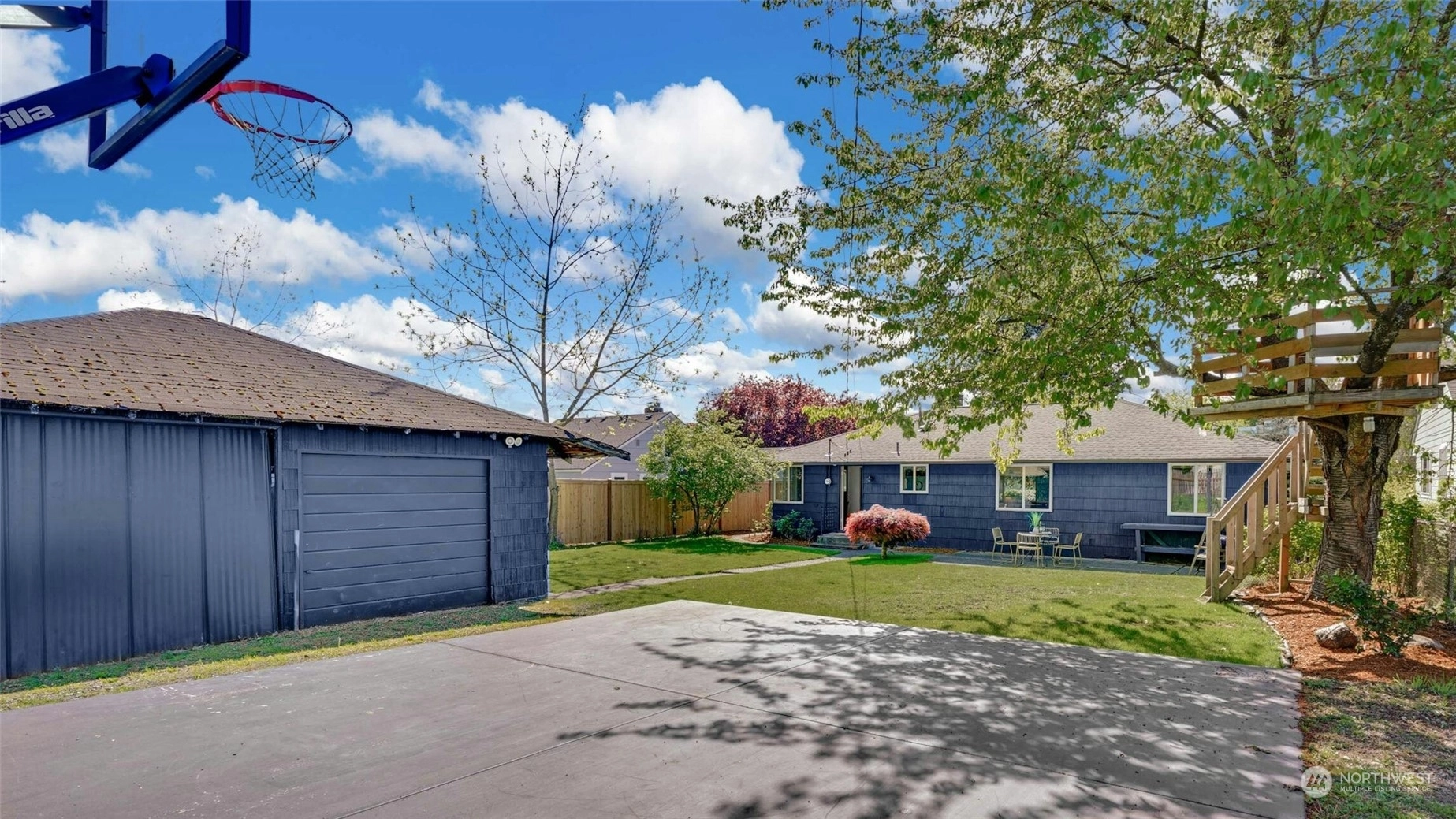 This sweet 1950's era home is nestled in a 7700 square-foot lot, where possibilities for awe and activity are endless. Some say the heart of this home are the grounds; its huge fenced backyard, garden parties, majestic cherry tree, treehouse; bespoke basketball court; detached garage; RainWise garden; & heirloom roses. See it all from the kitchen window. Others enjoy an efficient layout distinguishing 3 bedrooms from the living areas -kitchen, dining, living, and the recreation/laundry room. There's the neighborhood, where parks, beaches, buses, schools, shopping and restaurants are a short stride or drive away. Updated bathroom, windows, hot water heater & fresh paint throughout. Original hardwoods, doors, hardware, and built-ins. Dreamy.