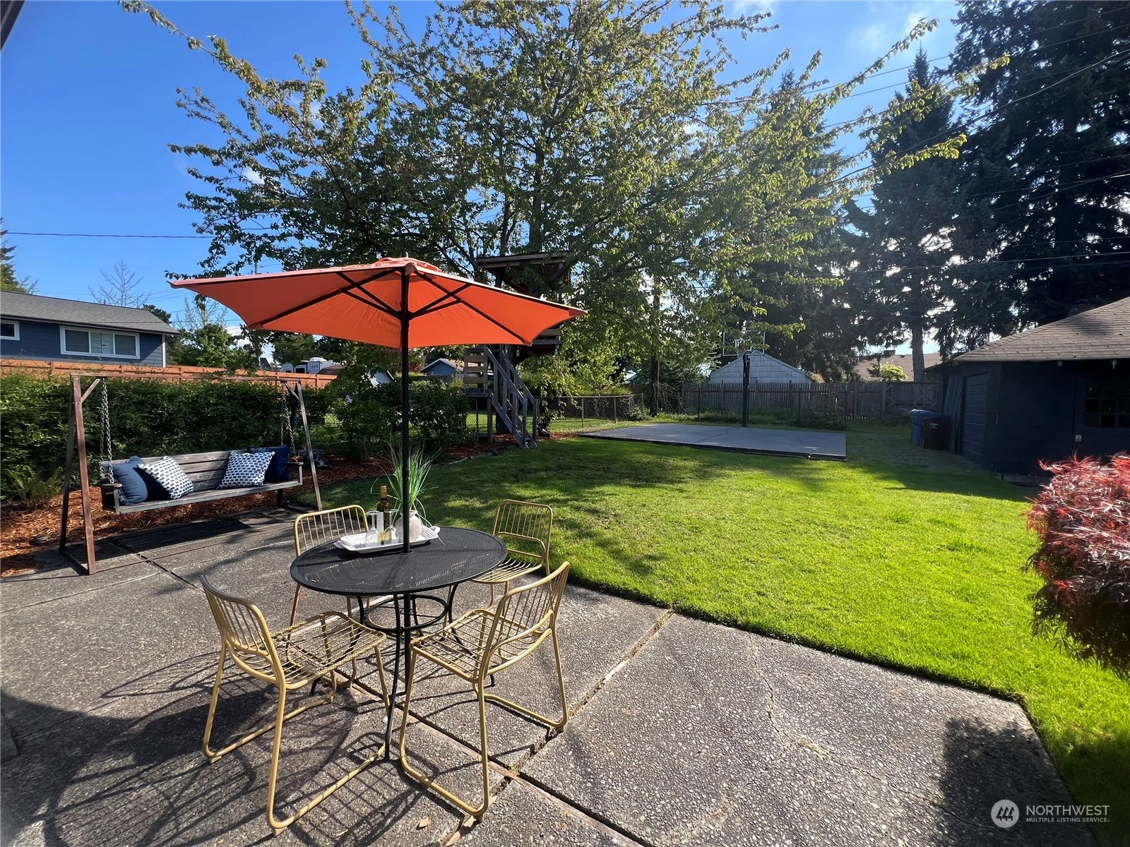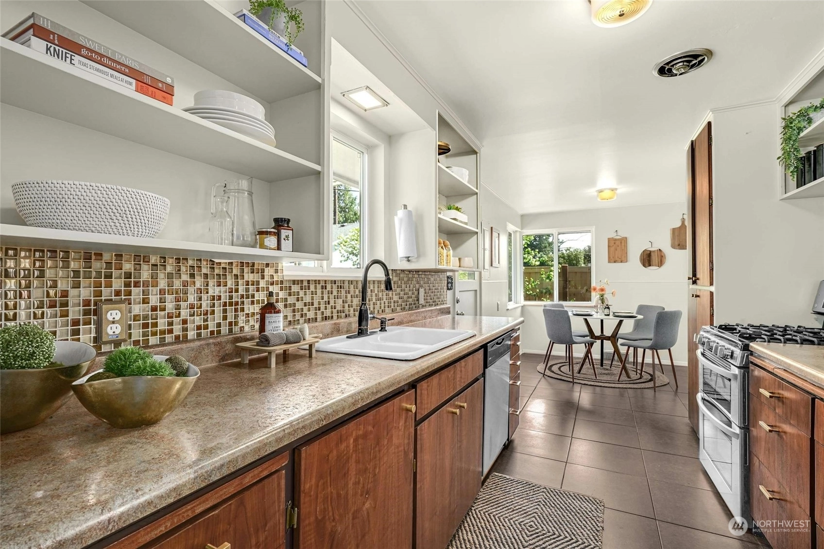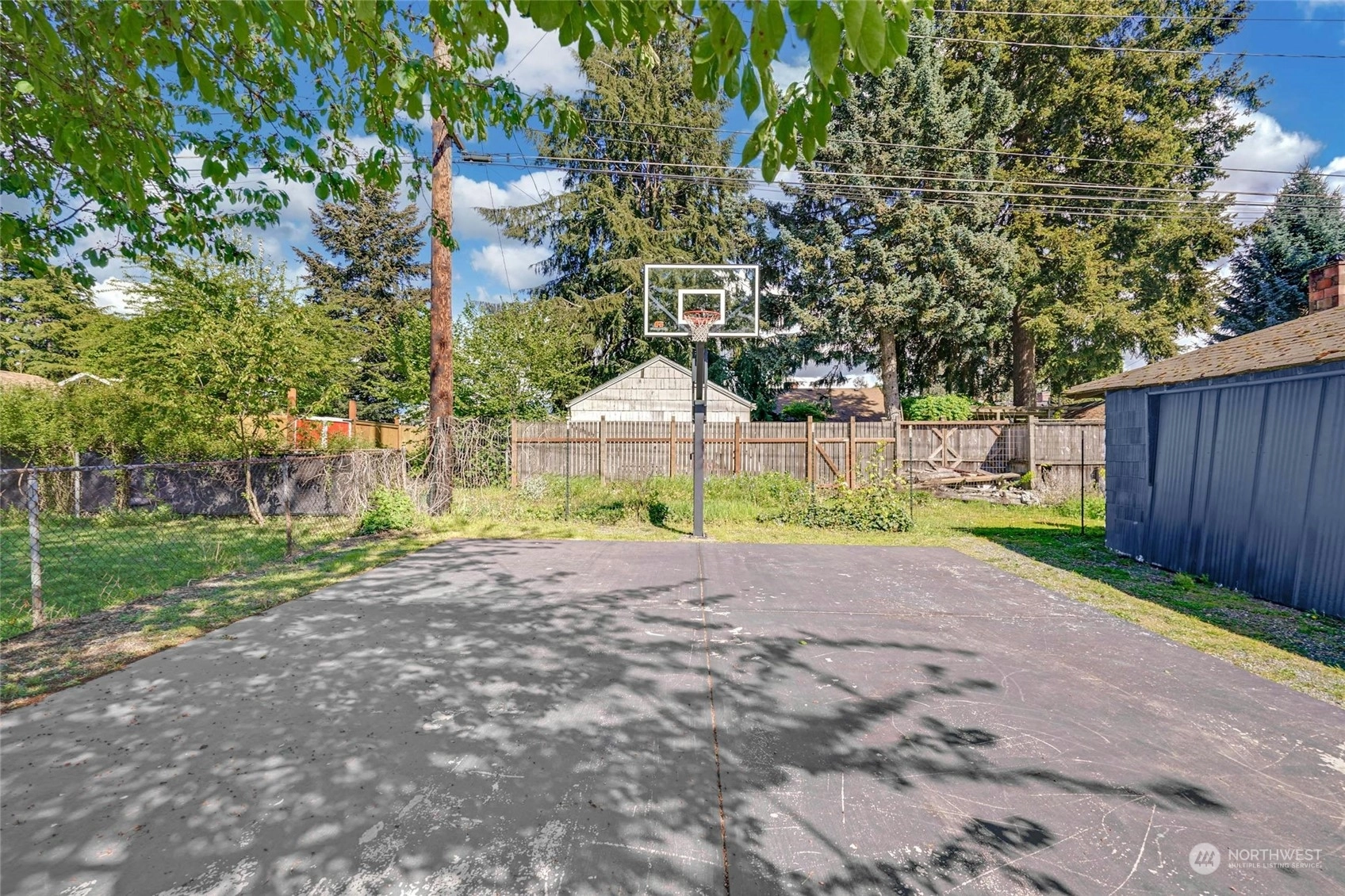 This sweet 1950's era home is nestled in a 7700 square-foot lot, where possibilities for awe and activity are endless. Some say the heart of this home are the grounds; its huge fenced backyard, garden parties, majestic cherry tree, treehouse; bespoke basketball court; detached garage; RainWise garden; & heirloom roses. See it all from the kitchen window. Others enjoy an efficient layout distinguishing 3 bedrooms from the living areas -kitchen, dining, living, and the recreation/laundry room. There's the neighborhood, where parks, beaches, buses, schools, shopping and restaurants are a short stride or drive away. Updated bathroom, windows, hot water heater & fresh paint throughout. Original hardwoods, doors, hardware, and built-ins. Dreamy.