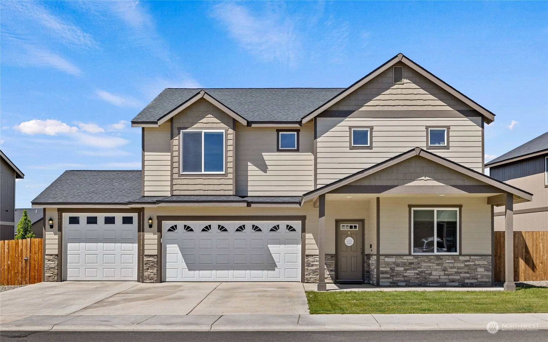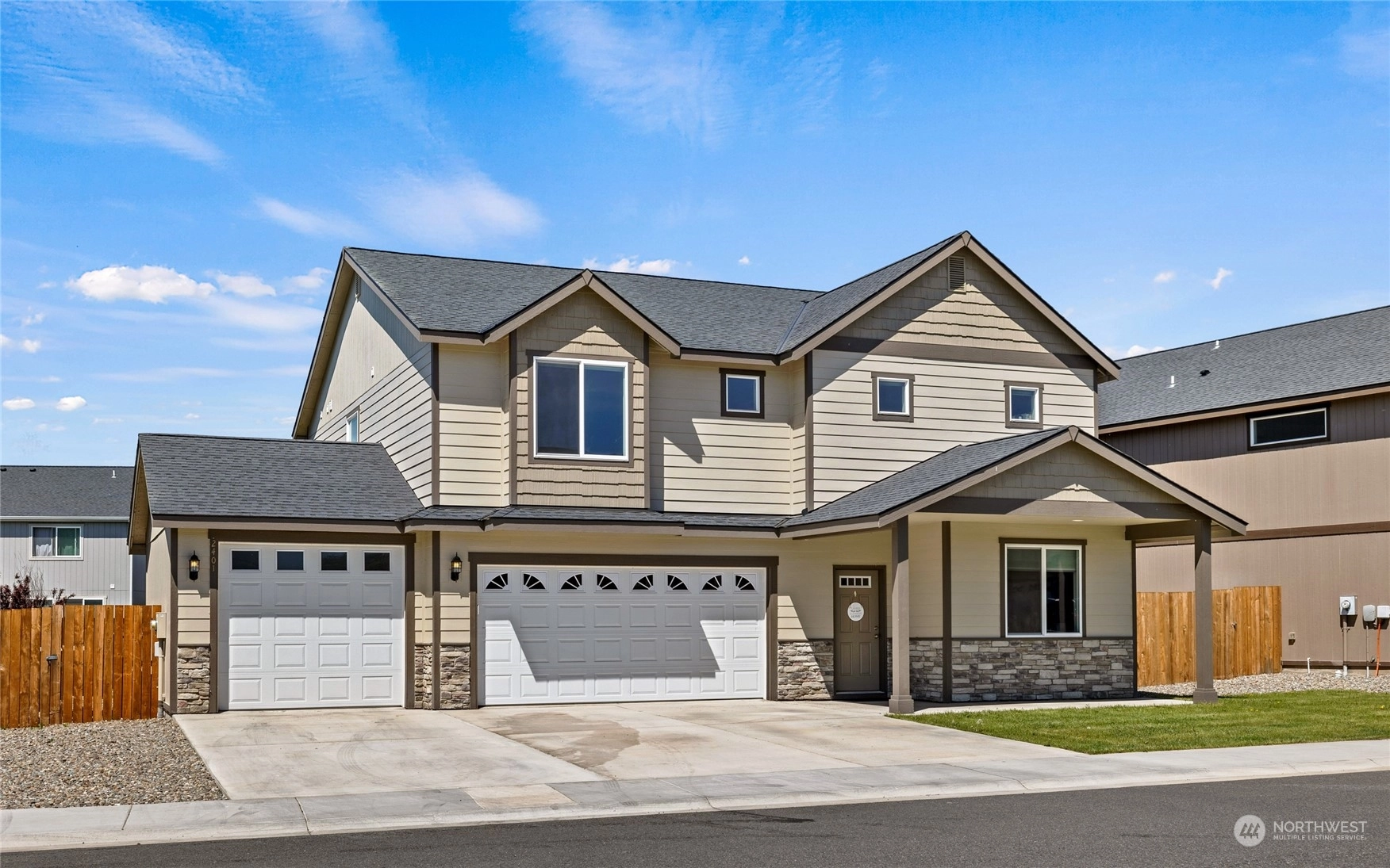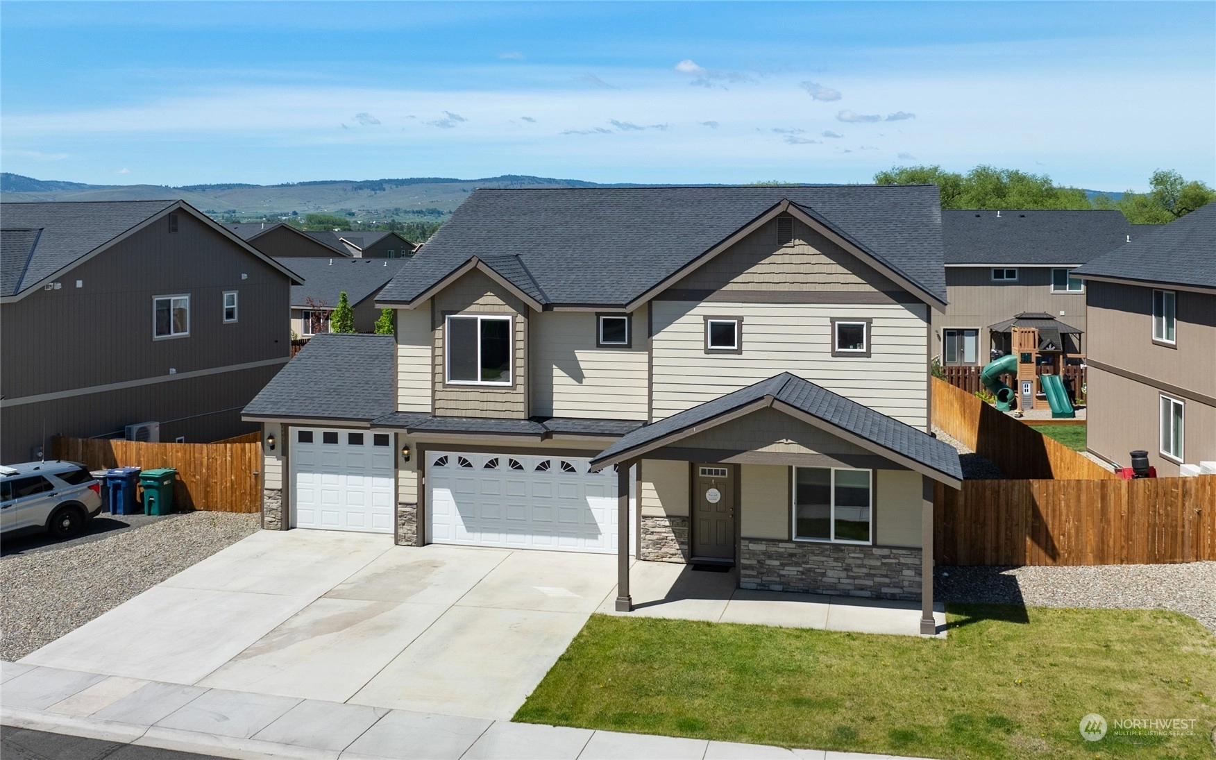 Desirable modern floor plan featuring 2,703 SqFt, 5 bedroom, 2.75 bathroom + 3 car attached garage! Bright and inviting living room & large kitchen w/ granite countertops, stainless steel appliances & breakfast bar w/ seating open to the main level living & dining room. Retreat to the spacious upper level primary suite featuring walk-in closet, soaker tub & dual vanity. Main level guest bedroom & 3/4 main level bathroom, plus an additional 3 guest bedrooms on upper level with full bathroom. Patio door leads out to a fully fenced back yard with underground sprinklers, covered lit patio area & attached 3 car garage and expansive driveway. Desirable neighborhood located w/ close proximity to schools, downtown & Palouse to Cascades Trail.